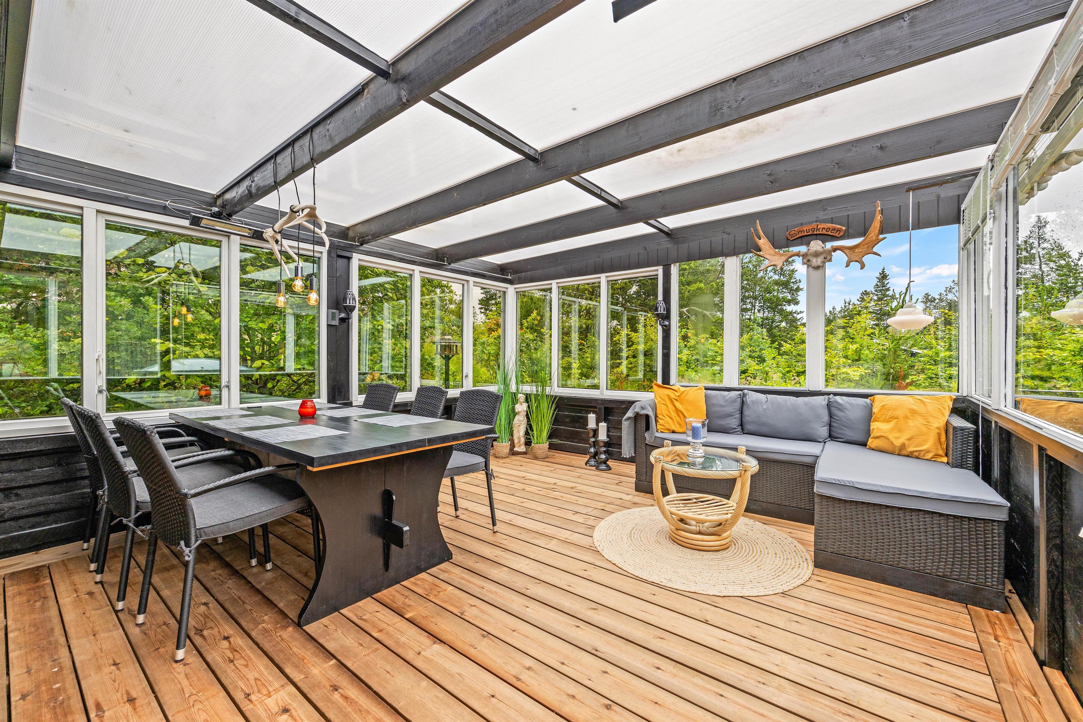 Her er det herligt at slappe af på liggestolene på den store lukkede terrasse. Og skal der grilles eller hygges udendørs, så er det perfekt med et stort overdækket og læfyldt areal, hvor skovens svampe kan sorteres før de tilberedes i køkkenet. Måske hører I også til dem, der gerne nyder aftenstemningen med spil og sang og som nyder at kunne dække op til grillmad, selv når vejret egentligt ikke spiller helt med.