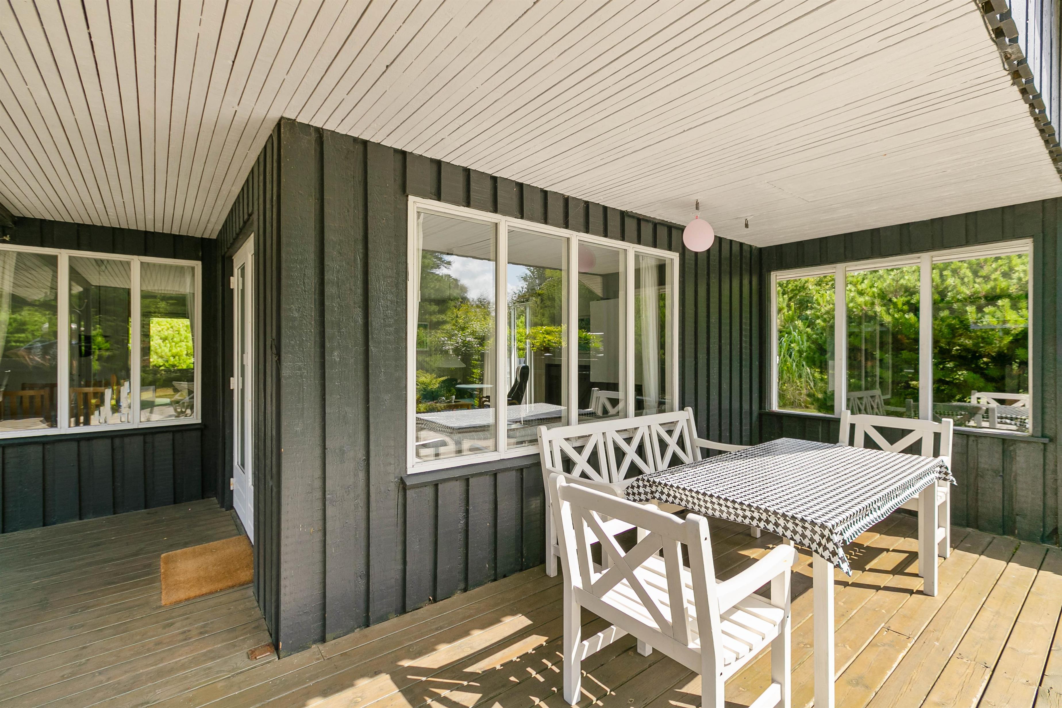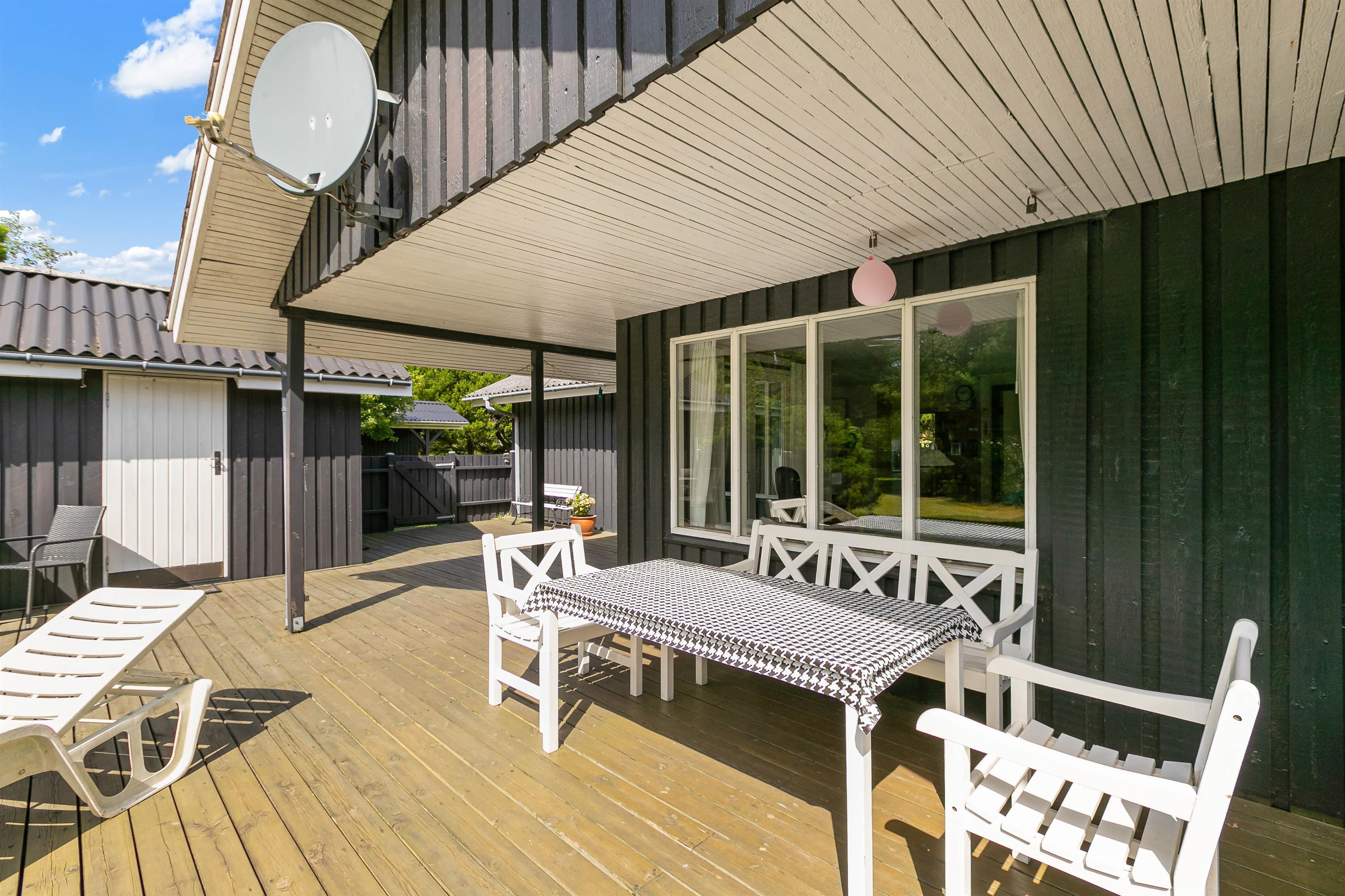 Fra stuen er der direkte udgang til terrassen, som giver jer mulighed for at sidde ude i næsten al slags vejr med en overdækket del, som er oplagt til de gode grillaftener. Terrassen fortsætter et godt stykke rundt om huset og giver jer masser af muligheder for at nyde solen og finde læ-steder, uanset hvor vinden skulle komme fra.