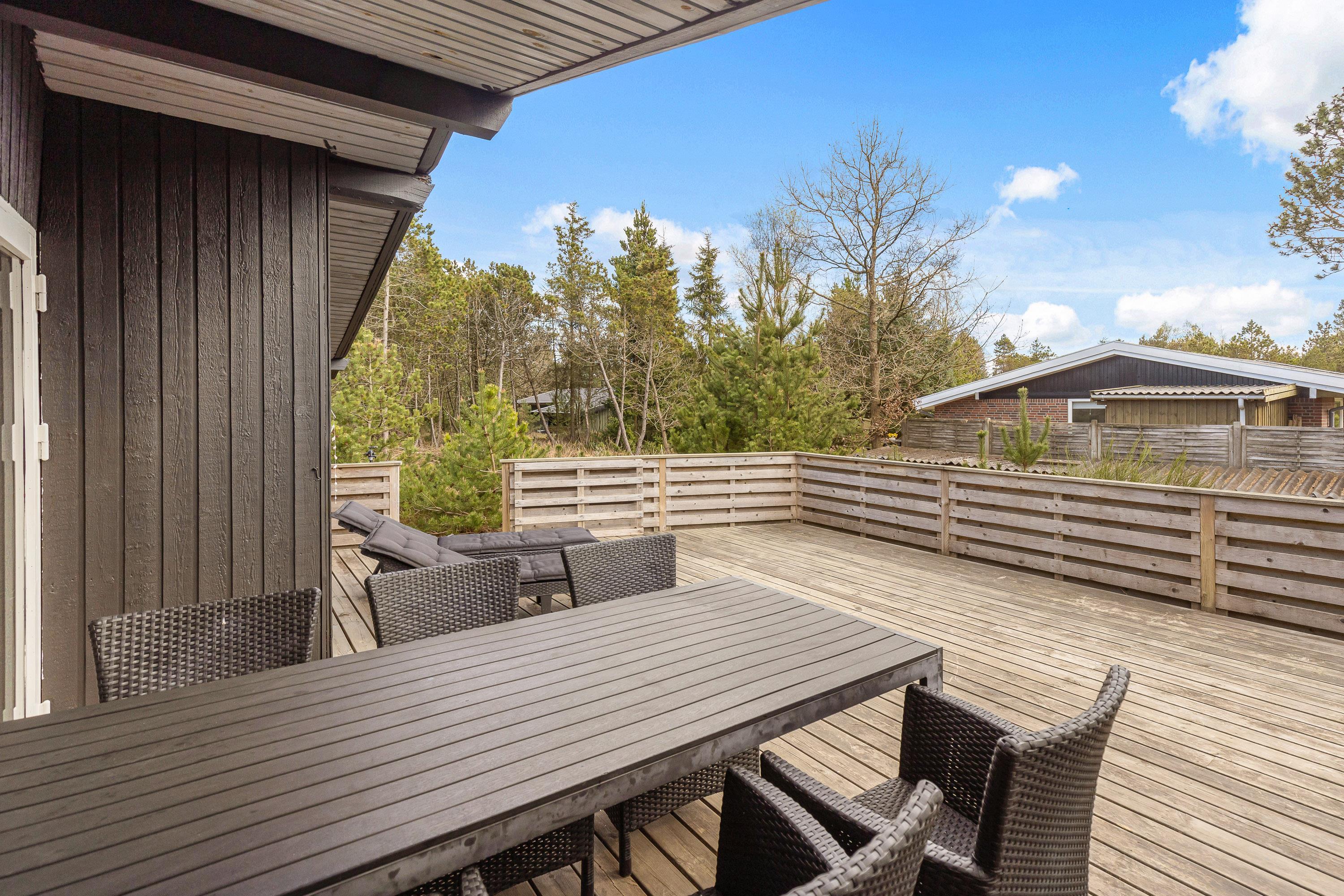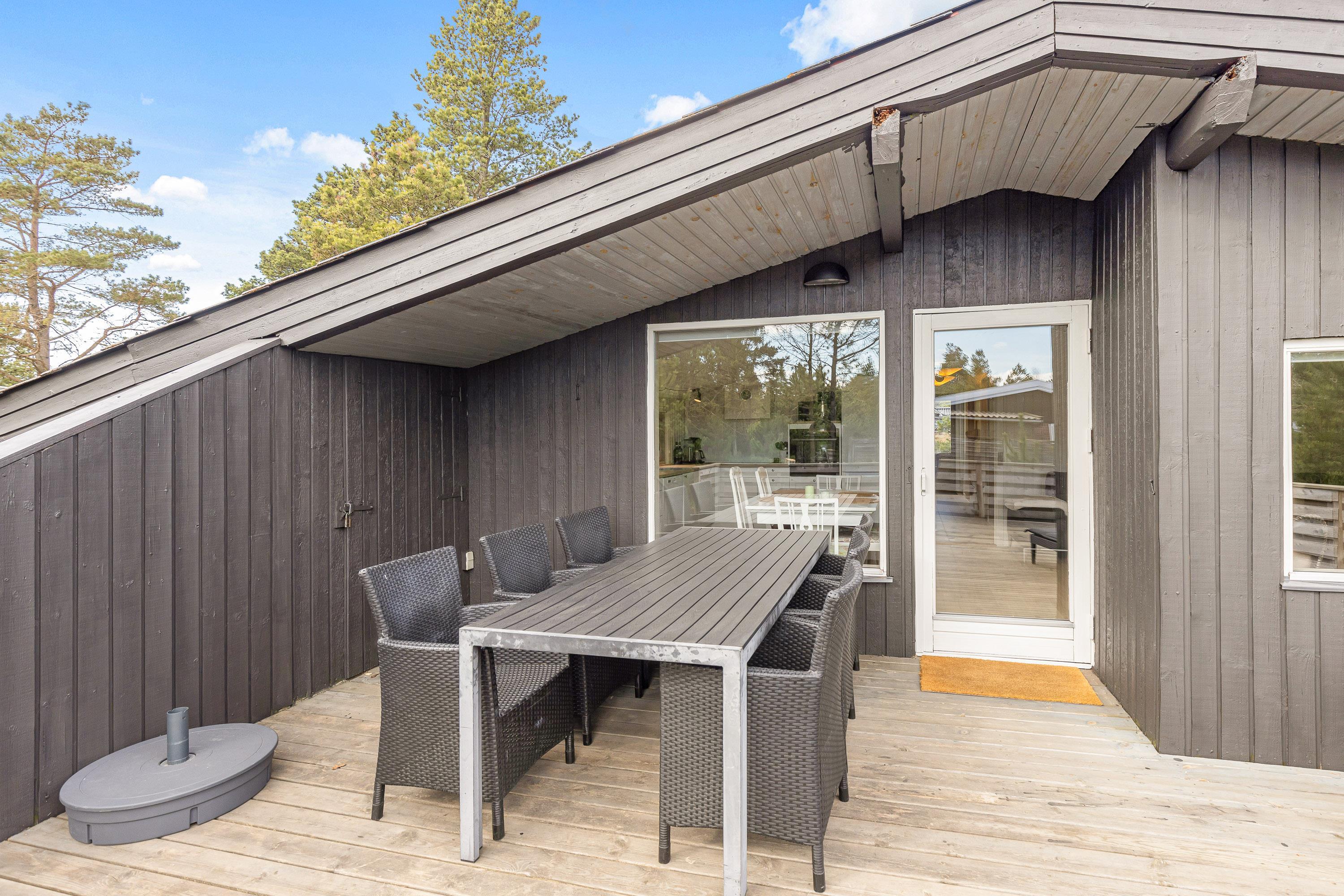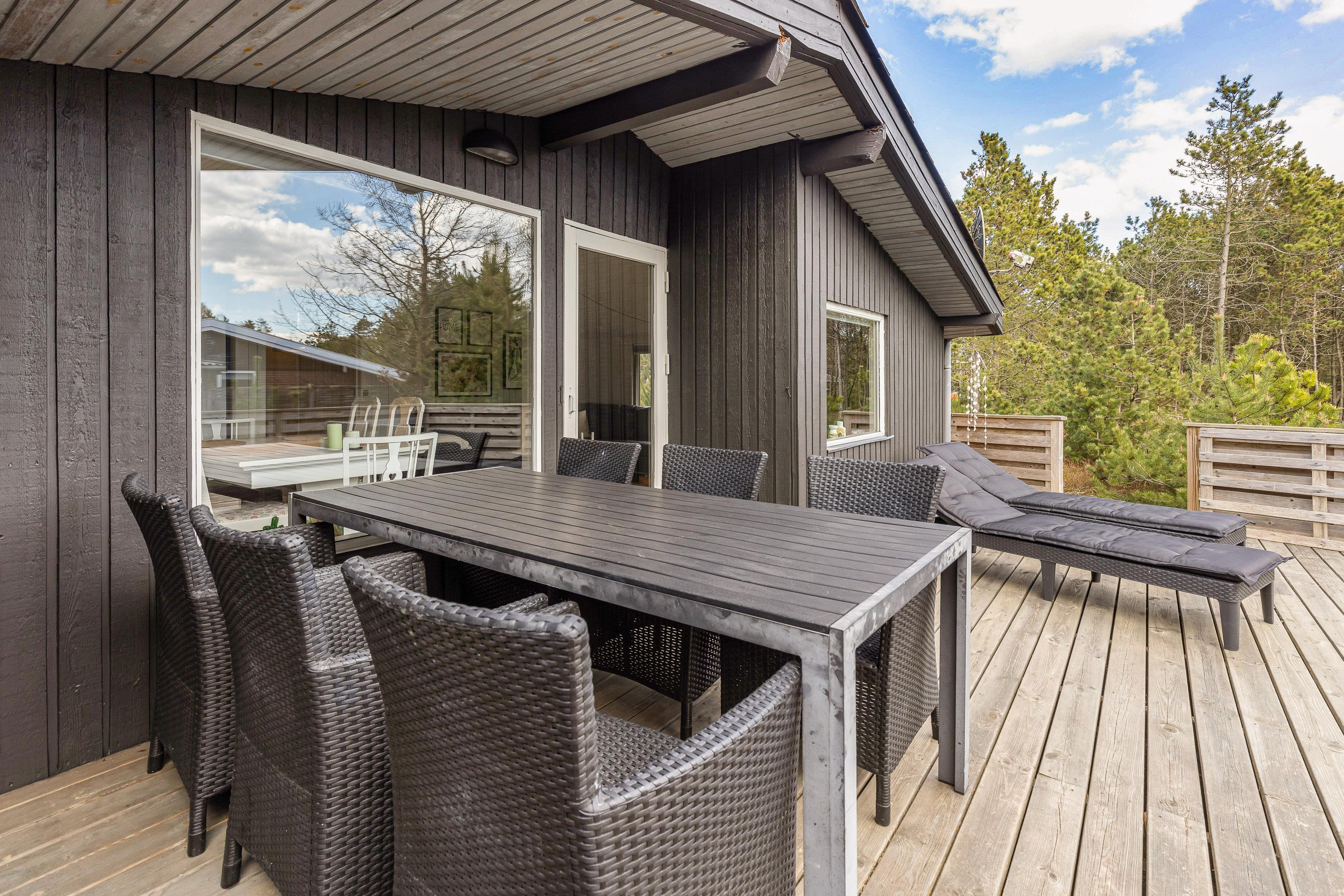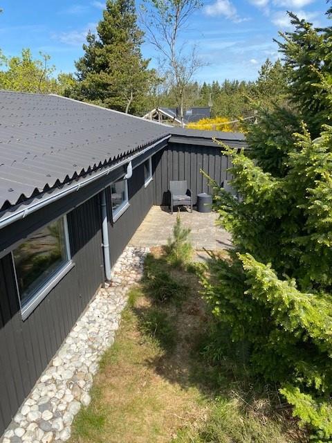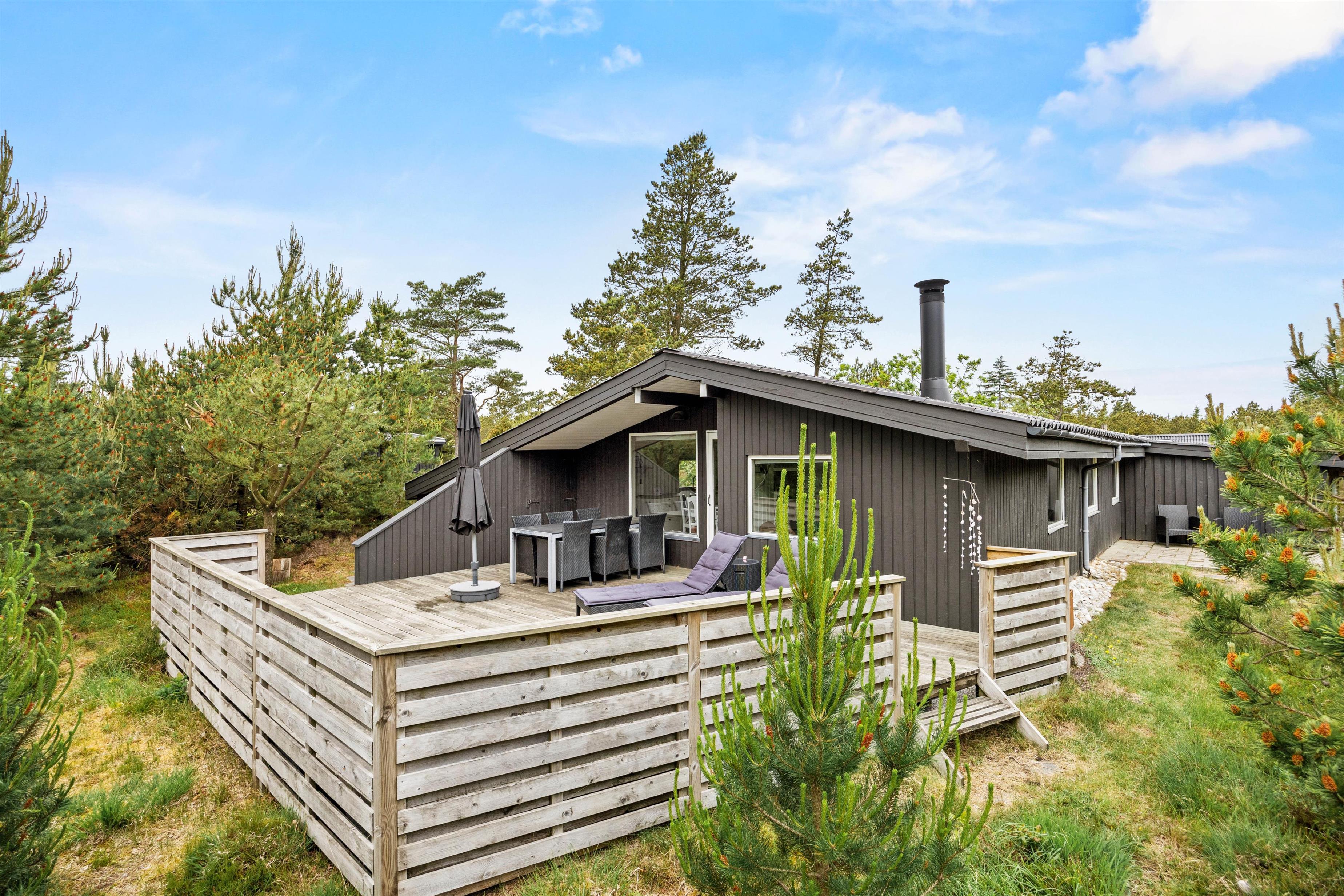 Feriehuset har selvfølgelig også et dejligt udeområde og er omringet af høje træer. Terrassen som er afskærmet, ligger bag feriehuset, så I kan være udenfor i fred og ro. Terrassen er veludstyret, med gode havemøbler, solvogne og en grill, så I har mulighed for at tilberede jeres aftensmad på den. Er solen for skrap er der også sørget for en parasol, som I kan søge ly under.