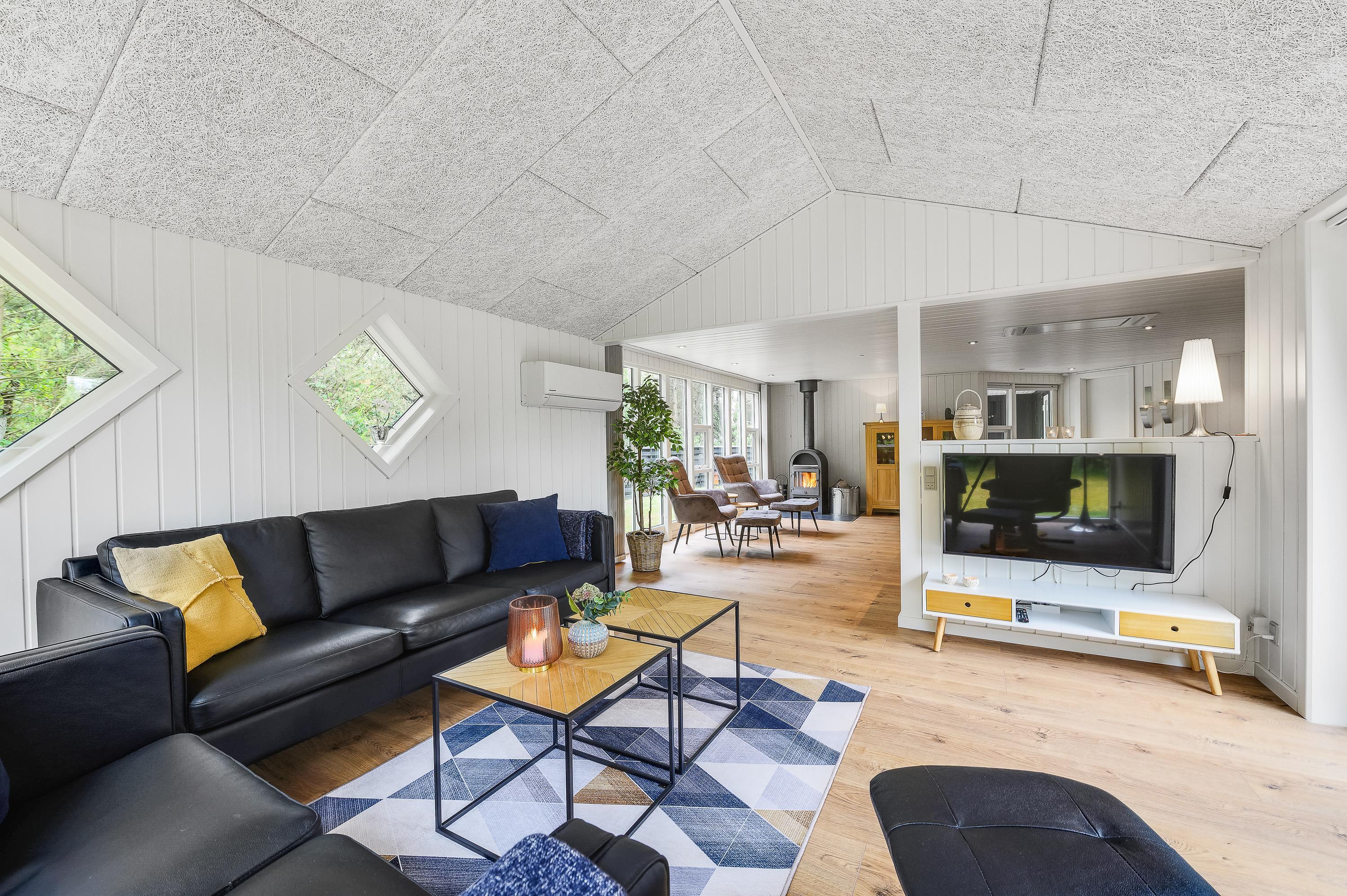 Dette totalrenoverede sommerhus i Houstrup er et oplagt valg til en aktiv familieferie. Her kan I holde ferie midt i den grønne natur – i et moderne og hyggeligt feriehus med et stort aktivitetsrum, et skønt uderum med flere gode terrasser samt en velholdt have med legeplads.