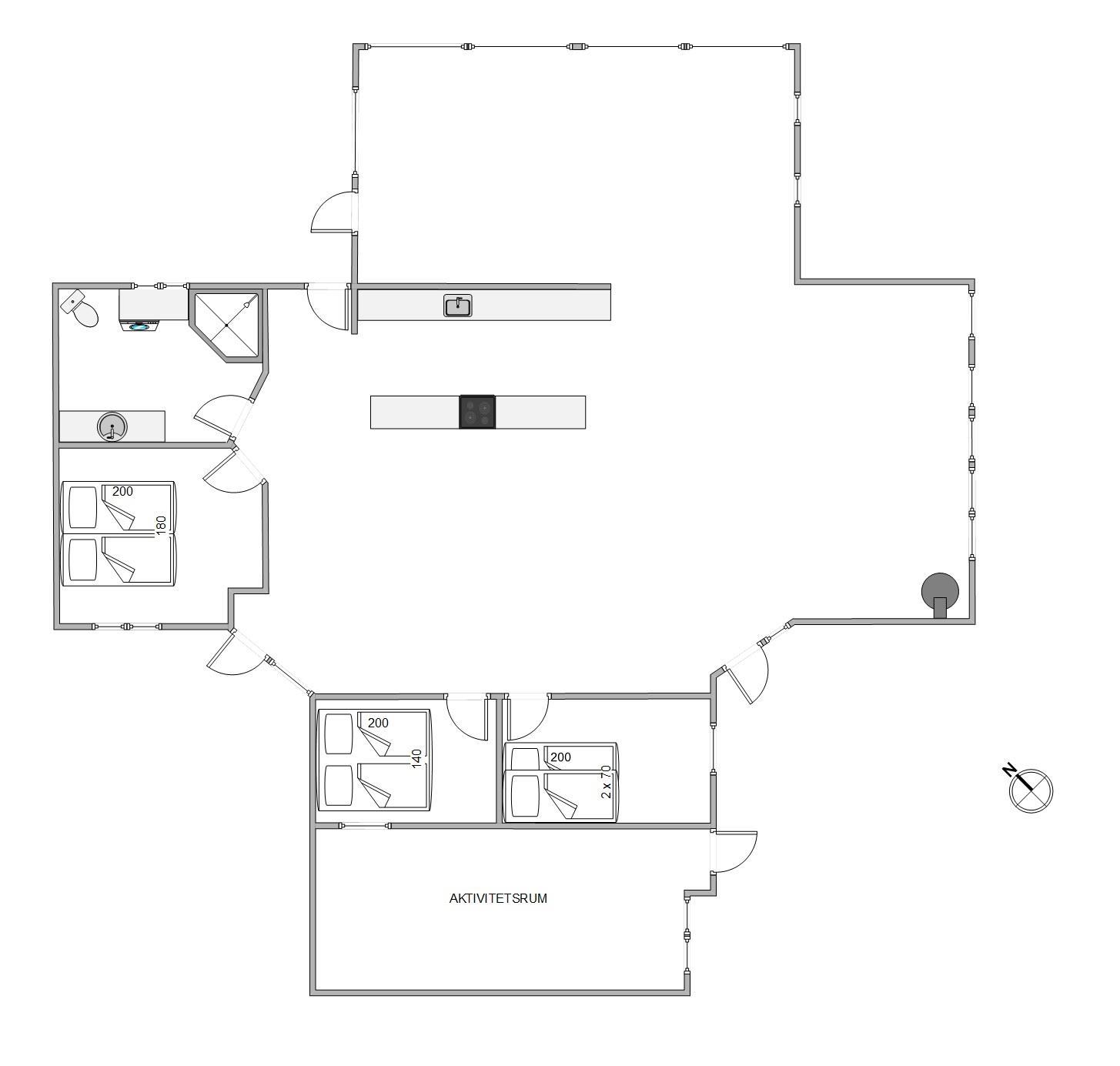 Aktivitetshuset på Fyrrekrogen 1 rummer plads til 6 personer og har i 2020 gennemgået en omfattende renovering fra ende til anden. Indretningen byder på et velafstemt miks mellem moderne og hyggeligt, og de store vinduespartier sørger for et skønt lysindfald og et udsyn til den omkringliggende natur.