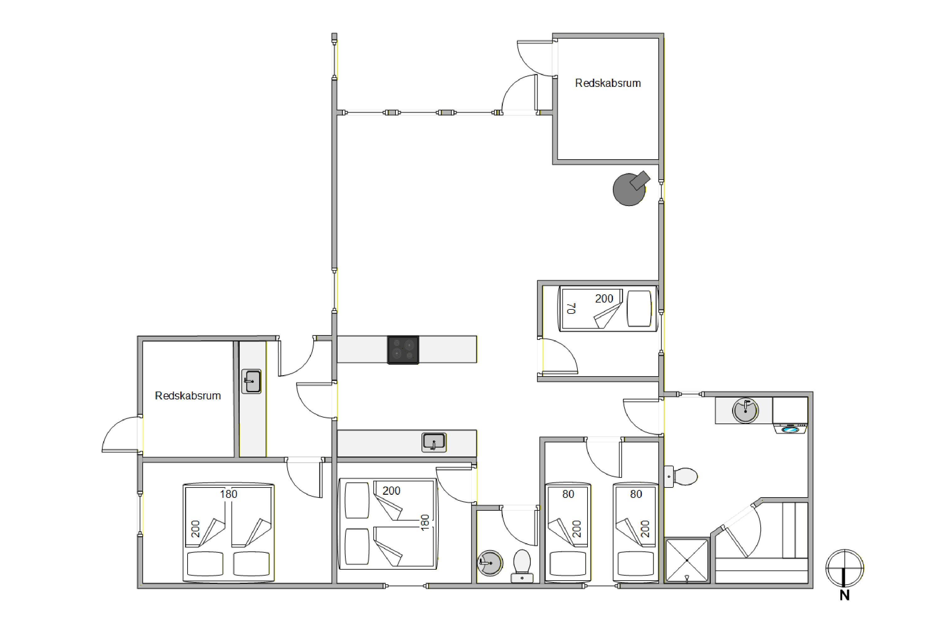 Det dagslysfyldte badeværelse, renoveret i 2025, har gulvvarme samt vaskemaskine og tørretumbler. Et ekstra gæstetoilet gør hverdagen mere afslappet. Sommerhusets sauna inviterer til lange saunagange, og fra april til november kan I benytte udendørsbruseren til en forfriskende afkøling efter saunaturen.