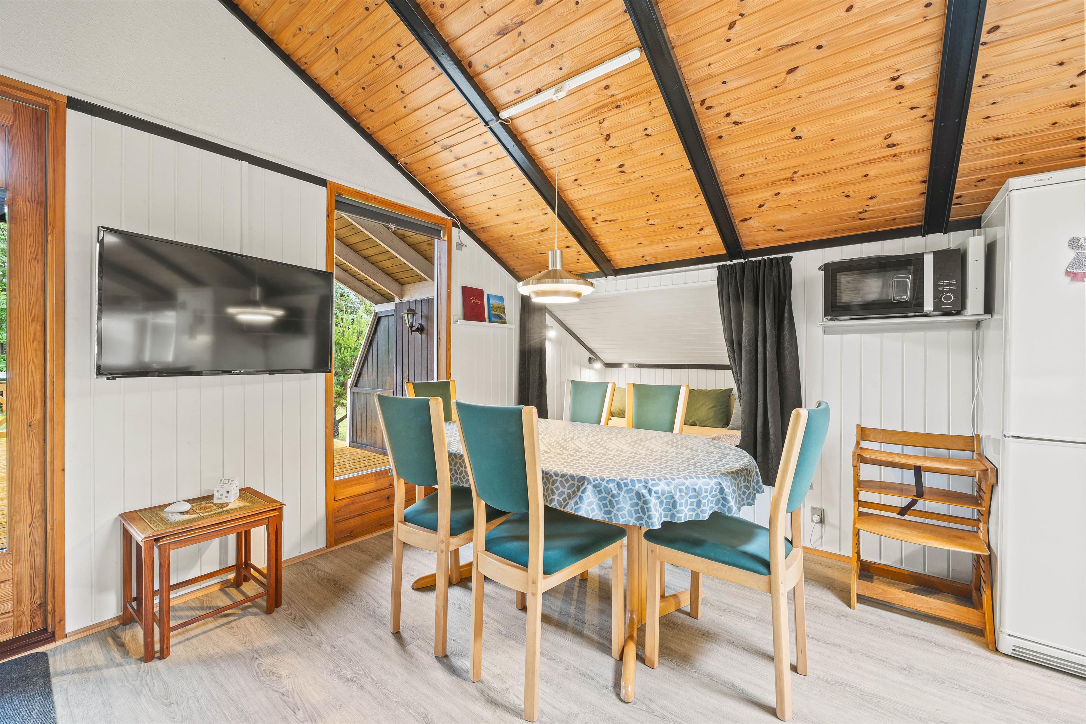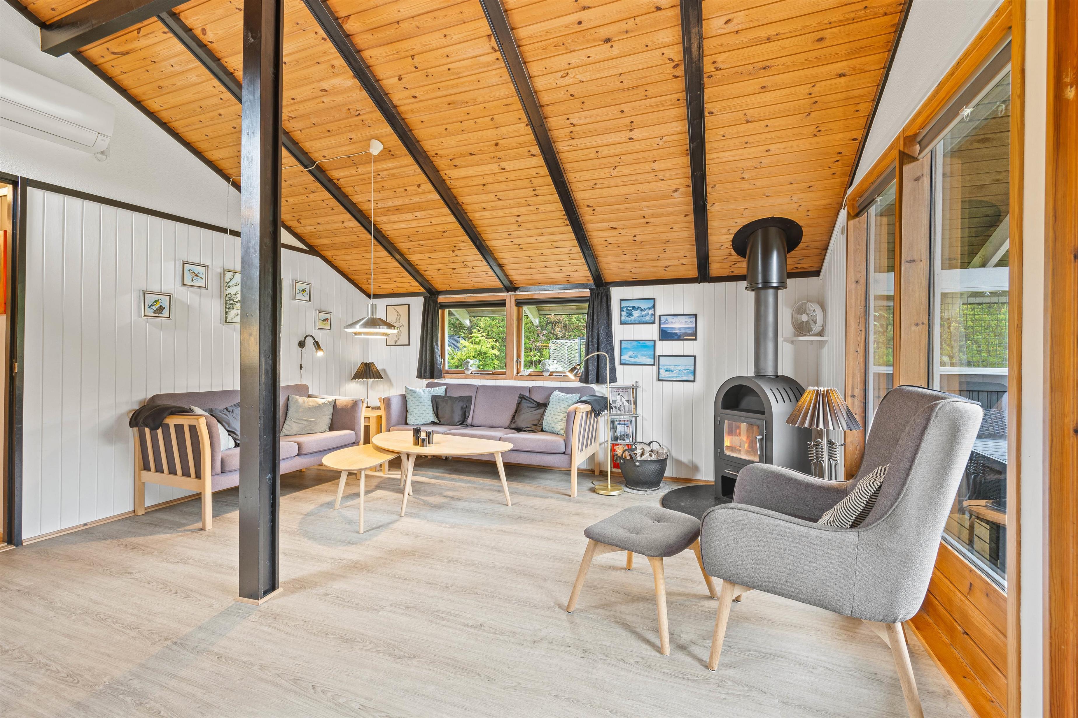 Stuen rummer en hyggelig brændeovn og en luft til luft varmepumpe, der sikrer et behageligt klima, uanset årstiden. Her kan der hygges med spil og samtaler, eller I kan sidde og nyde varmen fra brændeovnen med en god bog.