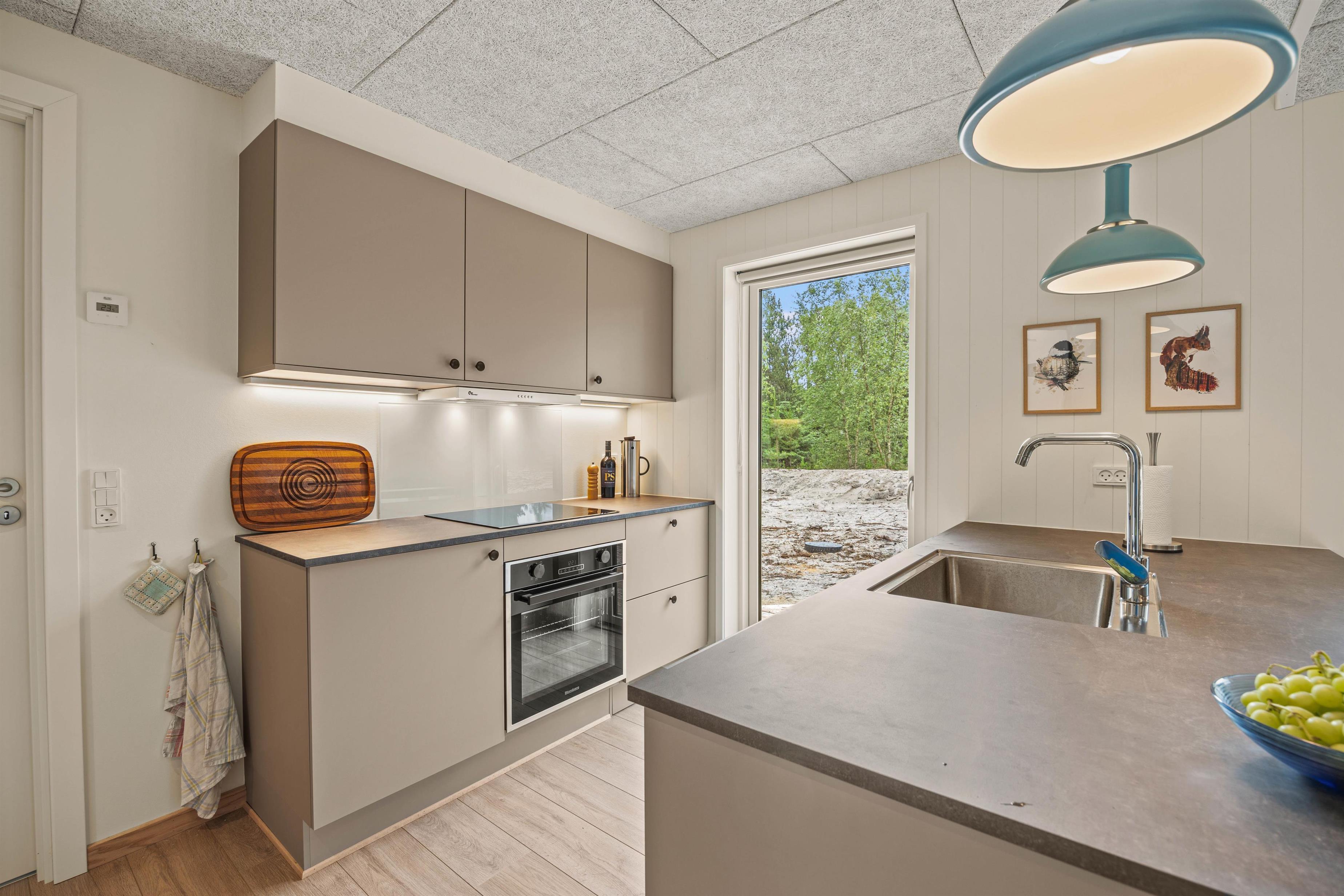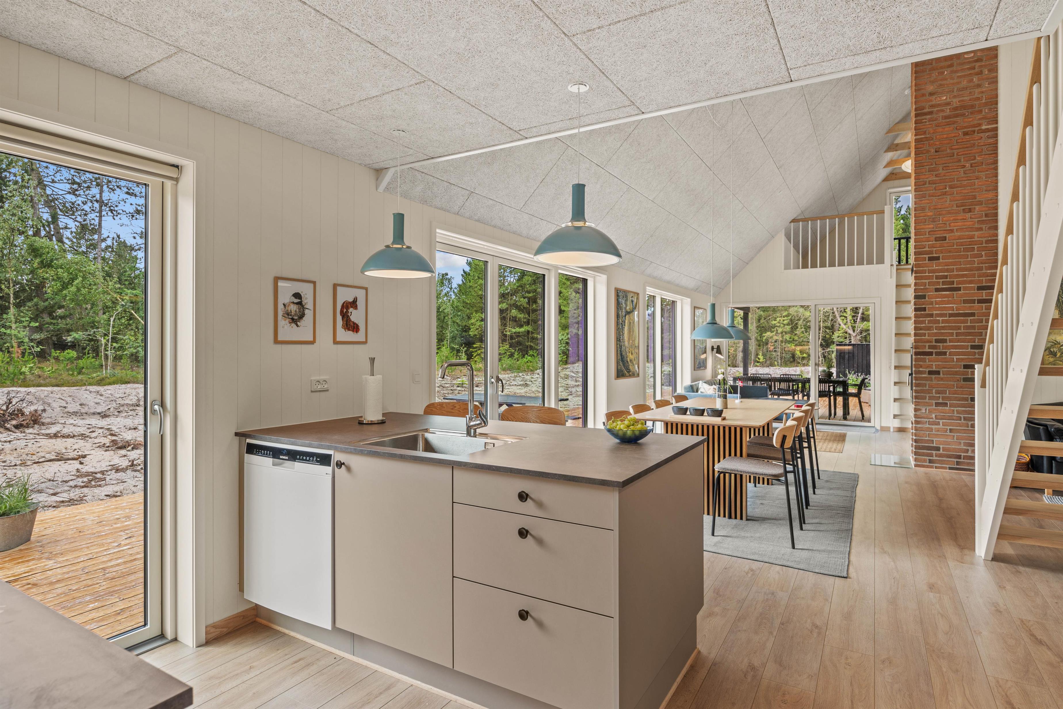 Sommerhuset byder indenfor med et lyst og indbydende design, hvor funktionalitet møder stil. I køkkenet finder I en opvaskemaskine, der gør det hurtigt og nemt at rydde op efter måltiderne, så I kan bruge mere tid på at slappe af eller udforske Vestkysten.