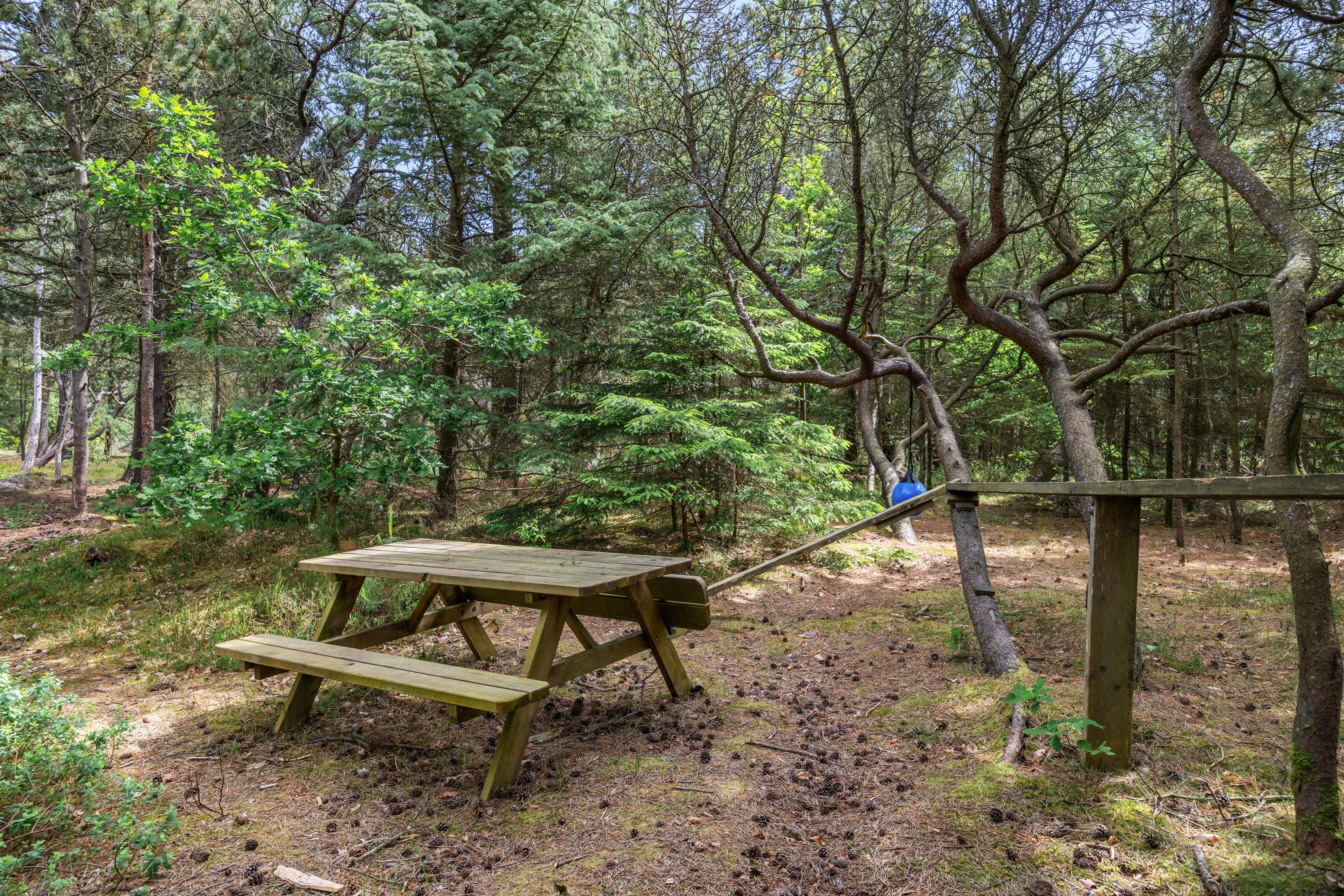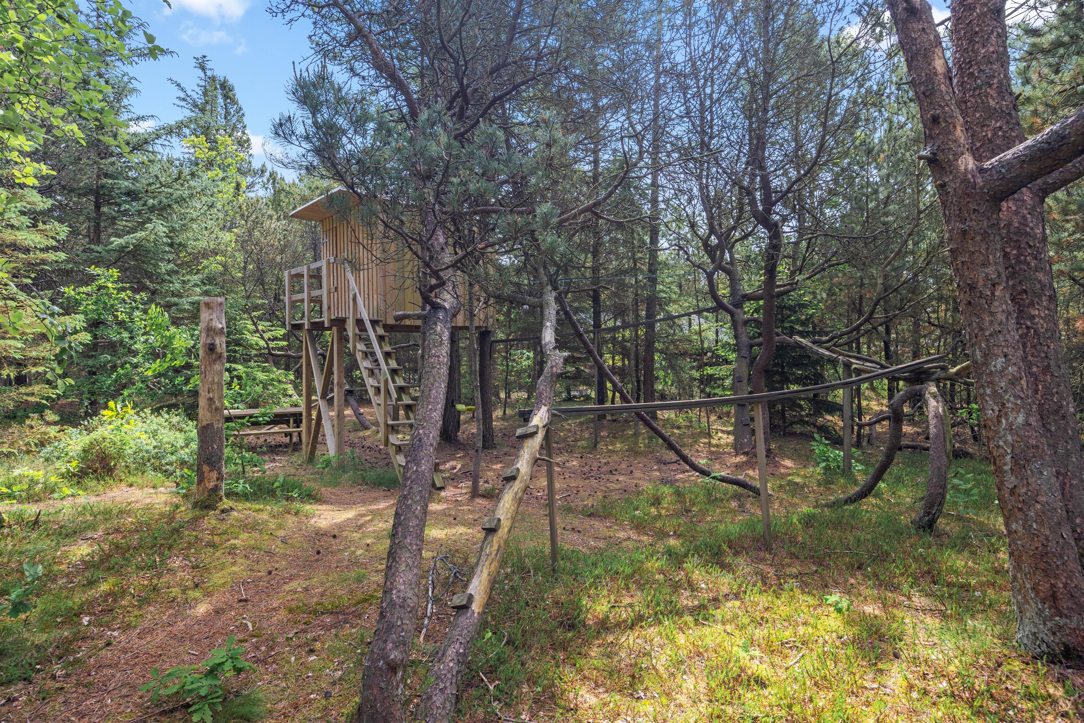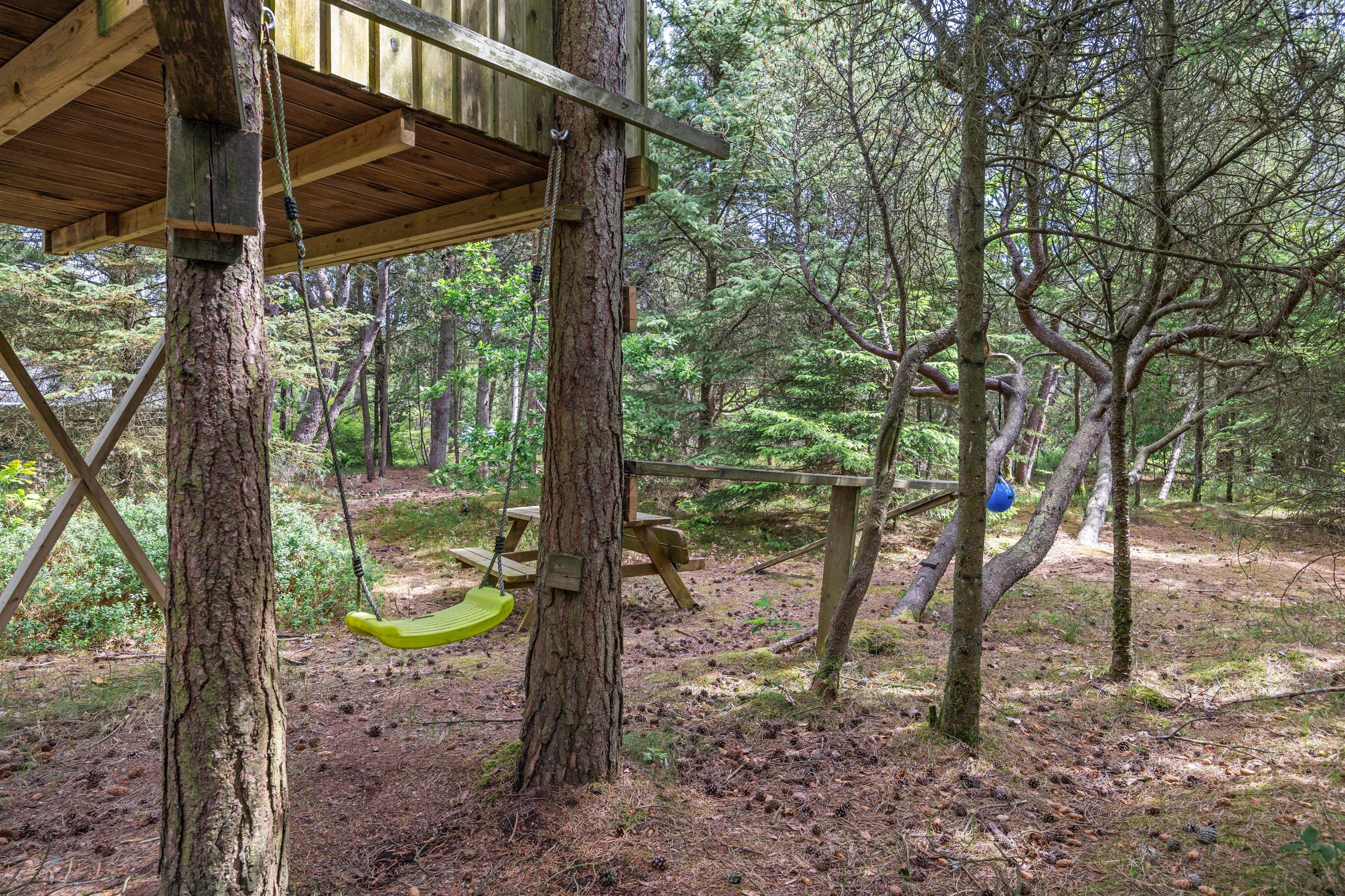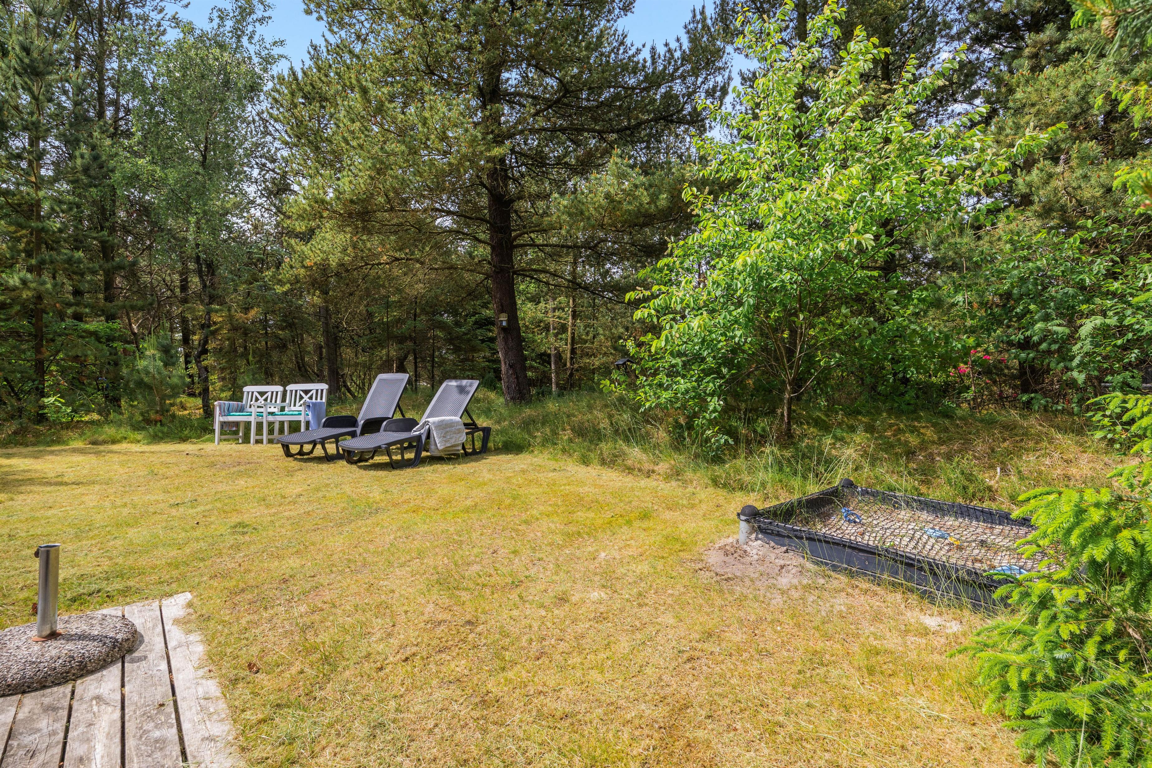 Sommerhuset er placeret på en 1337 kvadratmeter stor naturgrund, som er omgivet af høje træer. Her er masser af plads til at boltre sig for både store og små. På matriklen finder I også en sandkasse, gynge og et legehus, hvor yngre børn bestemt kan bruge mange timer på leg. Imens kan de voksne sætte sig under halvtaget på terrassen og nyde den friste brise i de behagelige havemøbler, eller slappe af på en liggestol på åbne terrasse. Hen ad dagen kan I tænde op i grillen og lave et udsøgt feriemåltid, som kan nydes i det bedste selvskab.