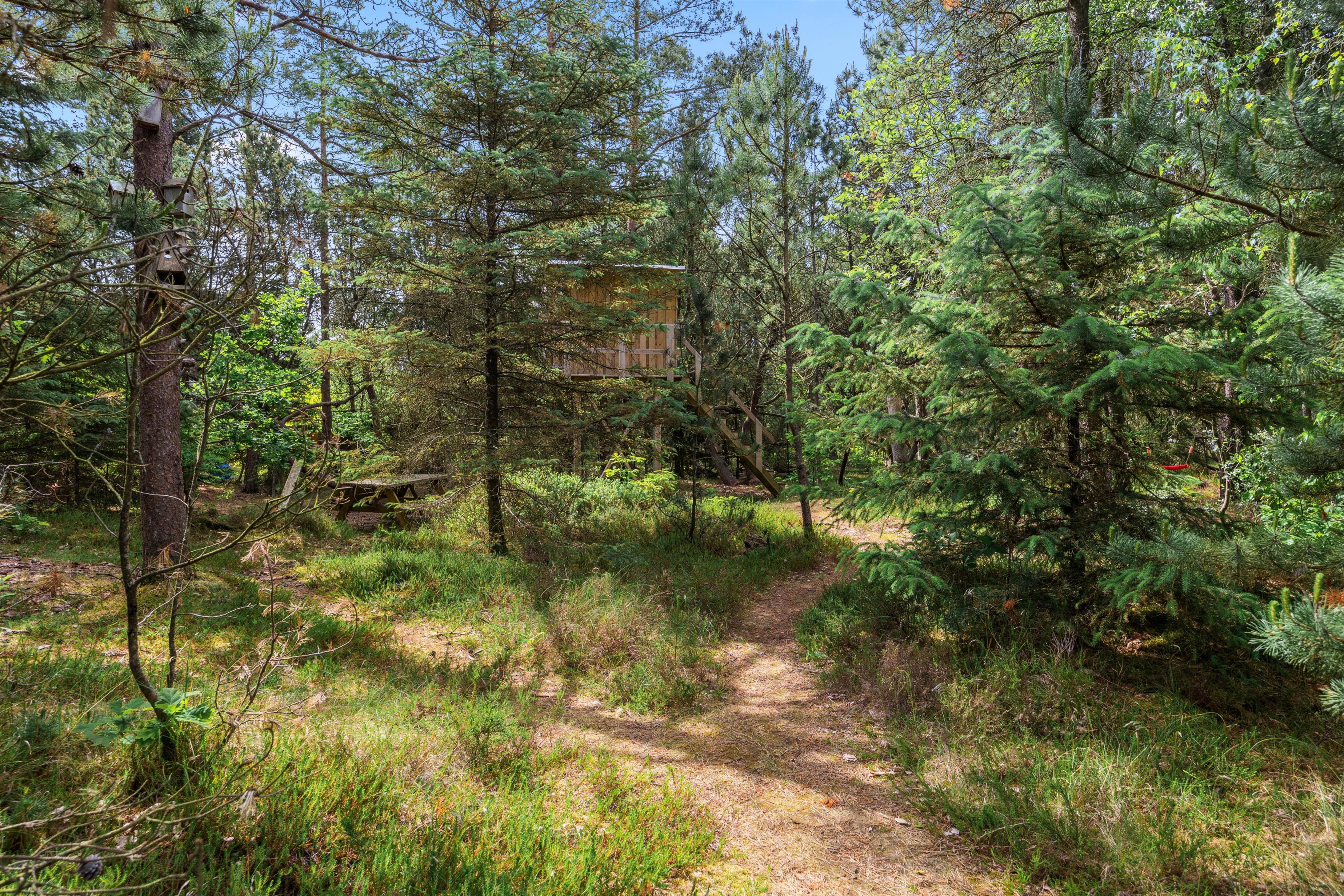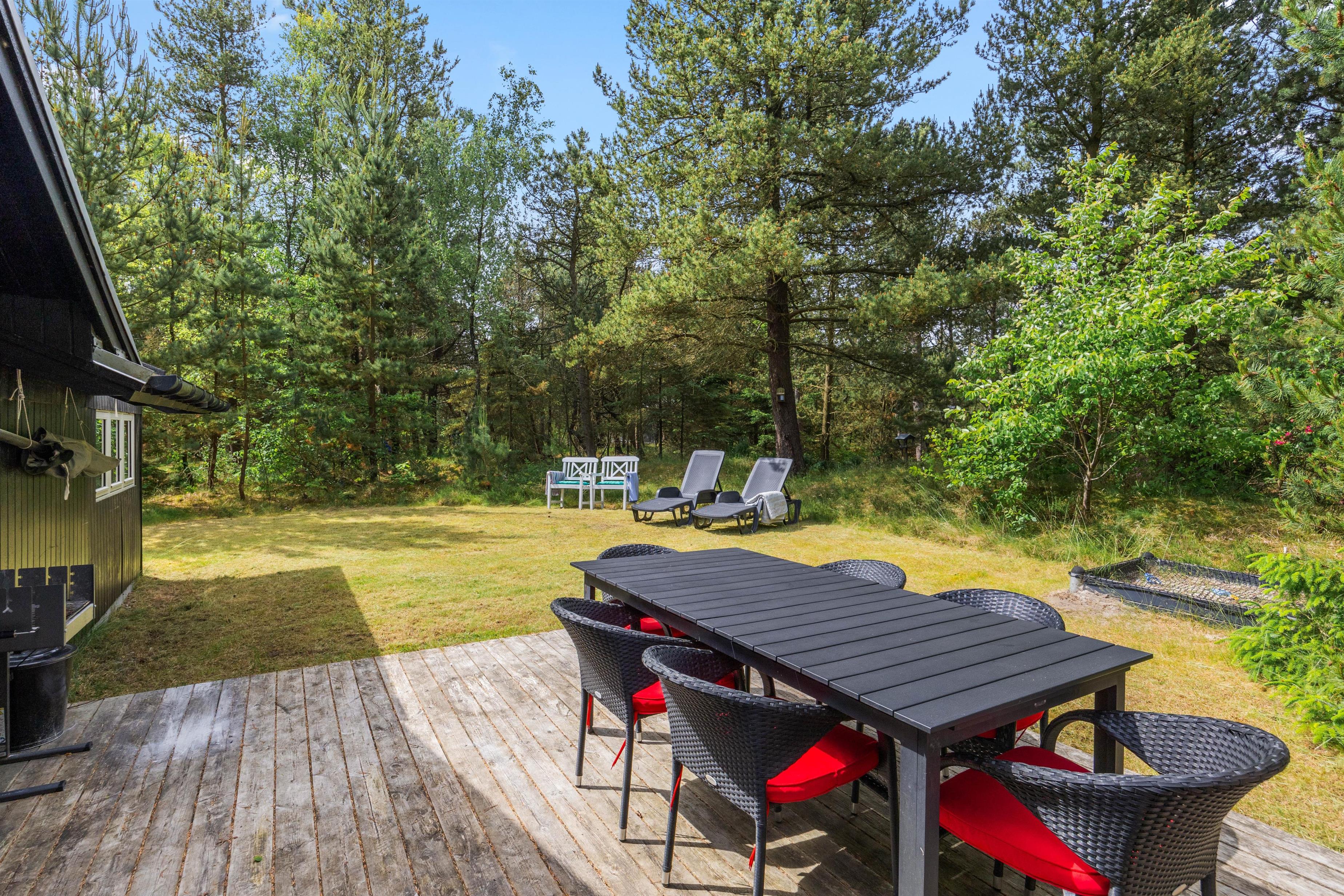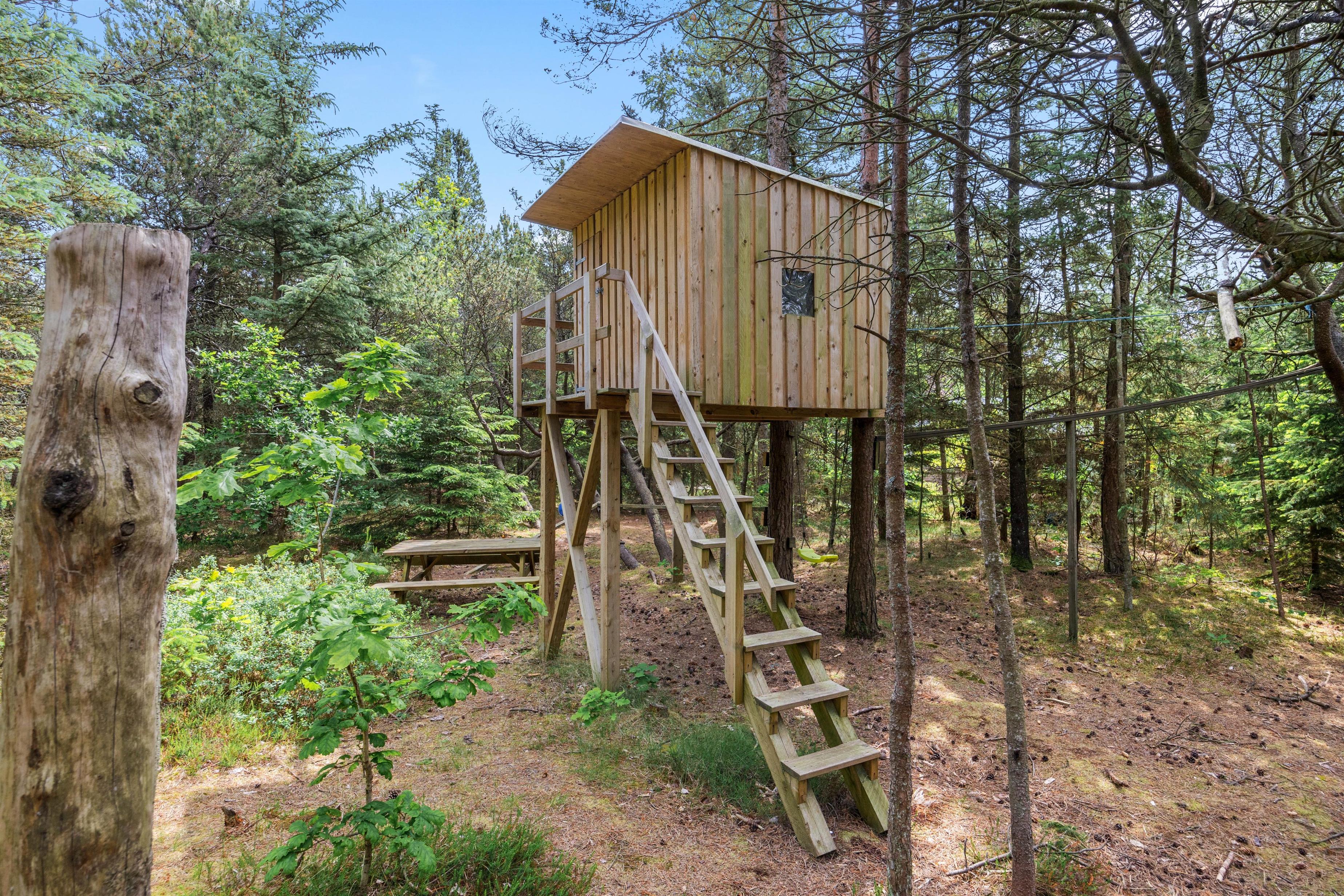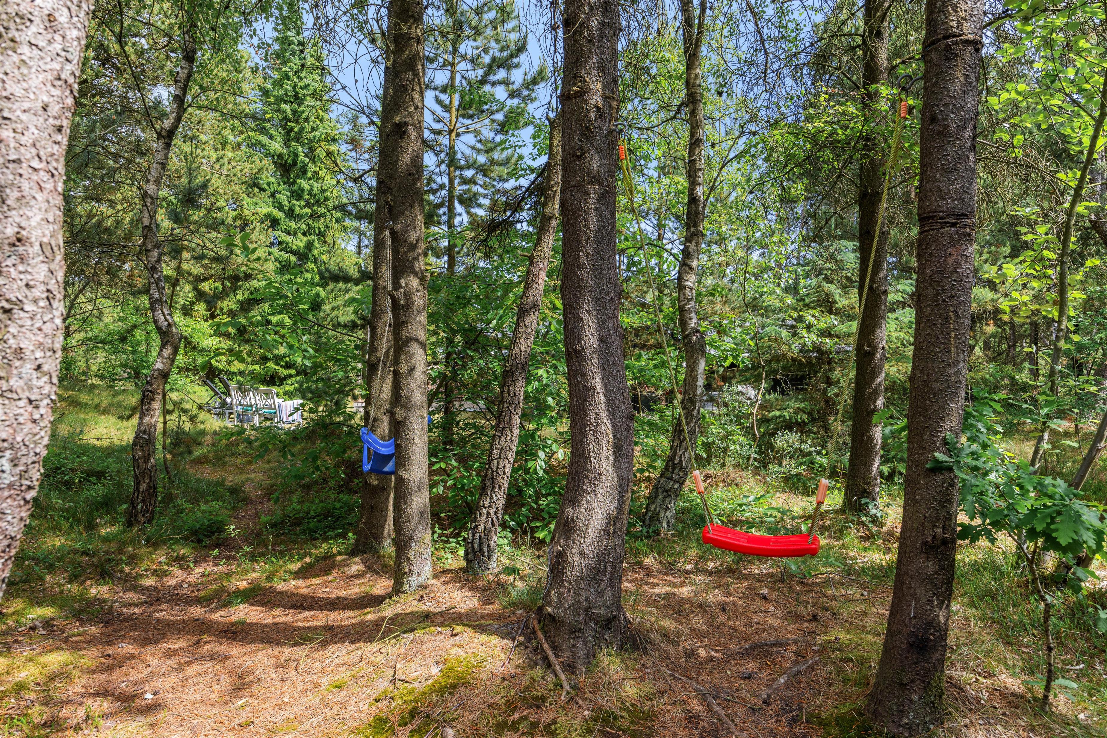 Sommerhuset er placeret på en 1337 kvadratmeter stor naturgrund, som er omgivet af høje træer. Her er masser af plads til at boltre sig for både store og små. På matriklen finder I også en sandkasse, gynge og et legehus, hvor yngre børn bestemt kan bruge mange timer på leg. Imens kan de voksne sætte sig under halvtaget på terrassen og nyde den friste brise i de behagelige havemøbler, eller slappe af på en liggestol på åbne terrasse. Hen ad dagen kan I tænde op i grillen og lave et udsøgt feriemåltid, som kan nydes i det bedste selvskab.