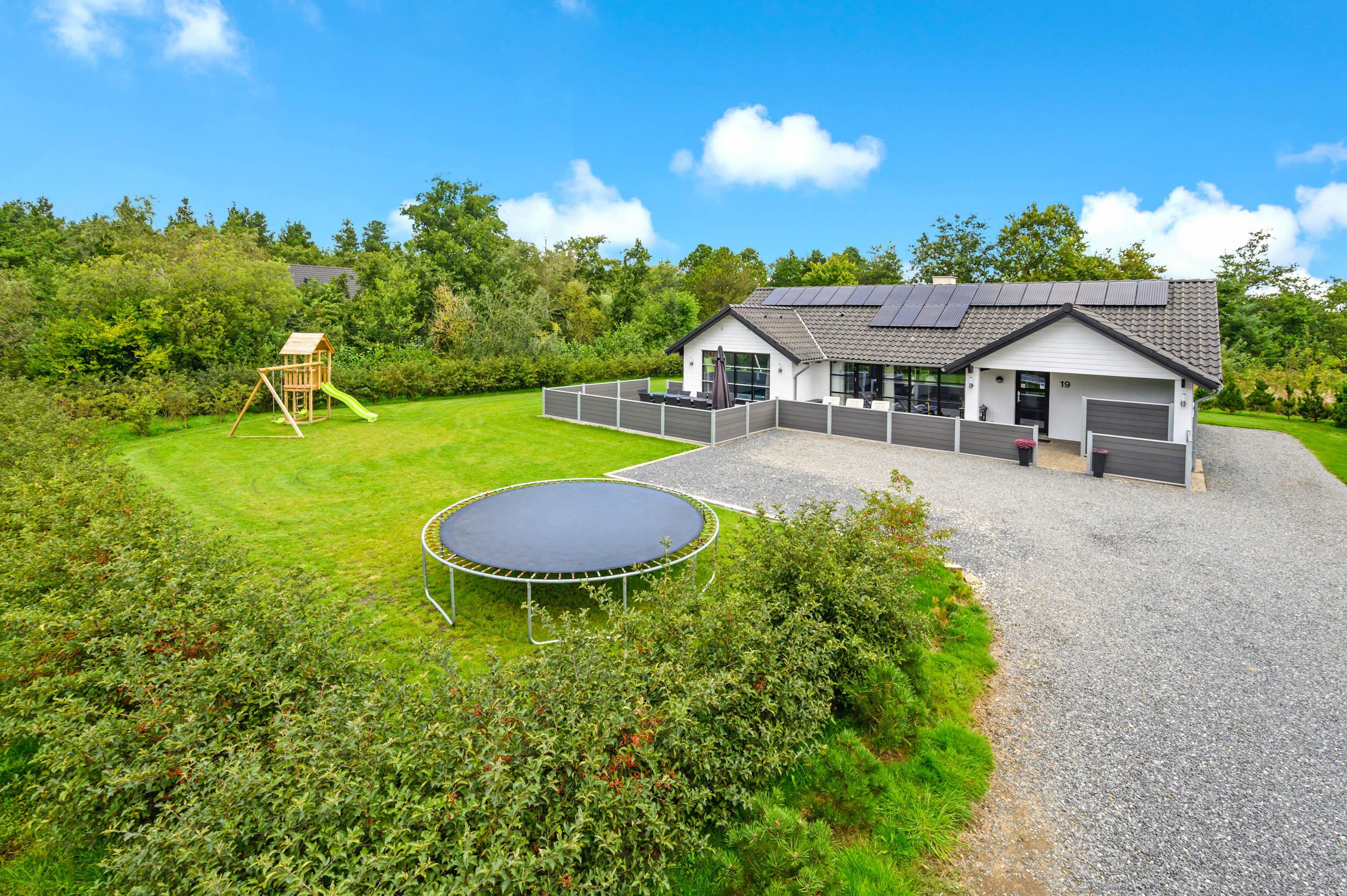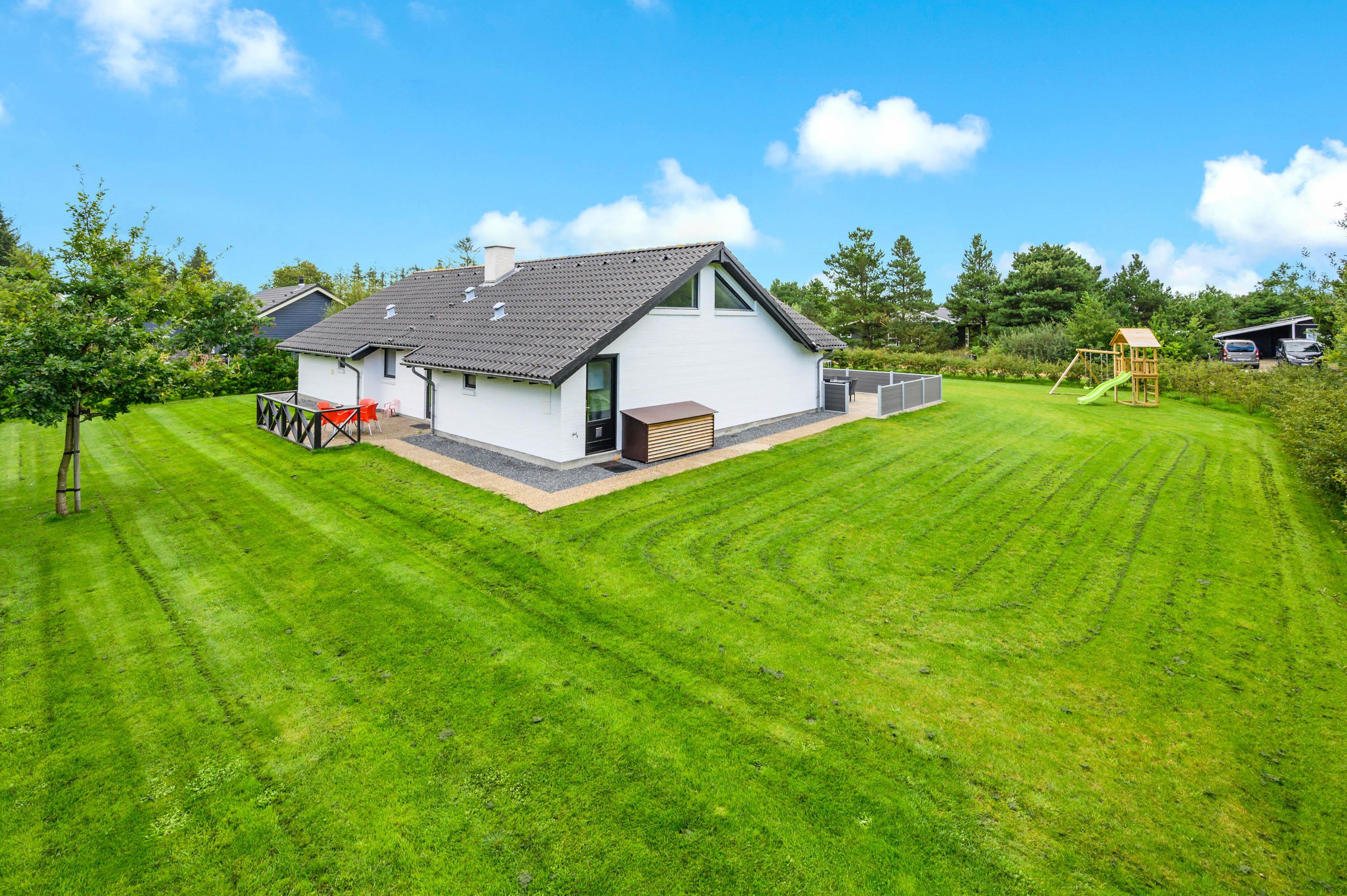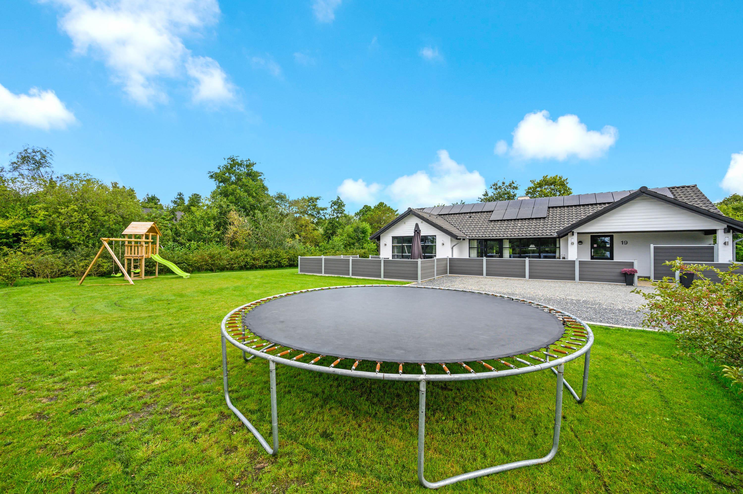 Udenfor finder I en stor indkørsel og en god, åben terrasse. Her står havemøblerne og grillen allerede klar, så I kan holde en hyggelig grillaften i det fine sommervejr. Der er ikke kun plads til afslapning i liggestolene, men også masser af leg på den store, grønne græsplæne, hvor både hundene og børnene kan lege og spille. Her er også både gyngestativ og sandkasse, og legemulighederne er mange.