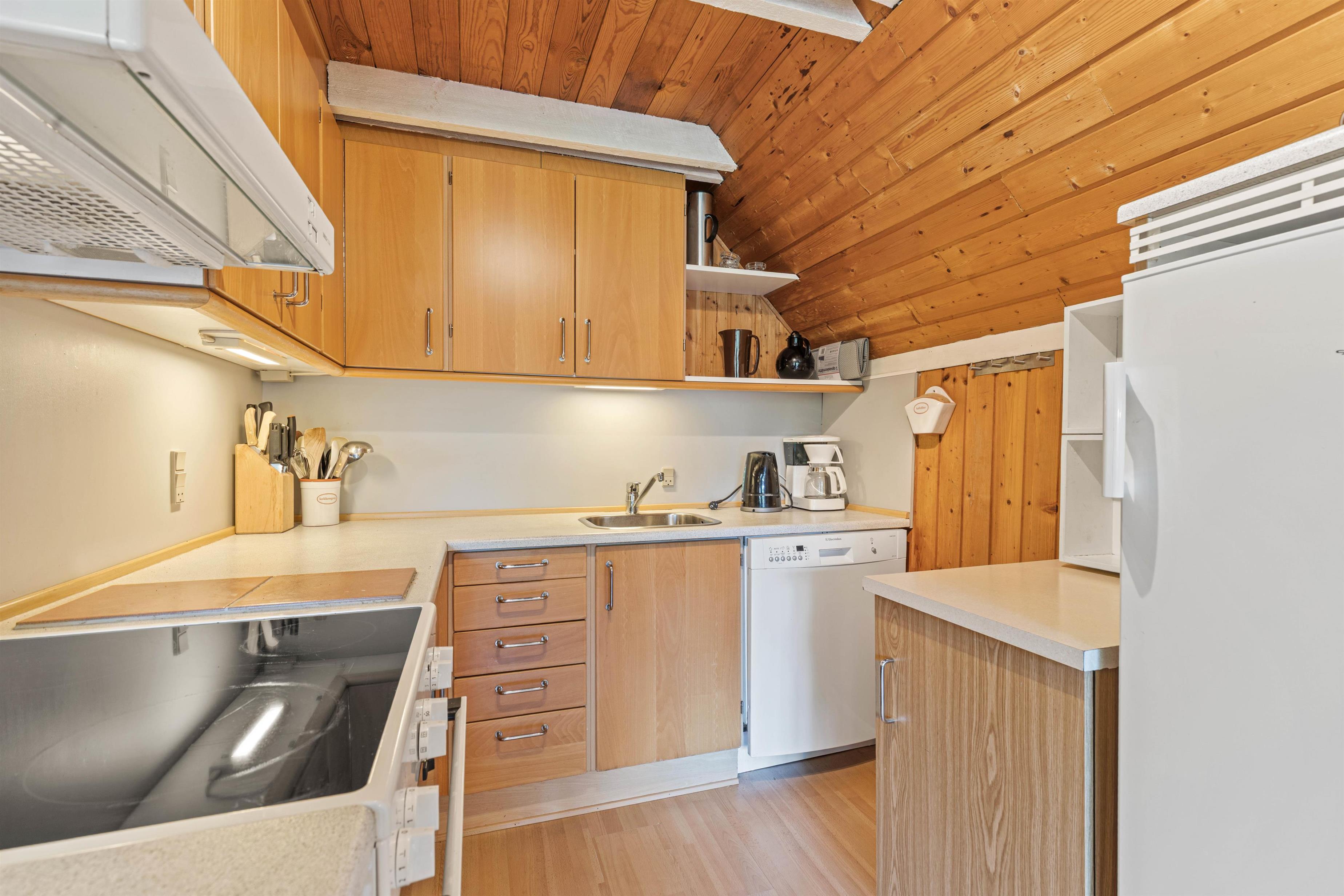 Køkkenet er udstyret med alt, hvad ferien behøver - både en god kaffemaskine, så der kan brygges frisk kaffe til morgenmaden, og en opvaskemaskine, så I ikke skal stå med opvasken efter aftensmaden.