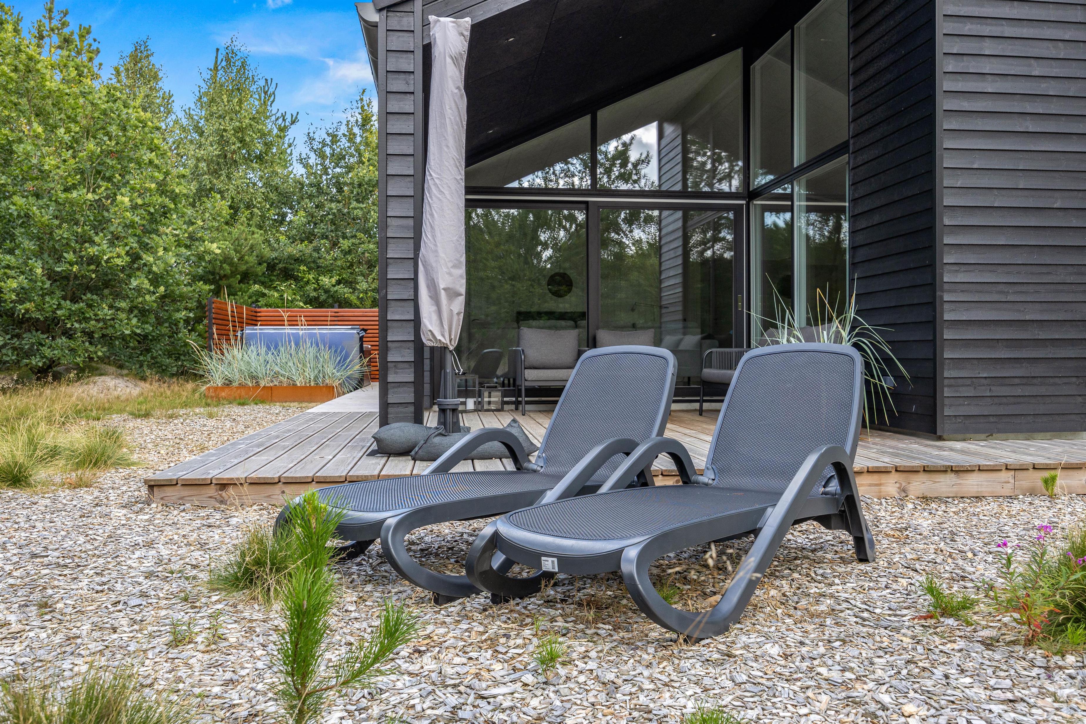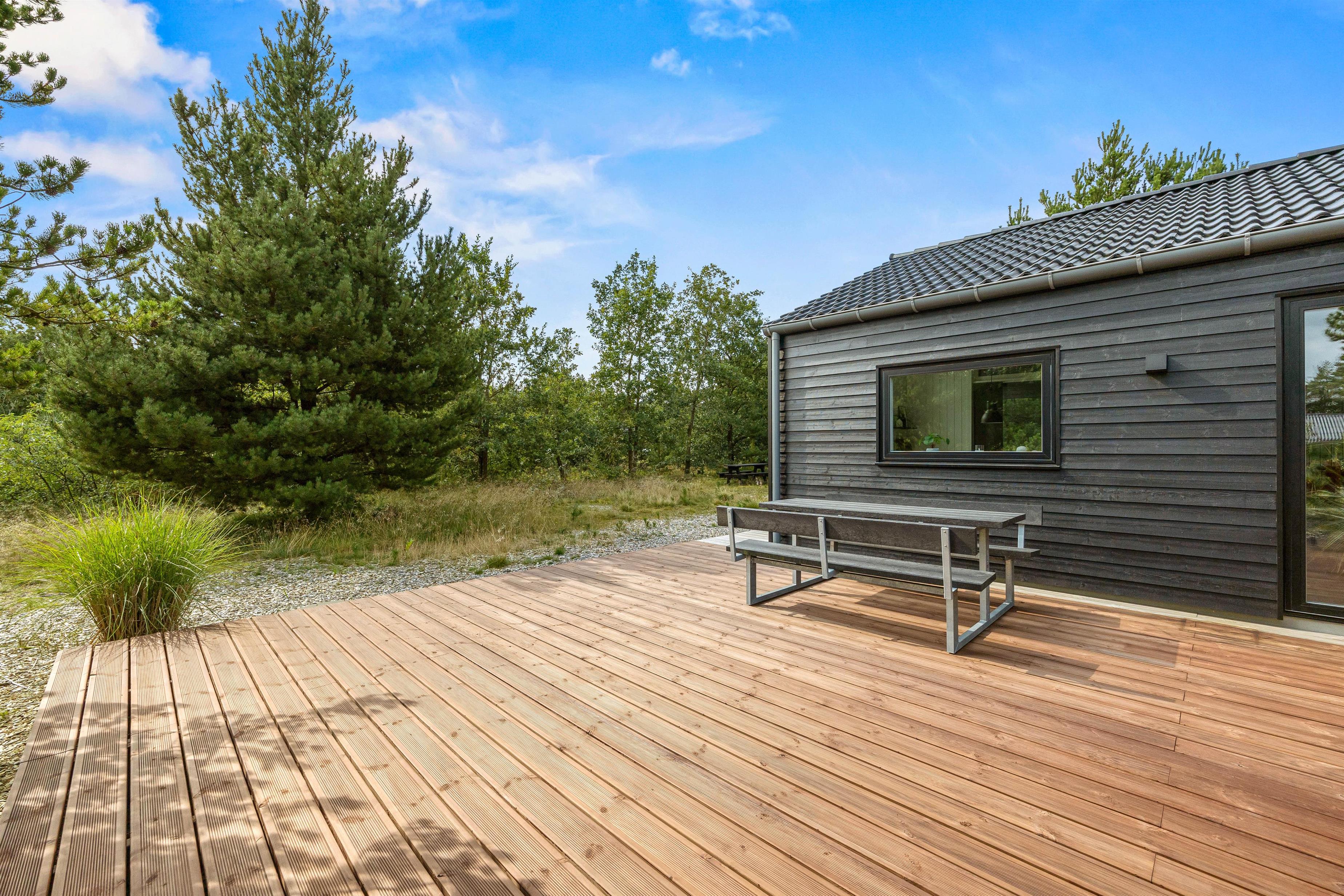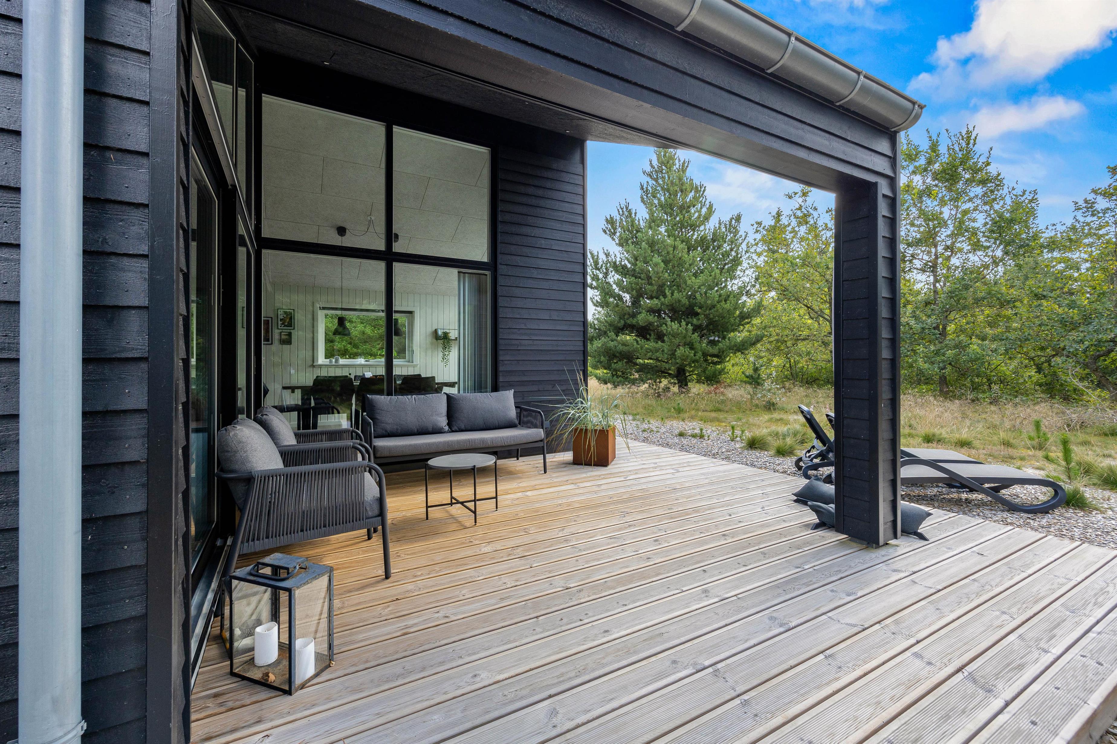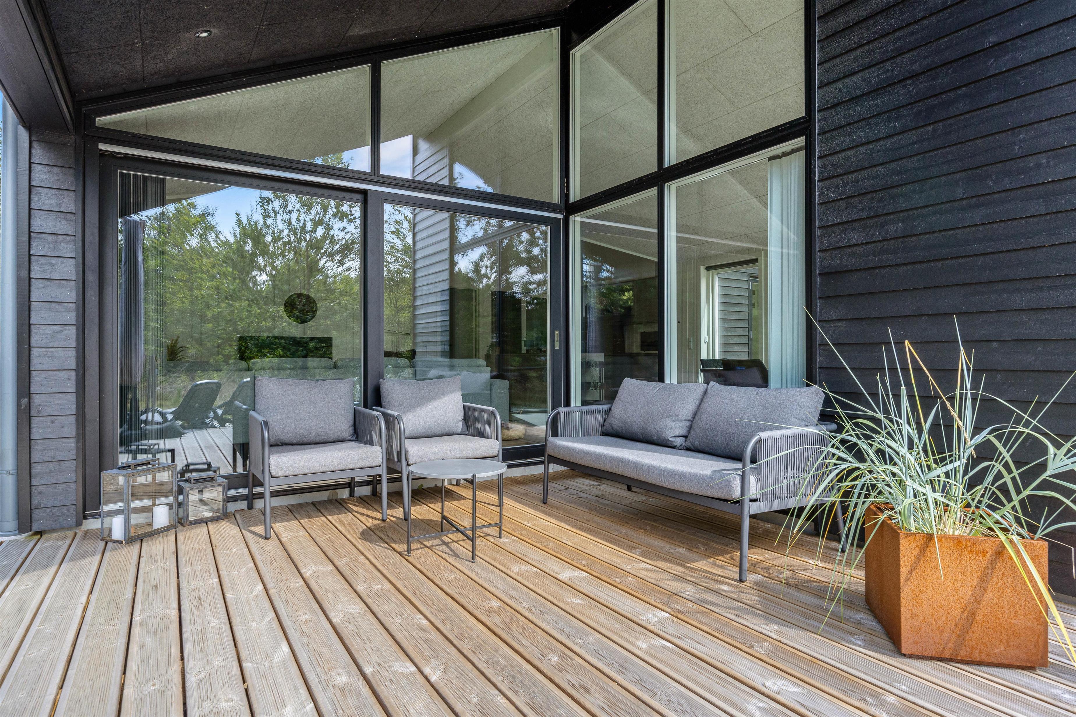 Fra stuen kan I let tilgå den overdækkede terrasse, der fungerer som en udvidelse af sommerhusets komfortable opholdsrum. Udeområdet er skabt til at give jer den ultimative ferieoplevelse i det fri. Den rummelige terrasse tilbyder både en overdækket og en åben del, hvilket gør det muligt at nyde både solrige bruncher og hyggelige grillaftener uanset vejret.