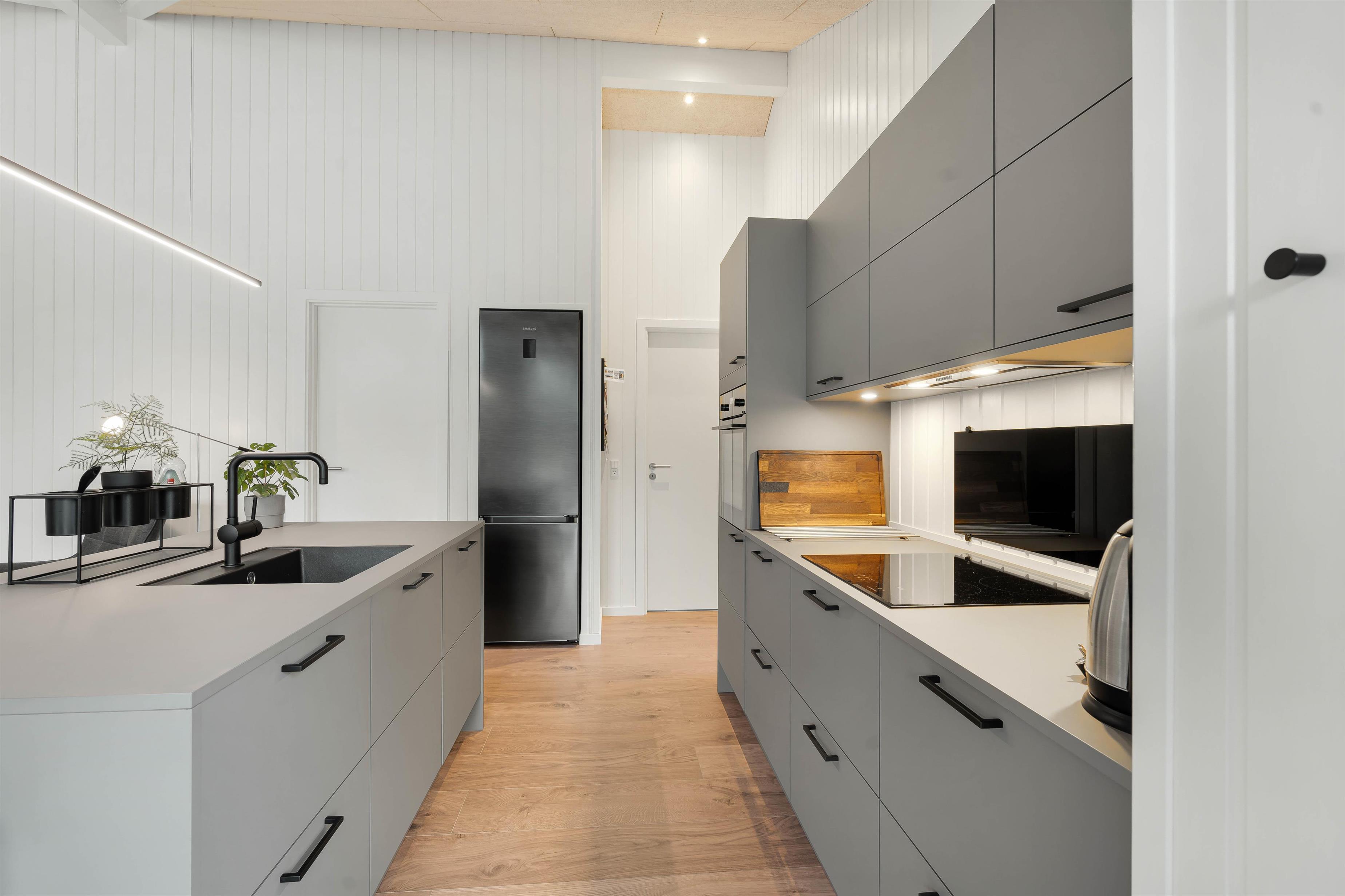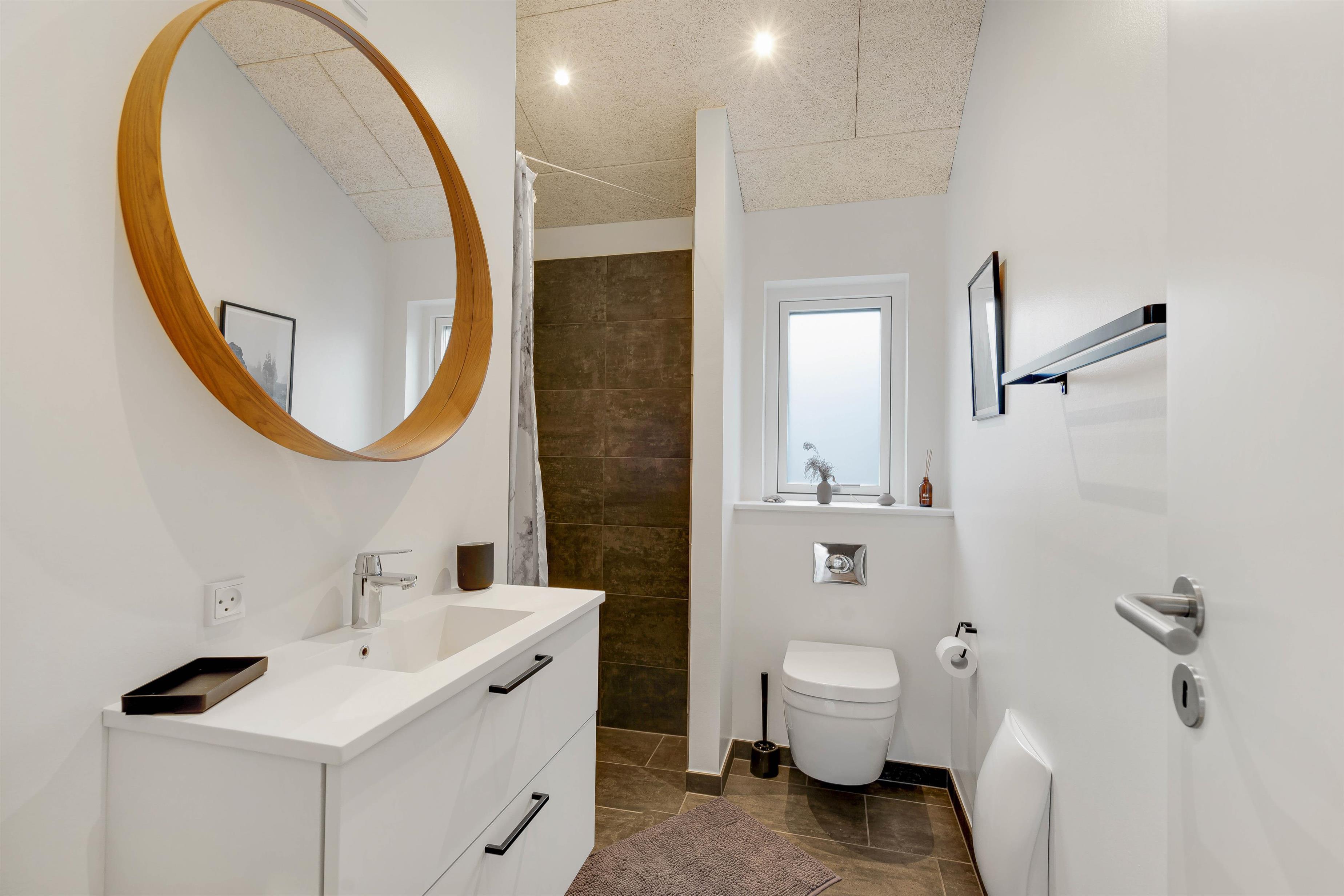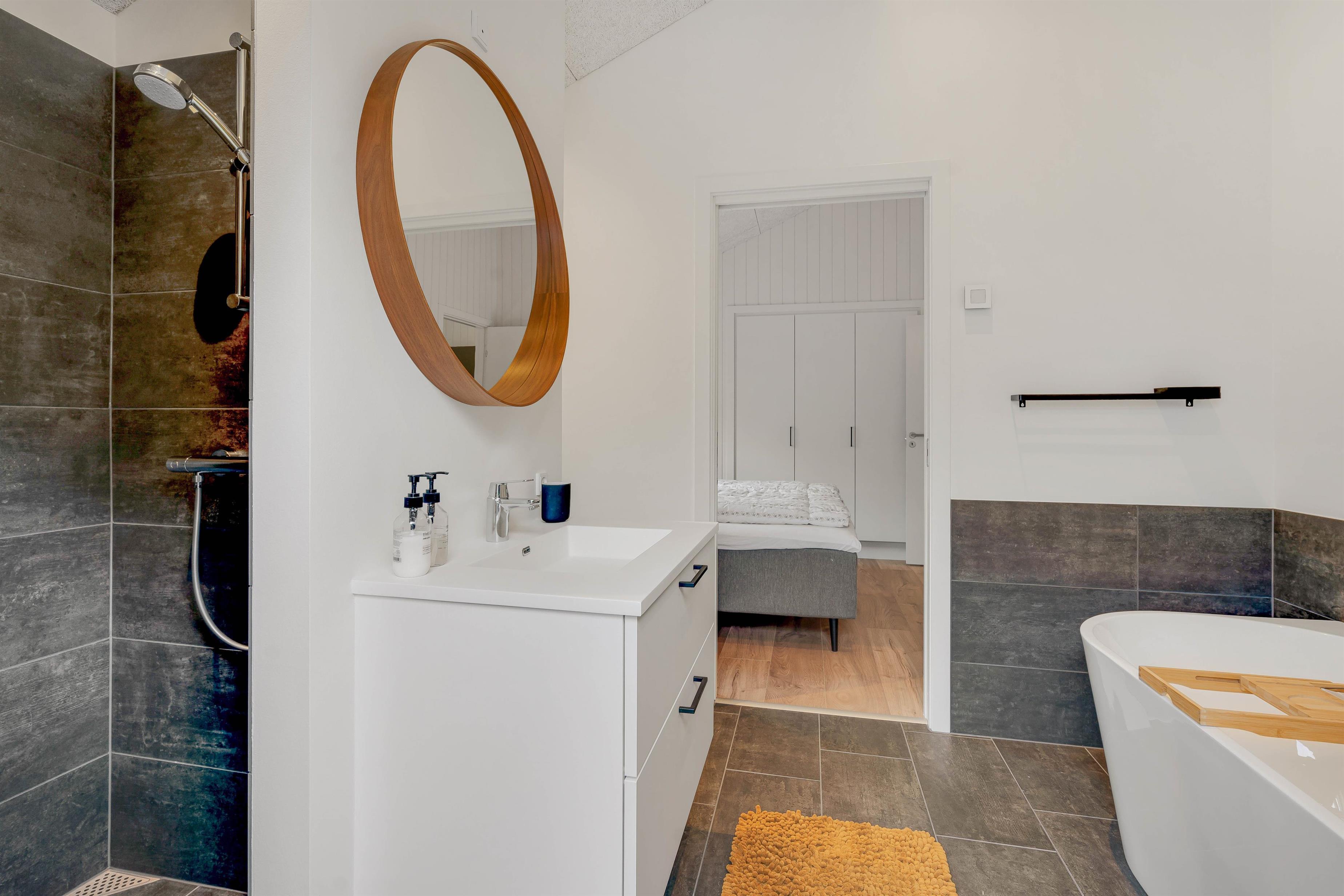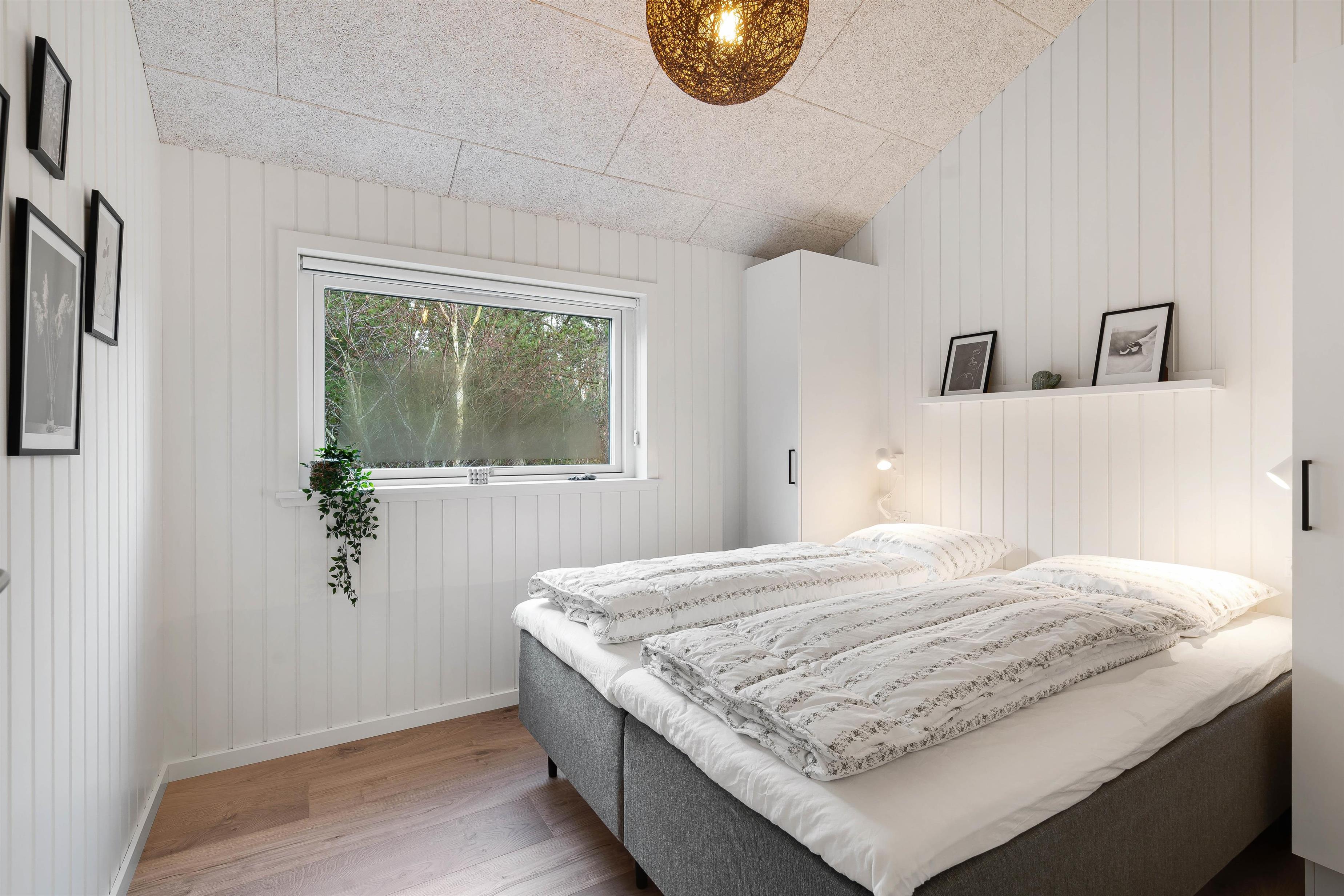 Husets 110m2 er godt udnyttet. Her finder I 2 dobbeltværelser og ét værelse med 2 enkeltsenge. Der er til og med en hyggelig hems i det ene værelse. Husets kerne er den åbne lyse opholdsstue med stort integreret køkken. Her kan I tilbringe mange skønne timer sammen, uanset om I laver mad, streamer film eller spiller brætspil ved langbordet, hvor der er plads til jer alle. De 2 badeværelser sikrer jer en morgen uden lang kø til toilettet, mens opvaskemaskinen og vaskemaskinen nemt klarer de huslige pligter.
