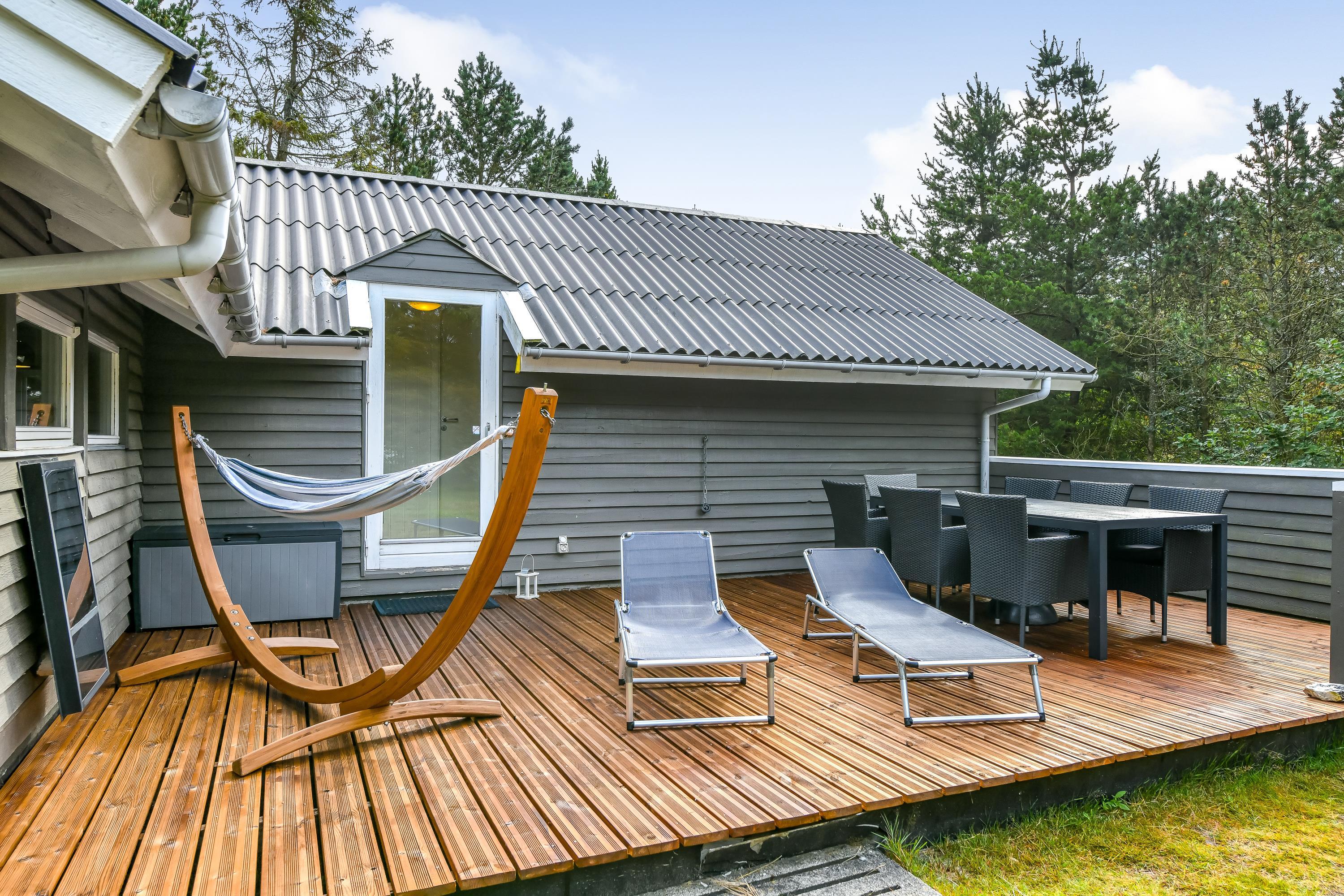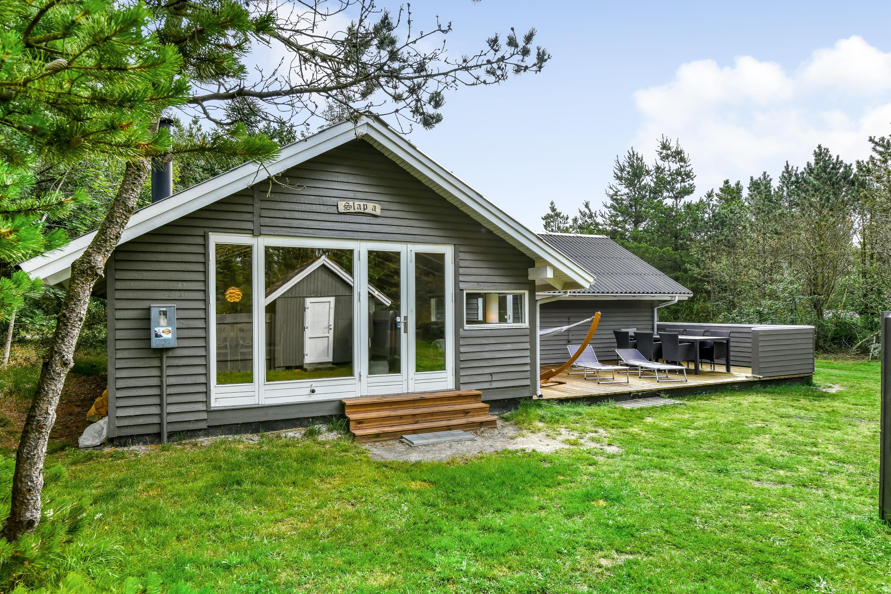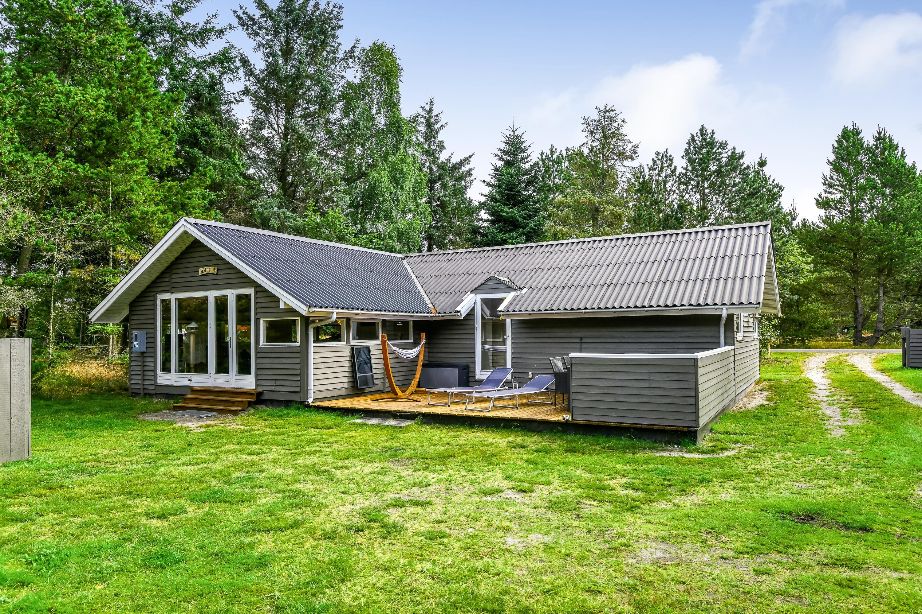 Sommerhuset på Skovvang 97 ligger på en dejlig stor plænegrund omgivet af træer. Havemøbler og grill står klar til jer, så I kan slappe af på den store afskærmede solterrasse.