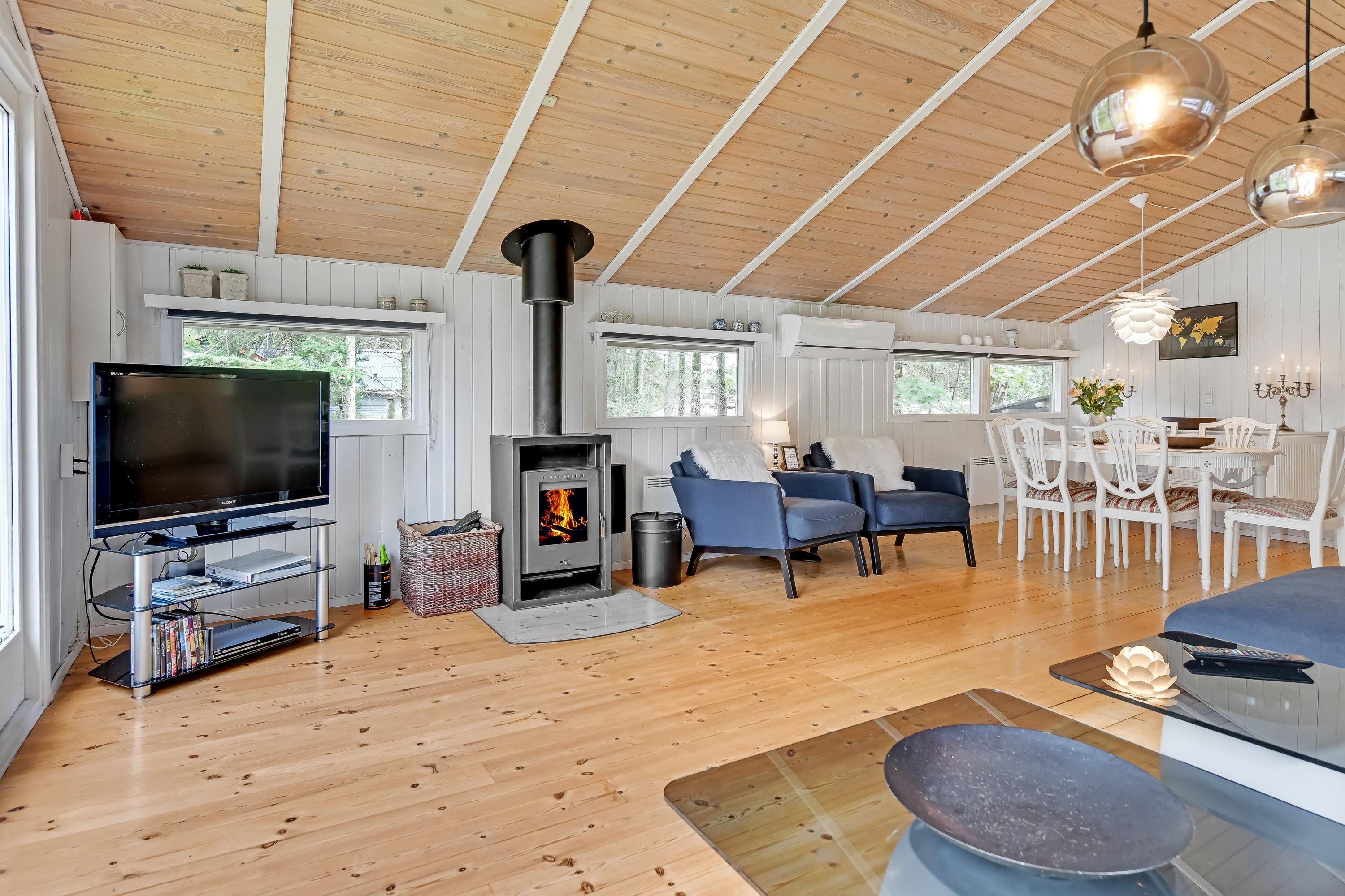 På kolde dage kan I slappe af i stuen, der naturligvis er udstyret med en energibesparende luft-til-luft varmepumpe, men hvis brændeovn er en absolut hyggespreder.