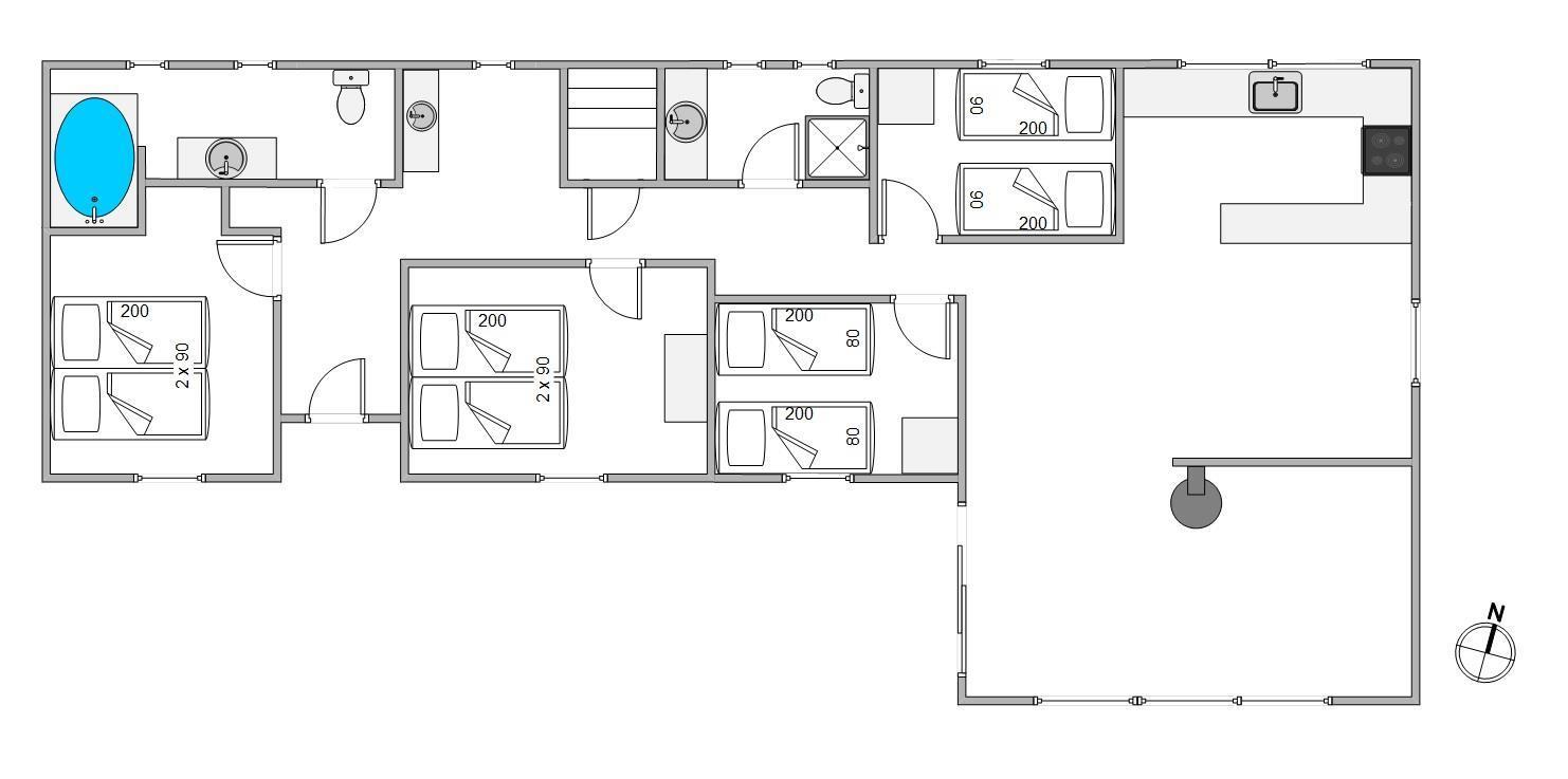 I har to badeværelser, og på det ene finder I et spabad og en sauna, så I kan blive forkælet lidt ekstra i løbet af ferien. En tur i saunaen eller spaen gør altid godt, især efter en frisk dag udenfor med mange nye indtryk og oplevelser.