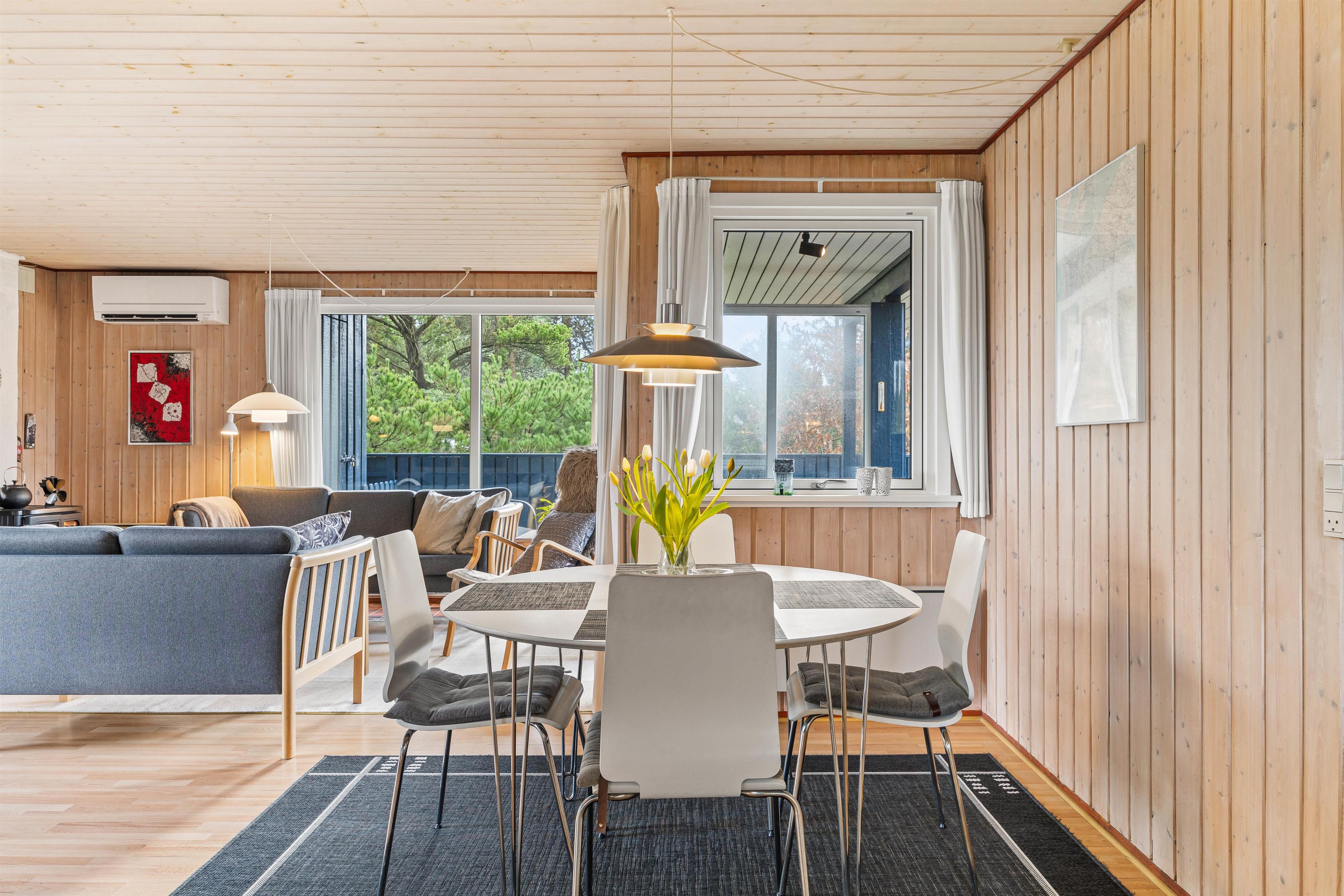 Sommerhuset, der blev bygget i 1976, fremstår lyst og venligt, da der i næsten alle rum er lyse trælofter og -vægge. De 74 kvadratmeter er godt udnyttet til blandt andet 3 gode værelser og det store opholdsrum, hvor køkken, stue og spiseplads er samlet. Så kan I nyde hinandens nærvær, mens nogle er i køkkenet, andre lægger puslespil og spiller kort ved spisebordet, læser én god bog i sofaen, eller streamer det nyeste afsnit af yndlingsserien på feriehusets Chromecast.