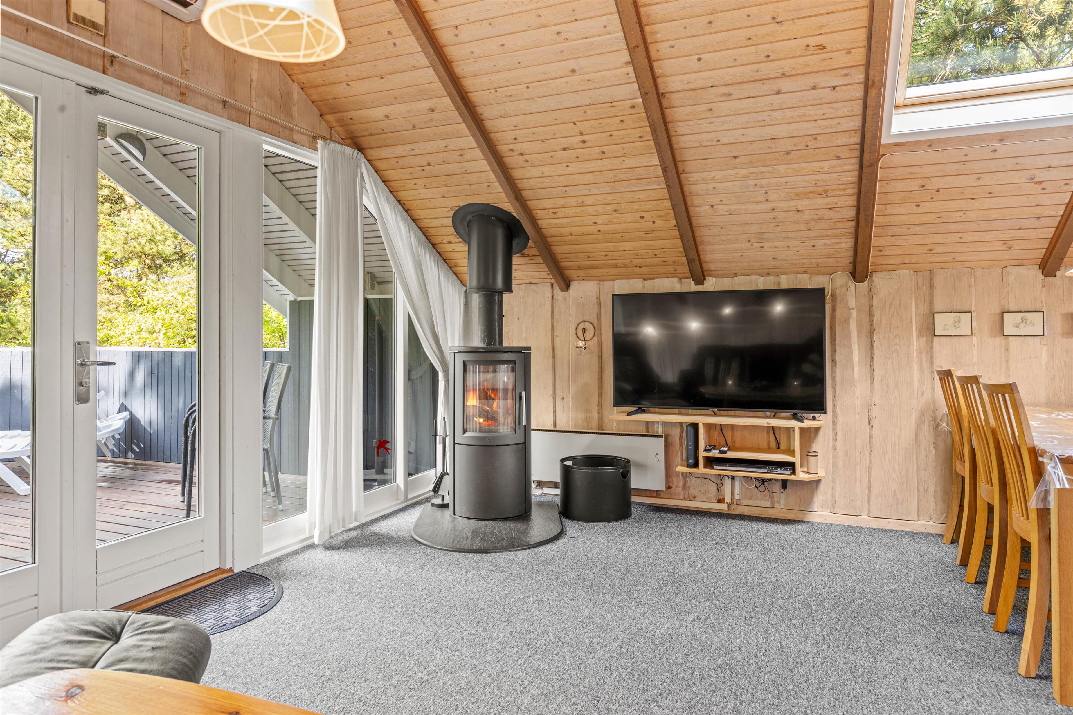Efter en lang gåtur kan I tænde op i brændeovnen og hygge i stuen. De store vinduer inviterer naturen indenfor og giver følelsen af et dejligt frirum for hele familien, mens ovenlysvinduet lader solens stråler slippe ind.