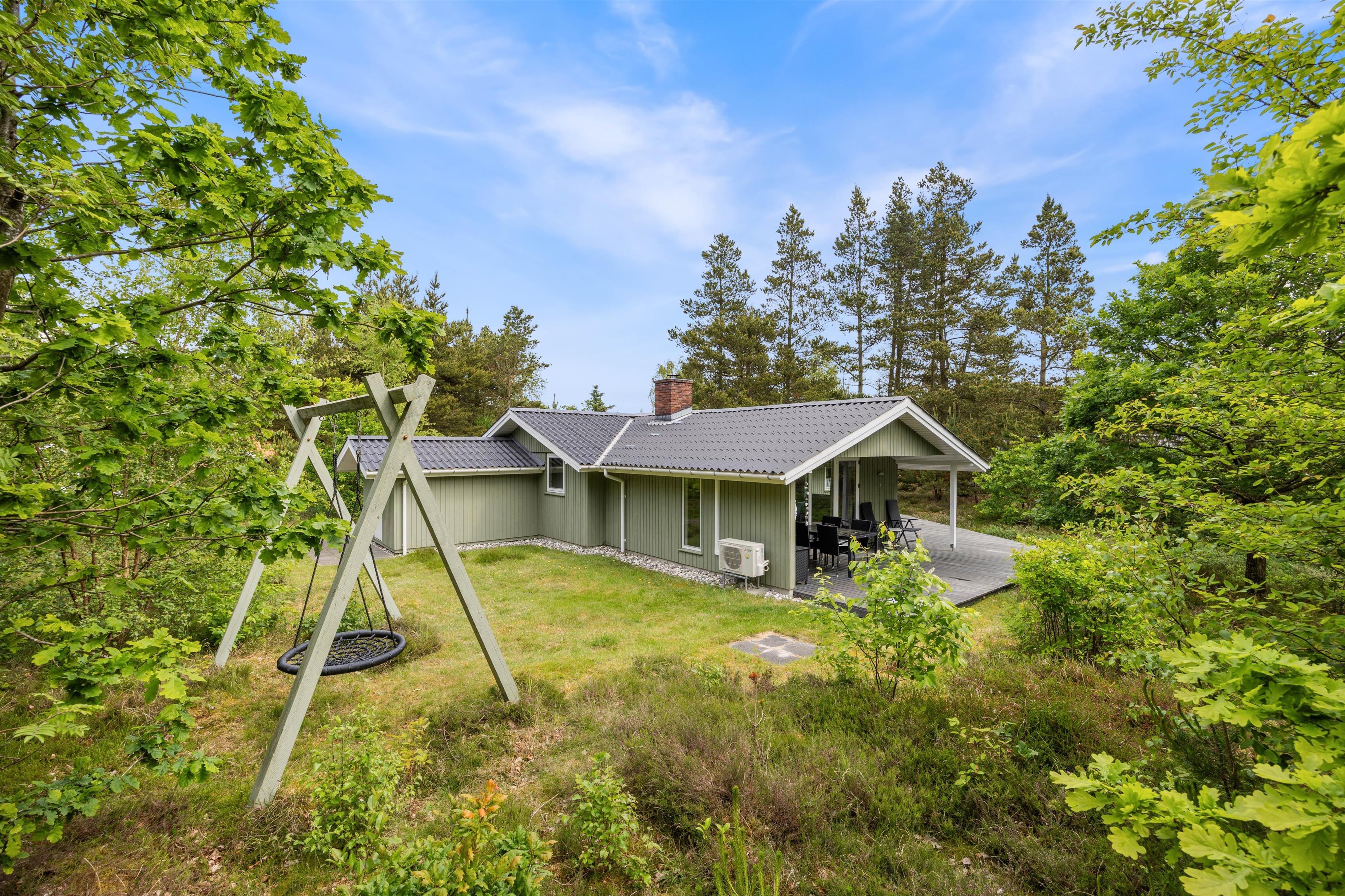 For børnene kan en lille tur rundt i haven være en stor oplevelse. Det charmerende træsommerhus ligger på en 1.100 m² stor grund. Grunden er omkranset af grantræer og buske, som giver jer ro og privatliv, når I er i huset eller sidder på den dejlige træterrasse.