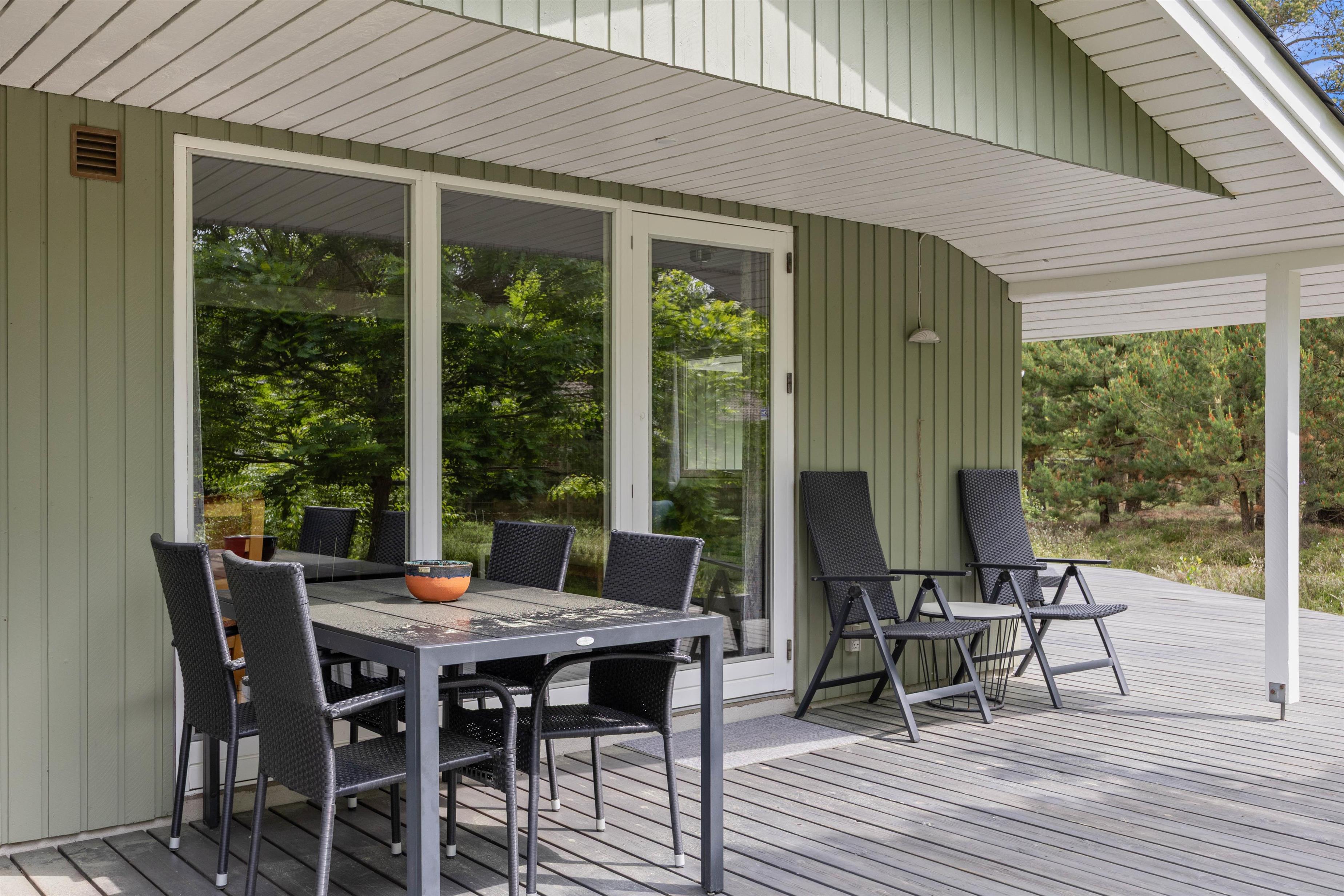 En del af terrassen er delvist overdækket. Det giver lidt ekstra læ, når mørket sænker sig på lune sommeraftener. Her er det oplagt at tænde op i grillen, og nyde en dejlig middag i det fri til lyden af fuglekvidder.