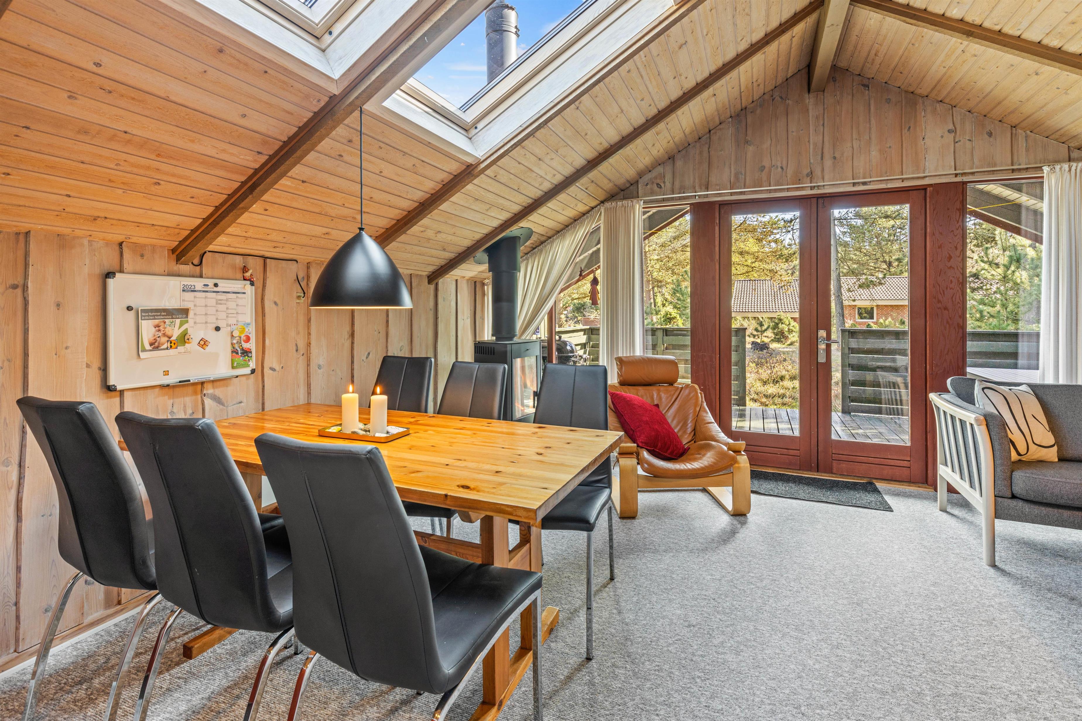 Opholdsstuen med åben forbindelse til køkkenet fungerer som husets hjerte og bliver familiens mødested. Her kan der kokkereres, hygges med film og snacks og spilles spil langt ud på de sene aftentimer. Her står også brændeovnen, hvis knitrende flammer spreder masser af hyggelig stemning og varme på de kolde feriedage. I både stuen og badeværelset er der ovenlysvinduer, der fylder rummene med et naturligt og behageligt lys i dagstimerne.