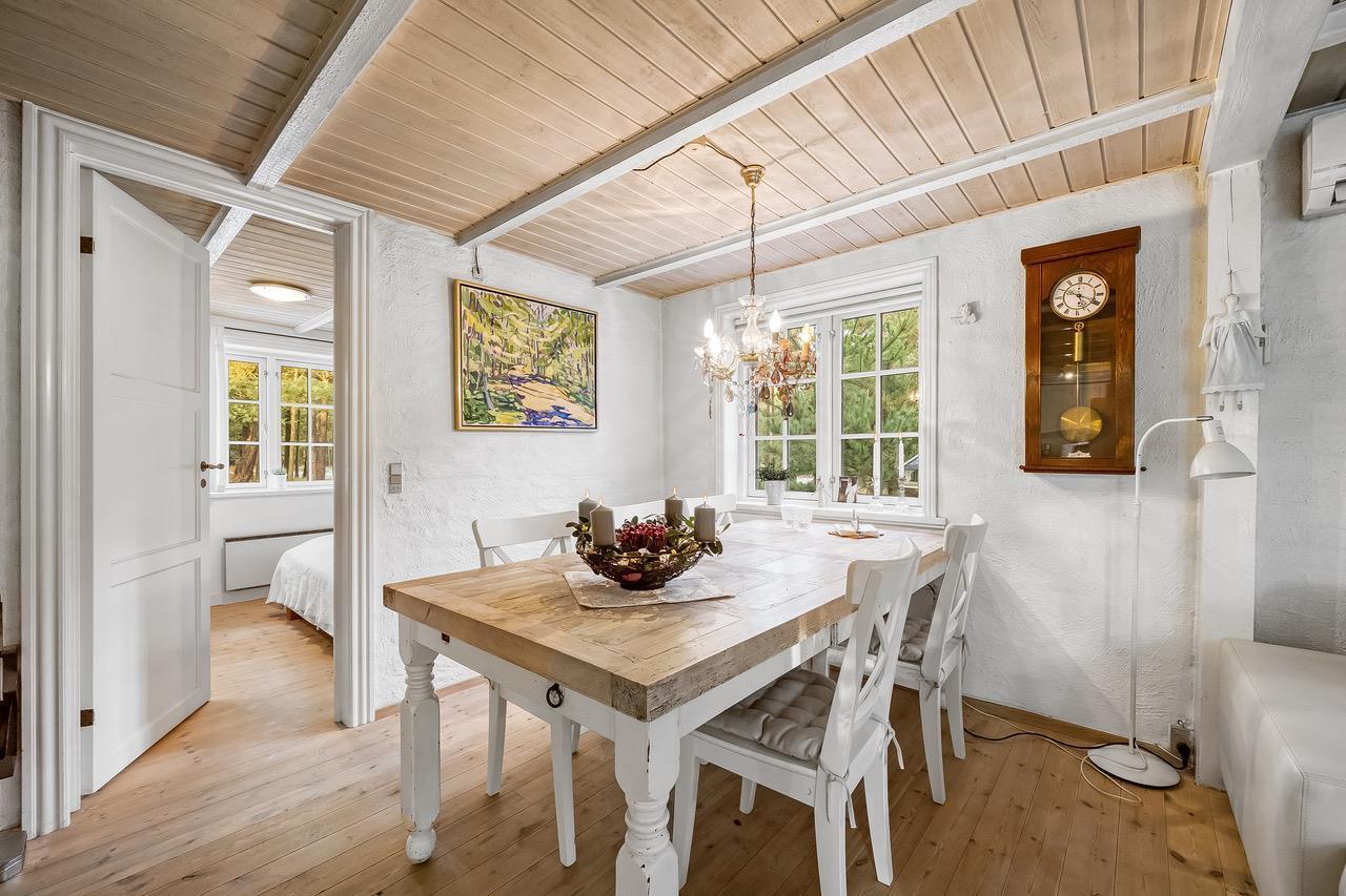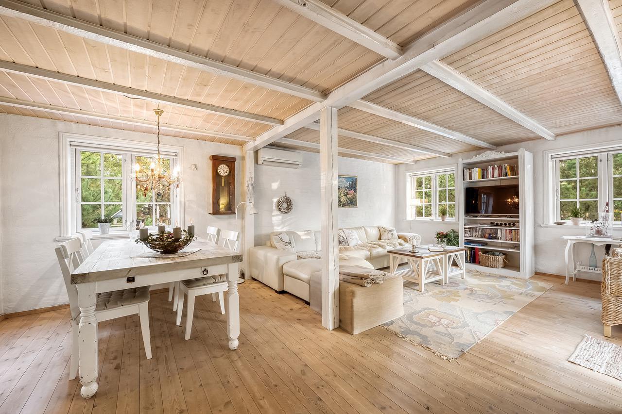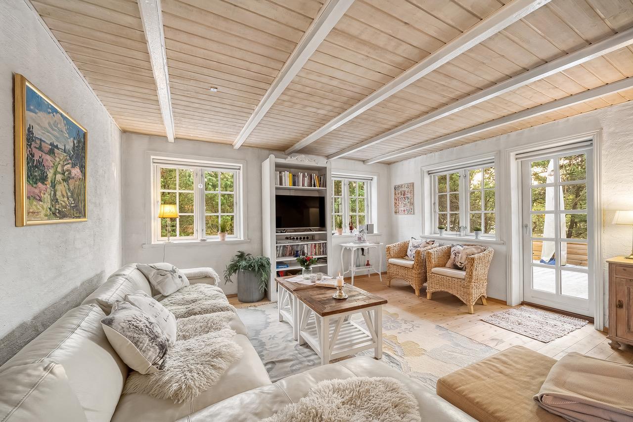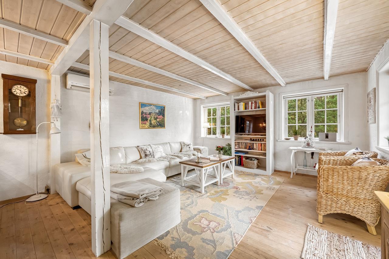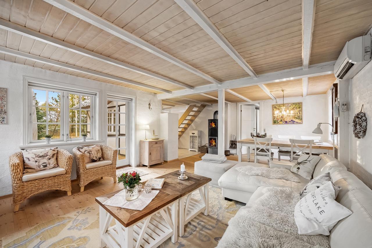 Sommerhuset byder på en lys og landlig indretning, der skaber en stemning af hygge og afslapning.