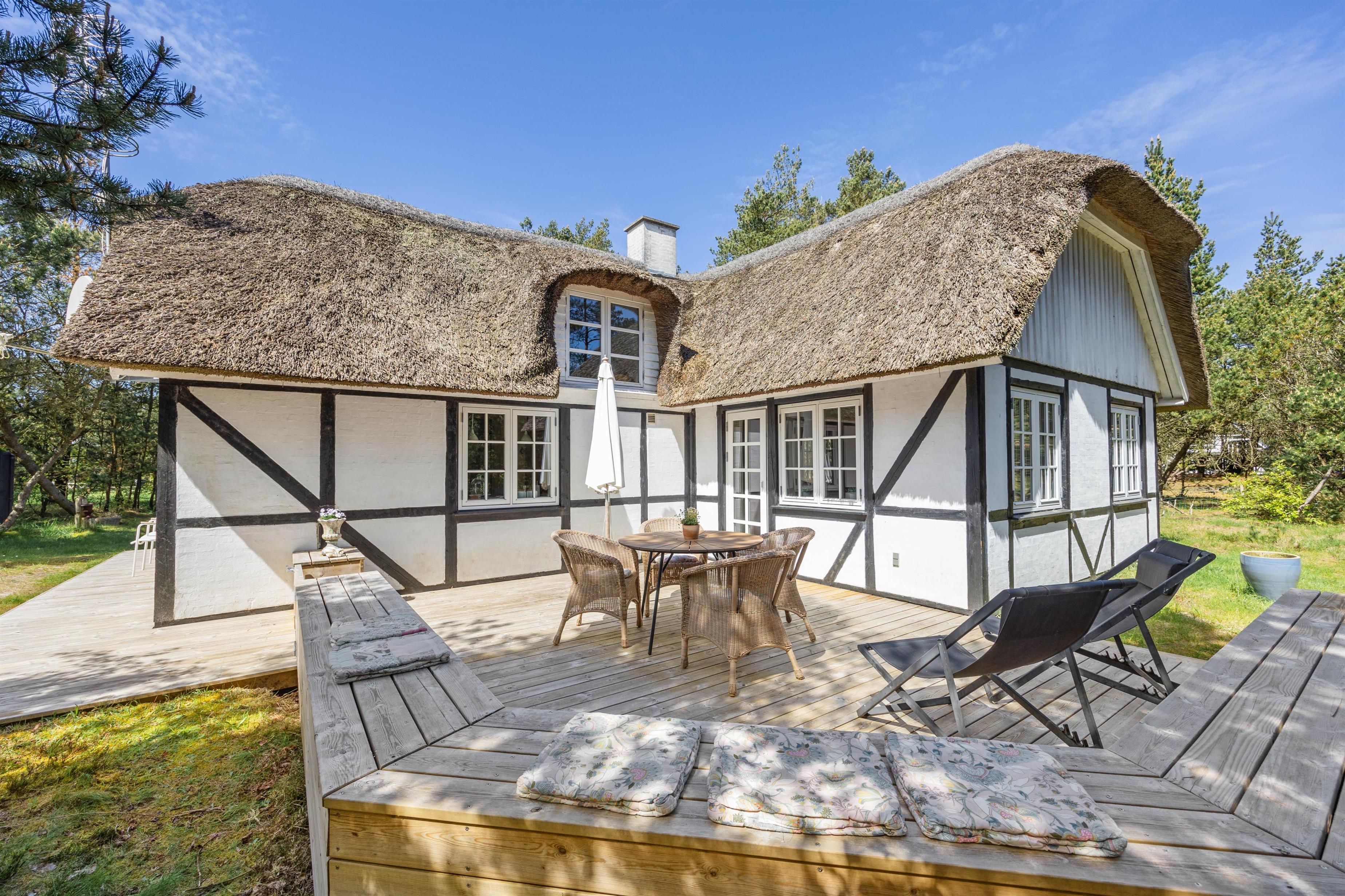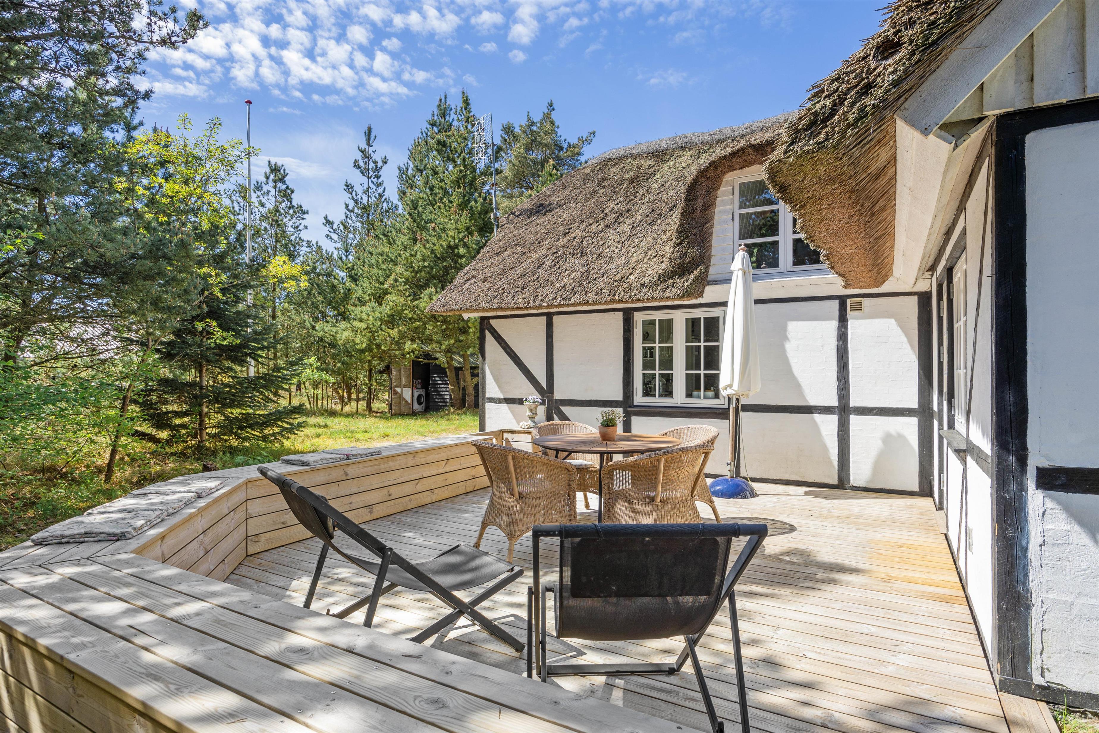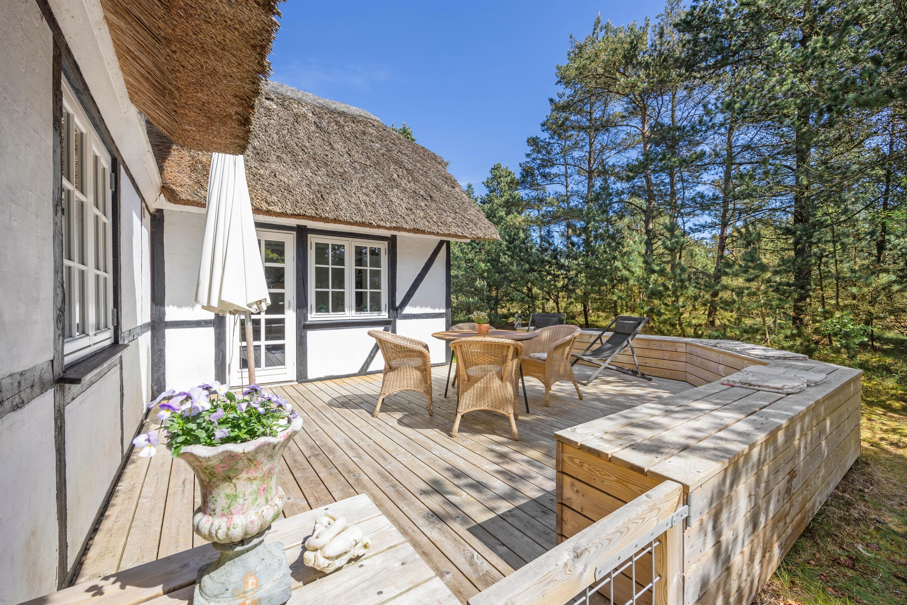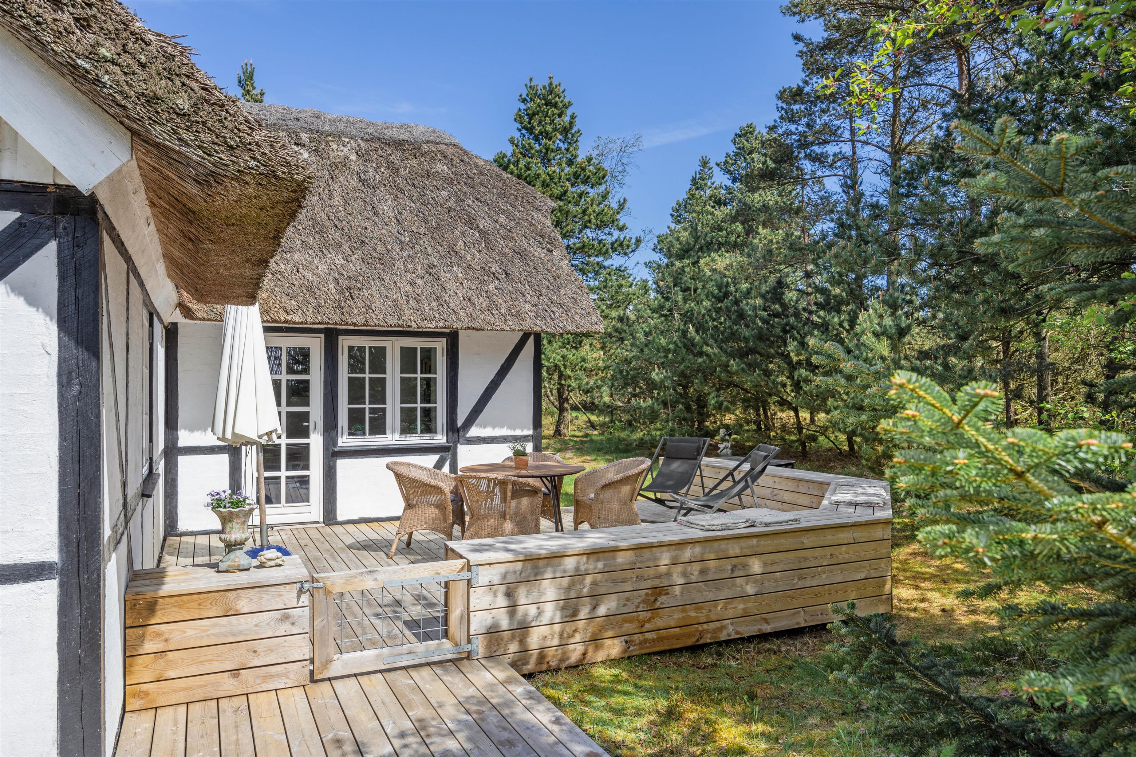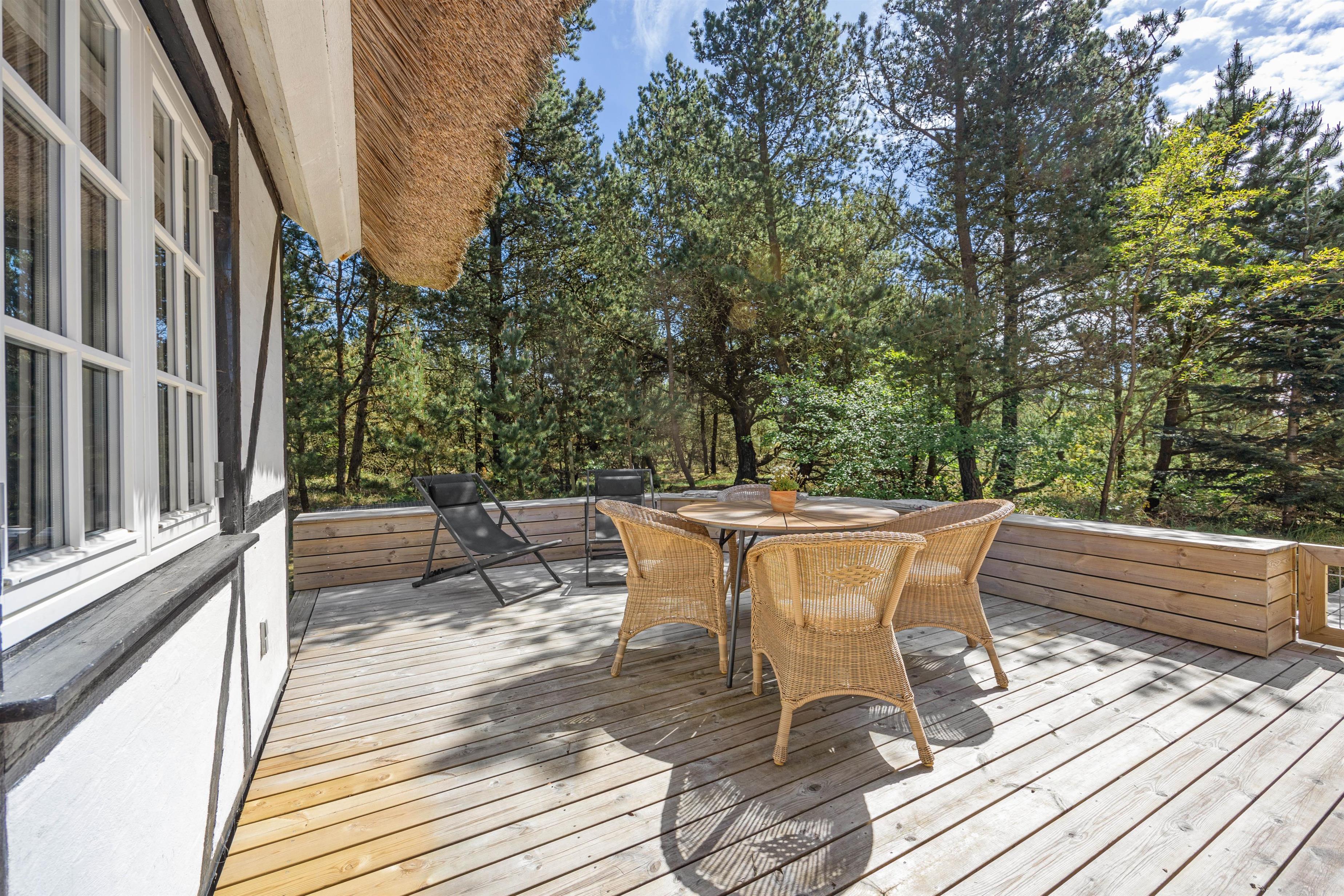 Fra stuen åbner terrassedørene ud til sommerhusets rummelige terrasse, der er fuldt udstyret til jeres feriebehov. Her finder I alt, hvad I skal bruge til udendørs fornøjelse, herunder grill, komfortable havemøbler, solsenge og en parasol.
