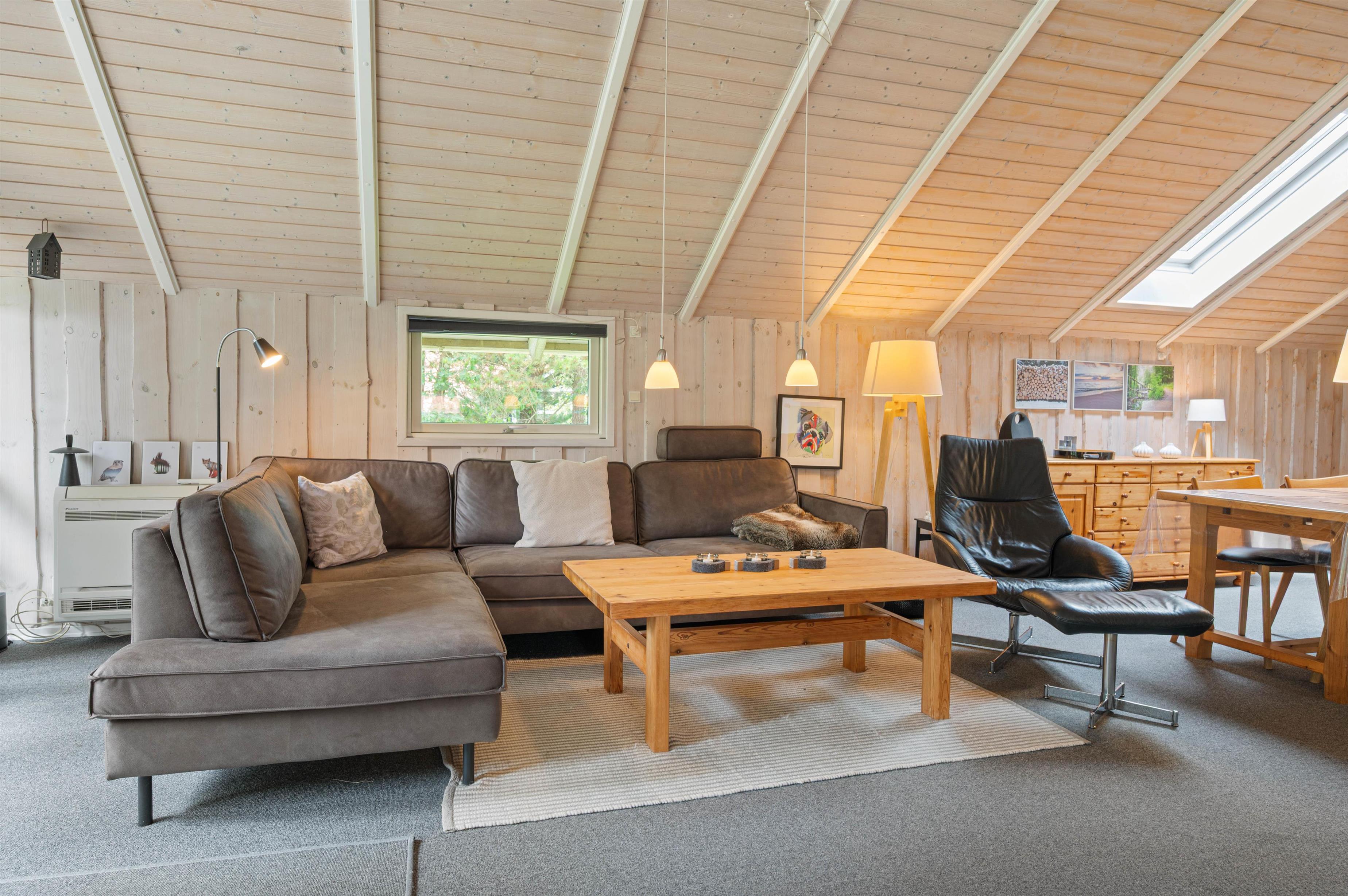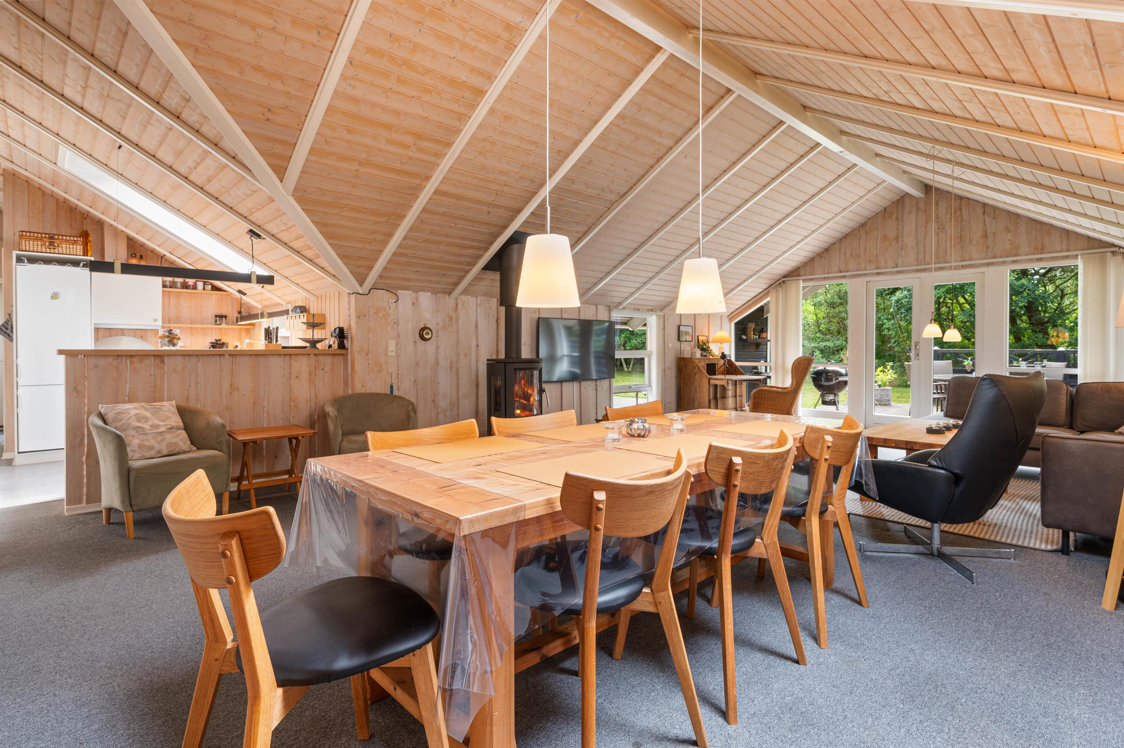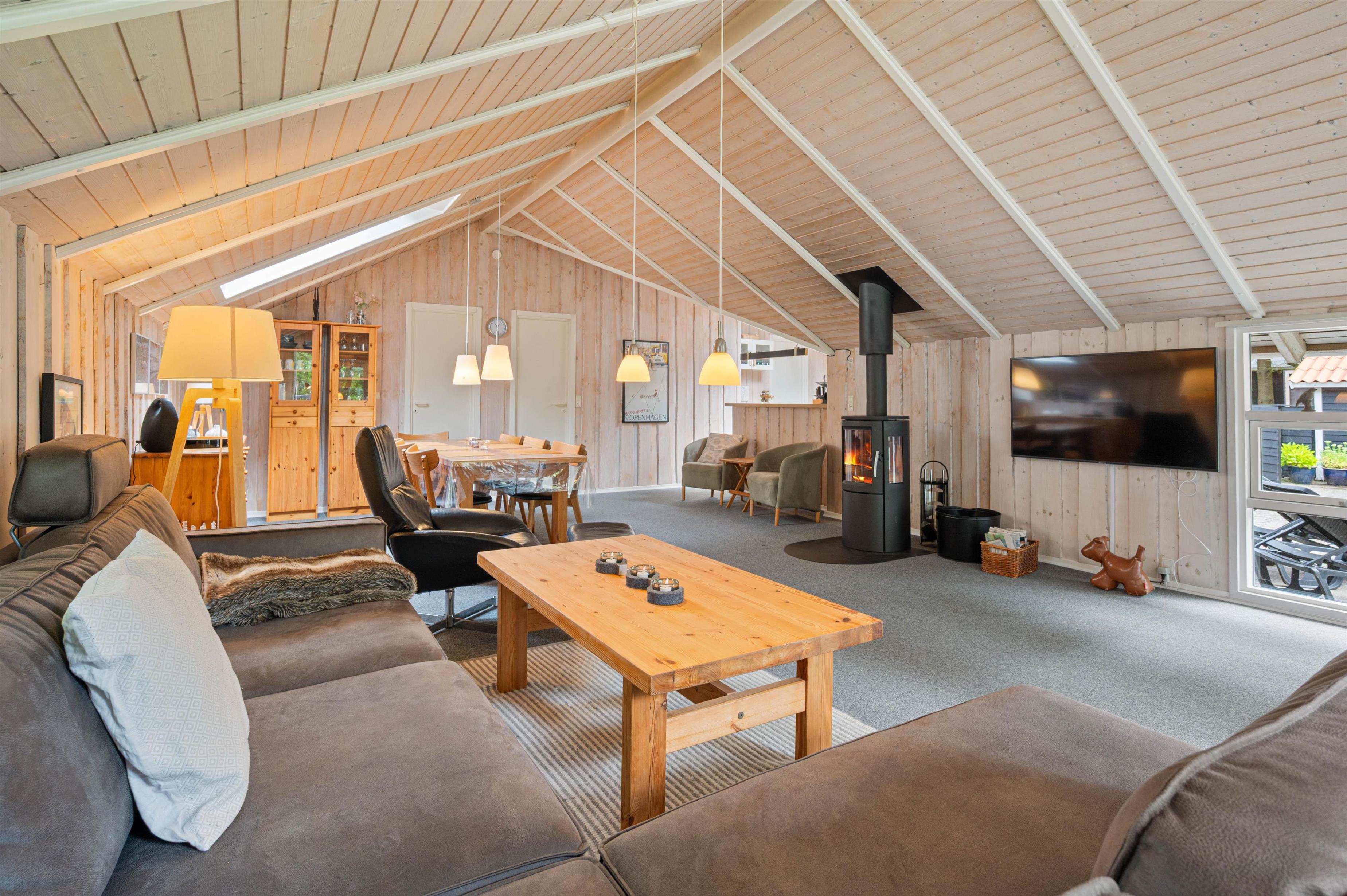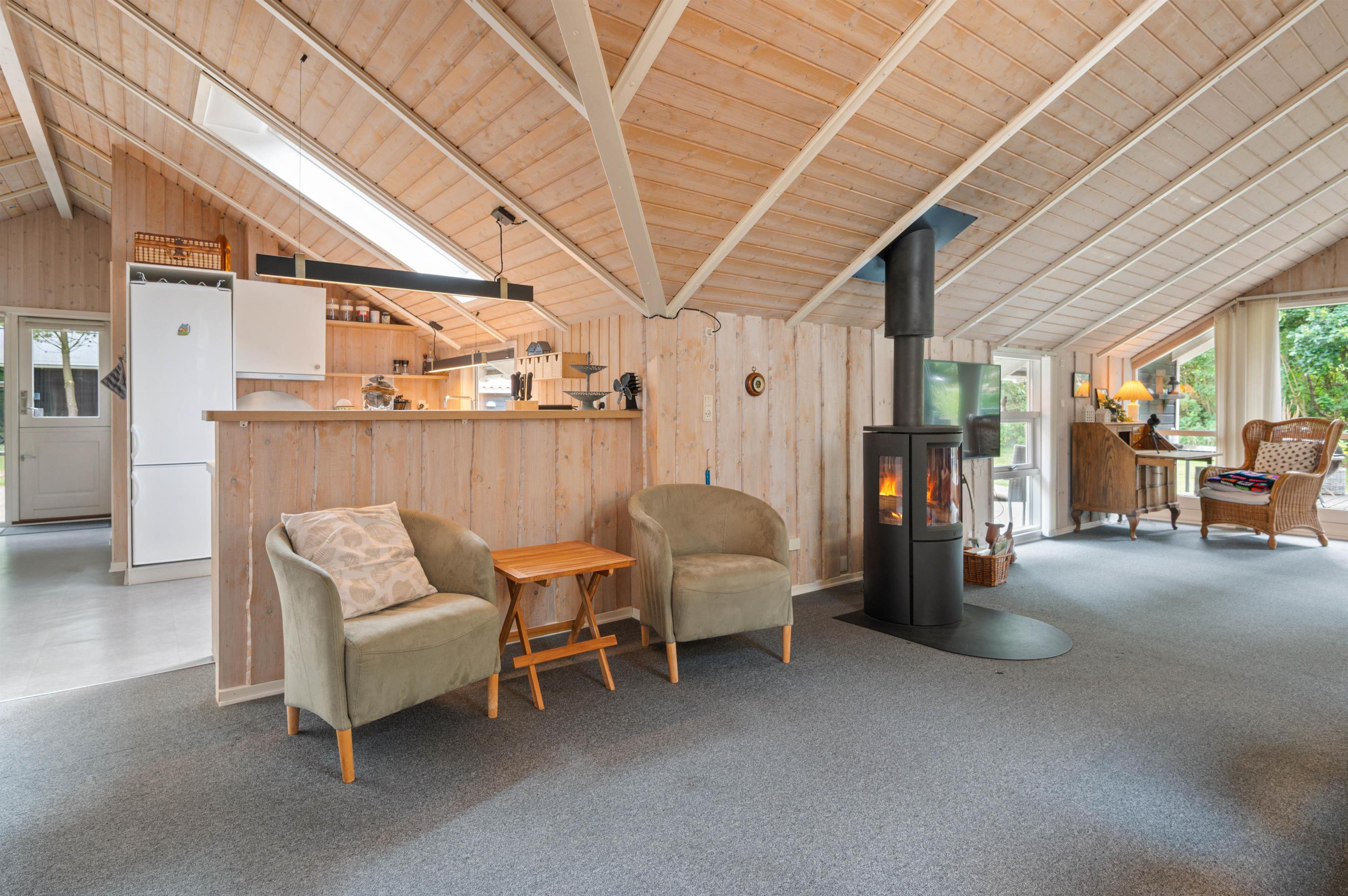 Det åbne køkken- og stueområde med brændeovnen som centrum er et naturligt samlingspunkt for familiesamværet. Familiens kok er stadig en del af hyggen og snakken, og spisebordet kan indbyde til såvel måltider som spillestunder.