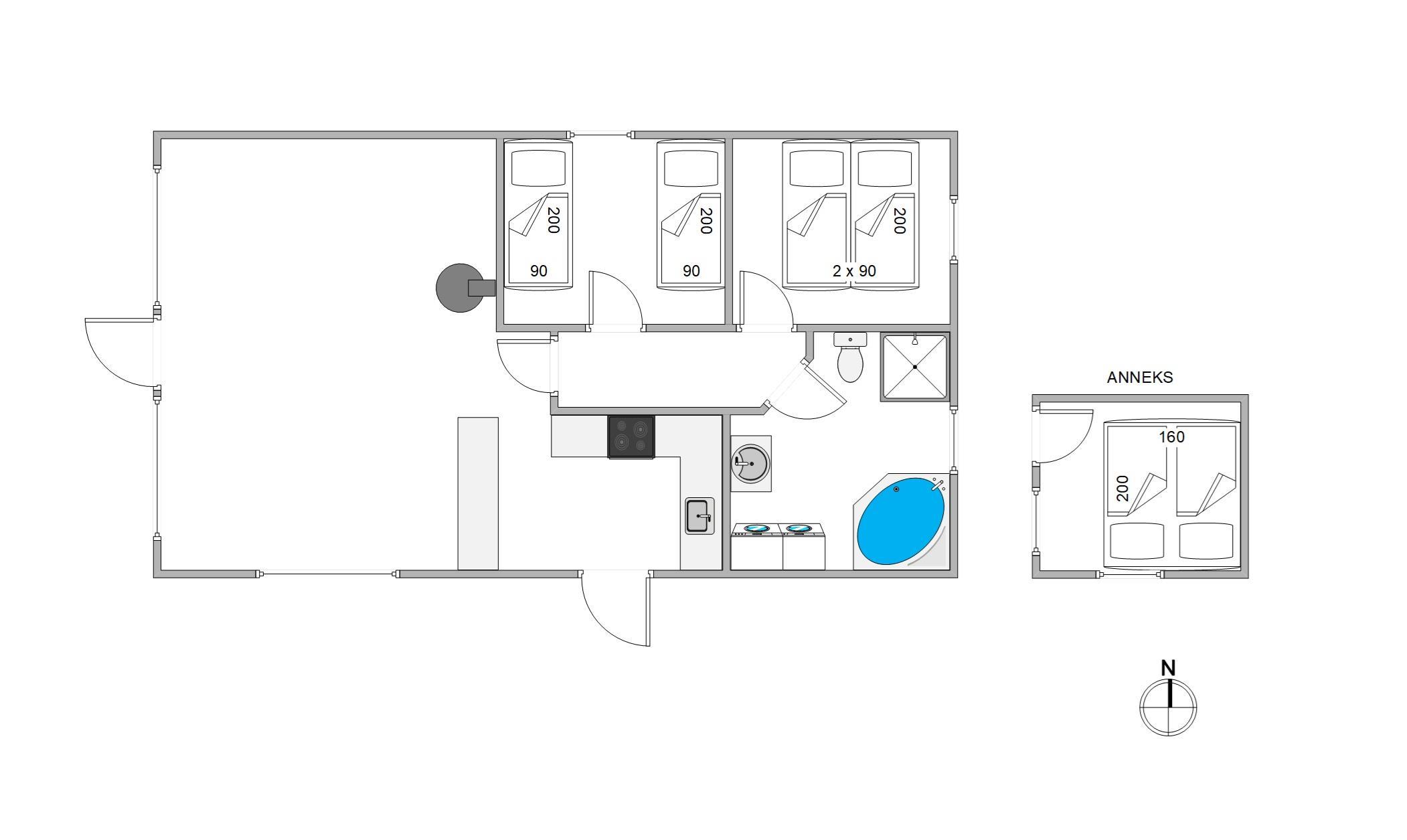I det rummelige badeværelse finder I et spabad, så I rigtig kan forkæle jer selv og dem, I holder af. Nyd varmen efter en lang dag på terrassen, eller en gåtur i det hyggelige og fredelige skovområde i Houstrup. Der findes ikke noget bedre!