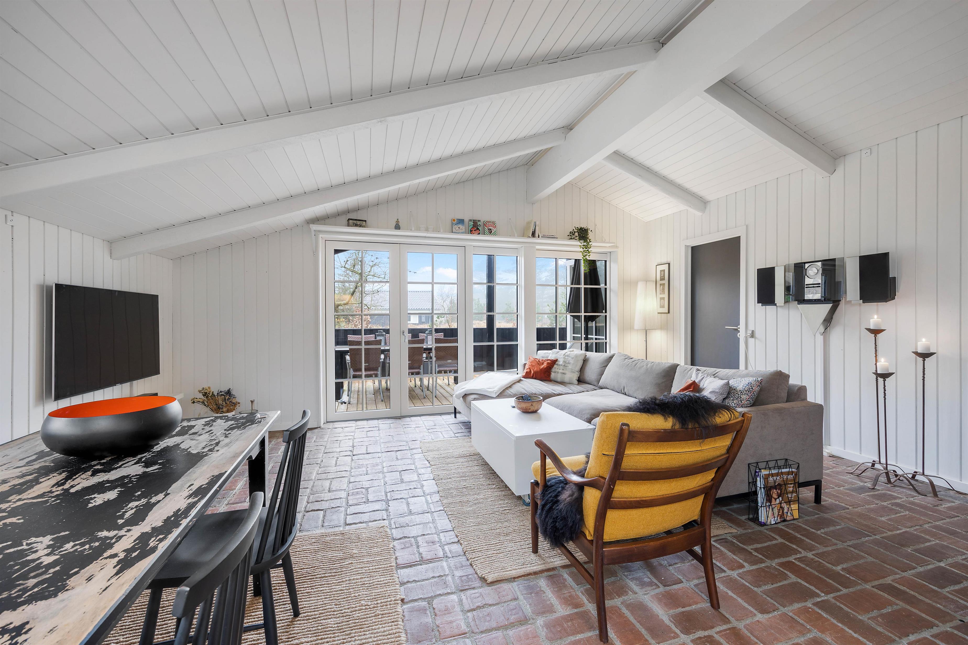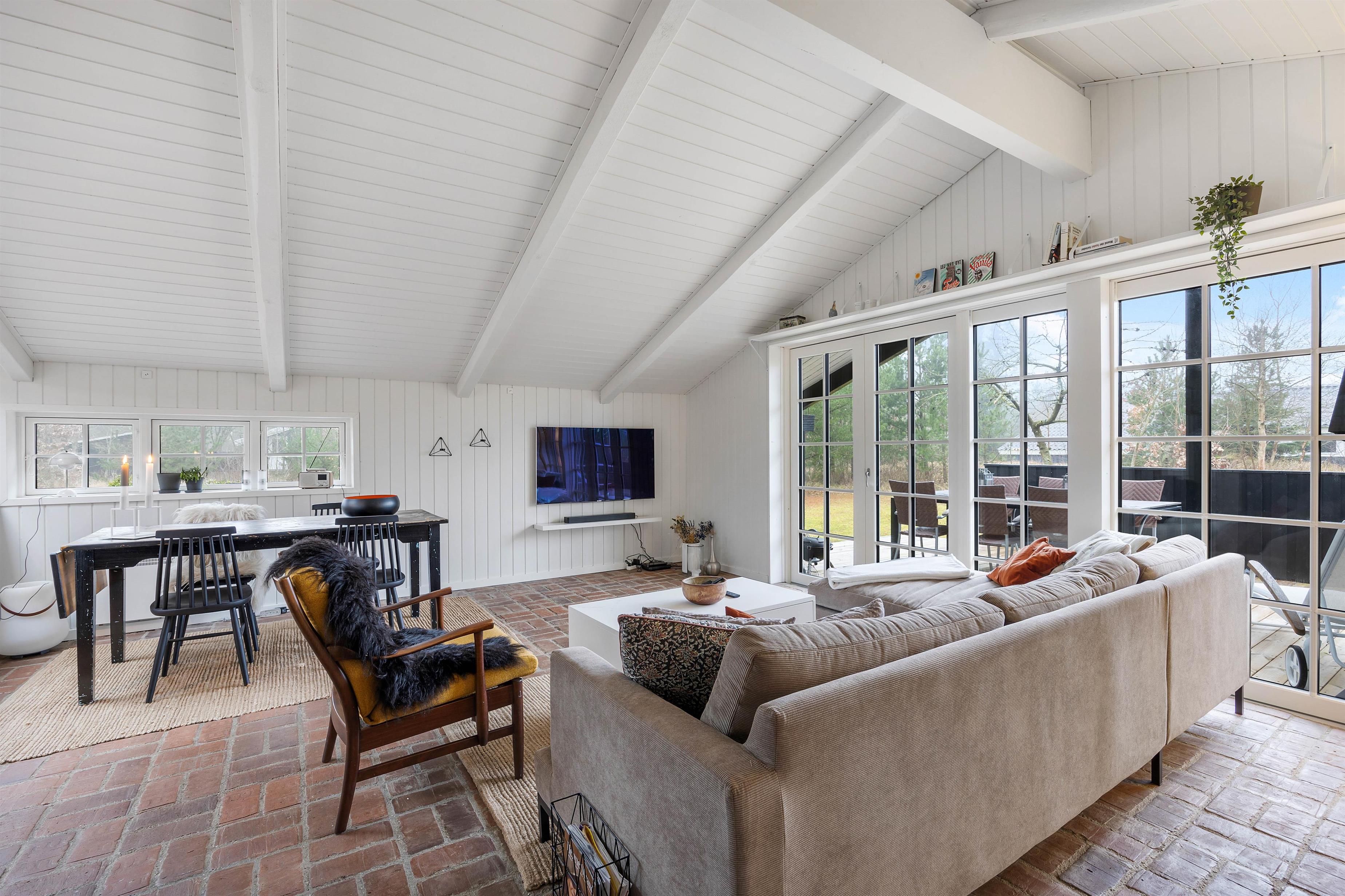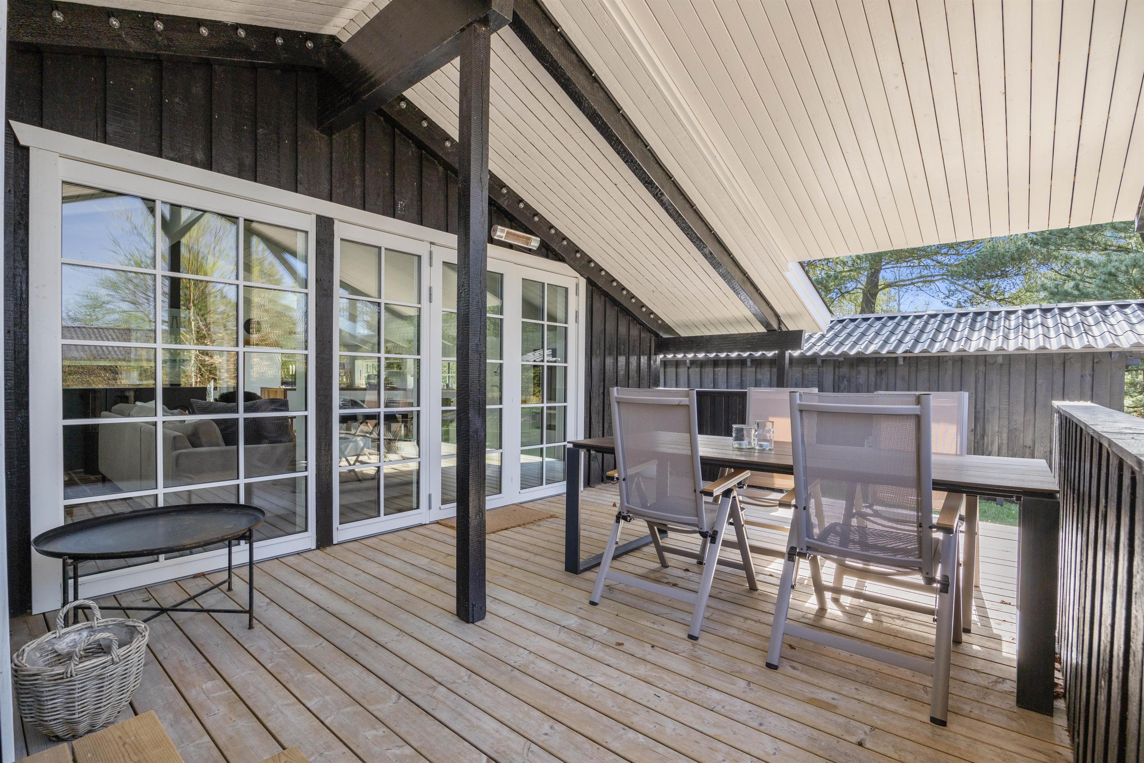 Fra stuen er der direkte adgang til feriehusets ene terrasse, der er delvis overdækket. Her kan I nyde de varme dage i havemøblerne eller i sommerhusets liggestole, mens børnene leger rundt på den store græsplæne, og spiller en gang fodbold.