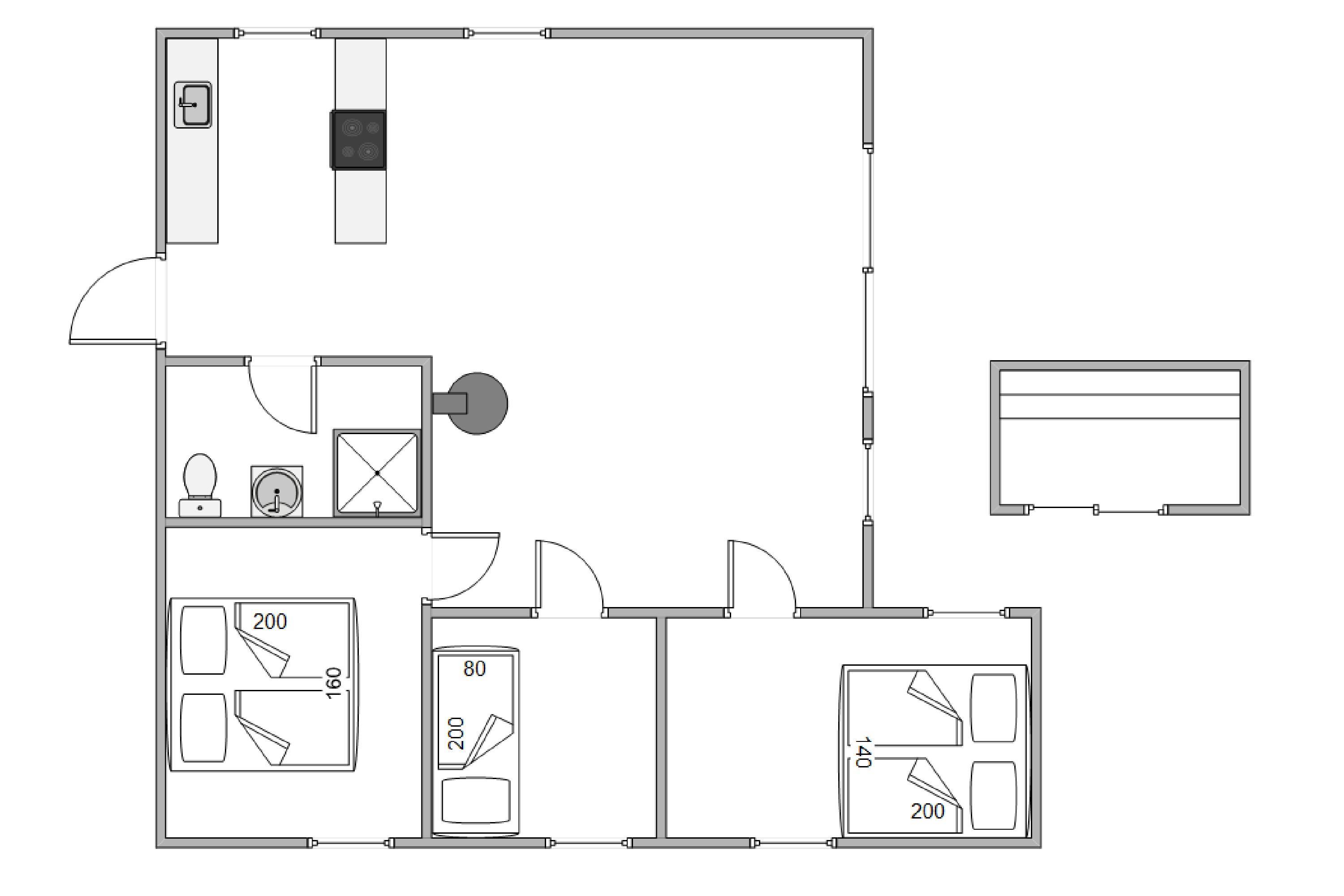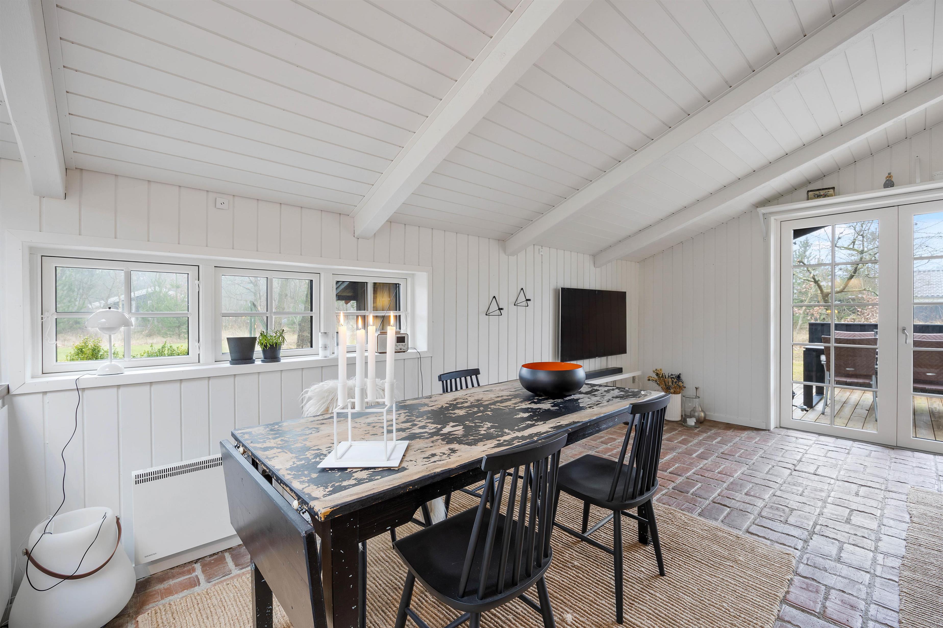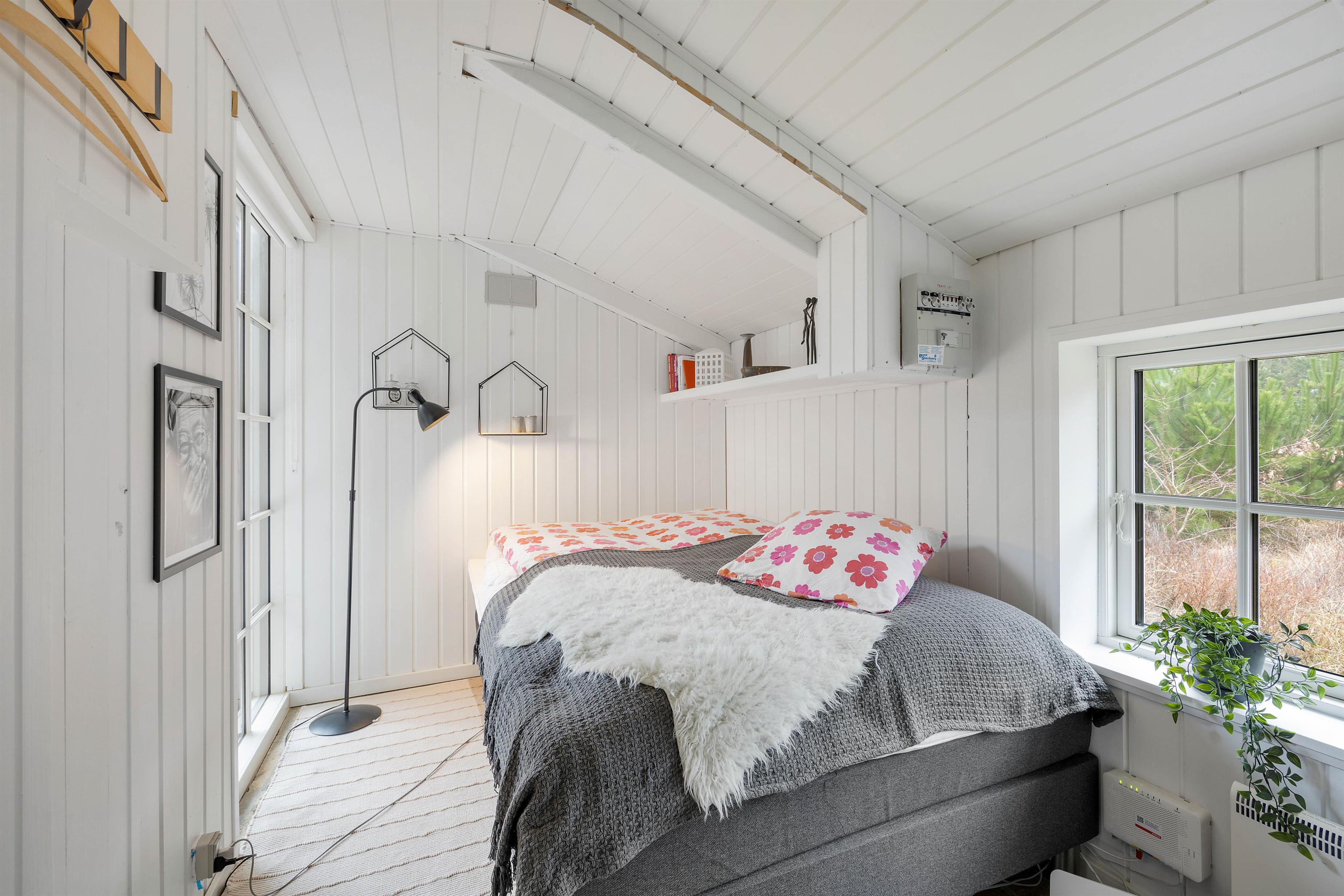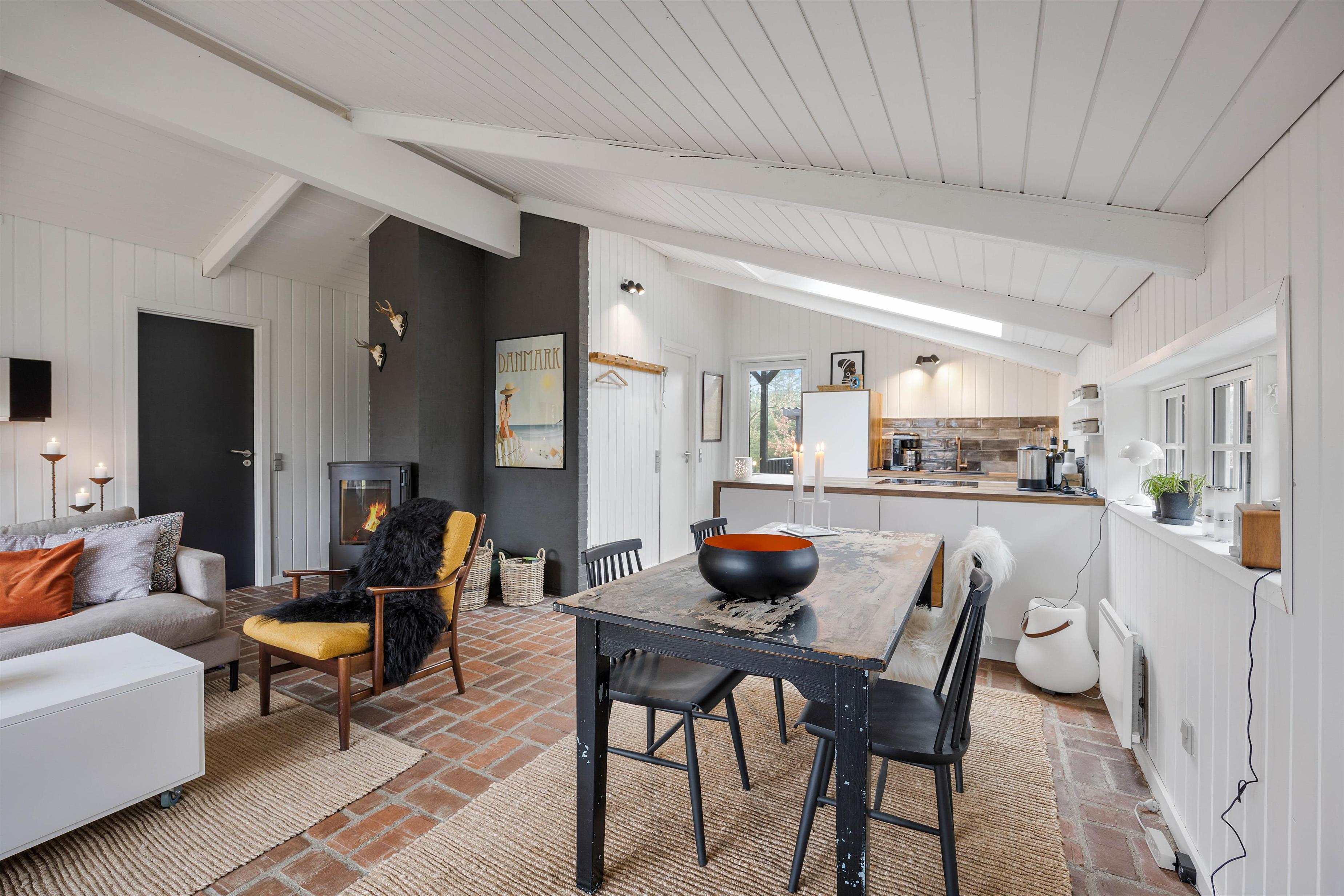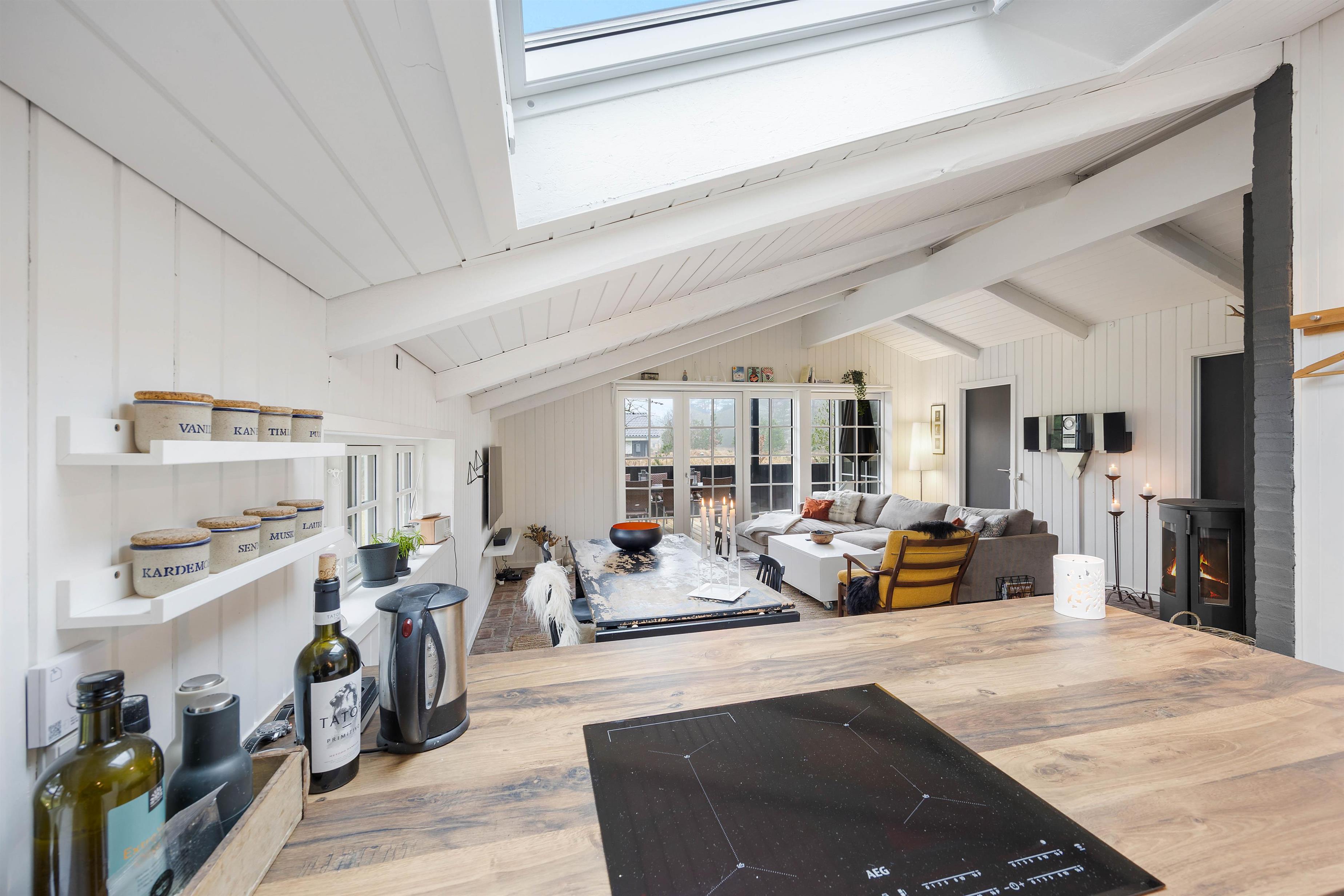 Sommerhuset har 3 gode værelser, hvoraf 2 har dobbeltsenge, og det sidste har en enkelt seng. Alle værelser ligger ud til opholdsrummet, hvor stue, køkken og spiseplads er samlet. Her er der god mulighed for at tilbringe mange timer sammen med fokus på nærvær og hygge – uanset om I er til brætspil, en god film eller en kop varm kakao, mens varmen fra brændeovnen spreder sig i hele sommerhuset.