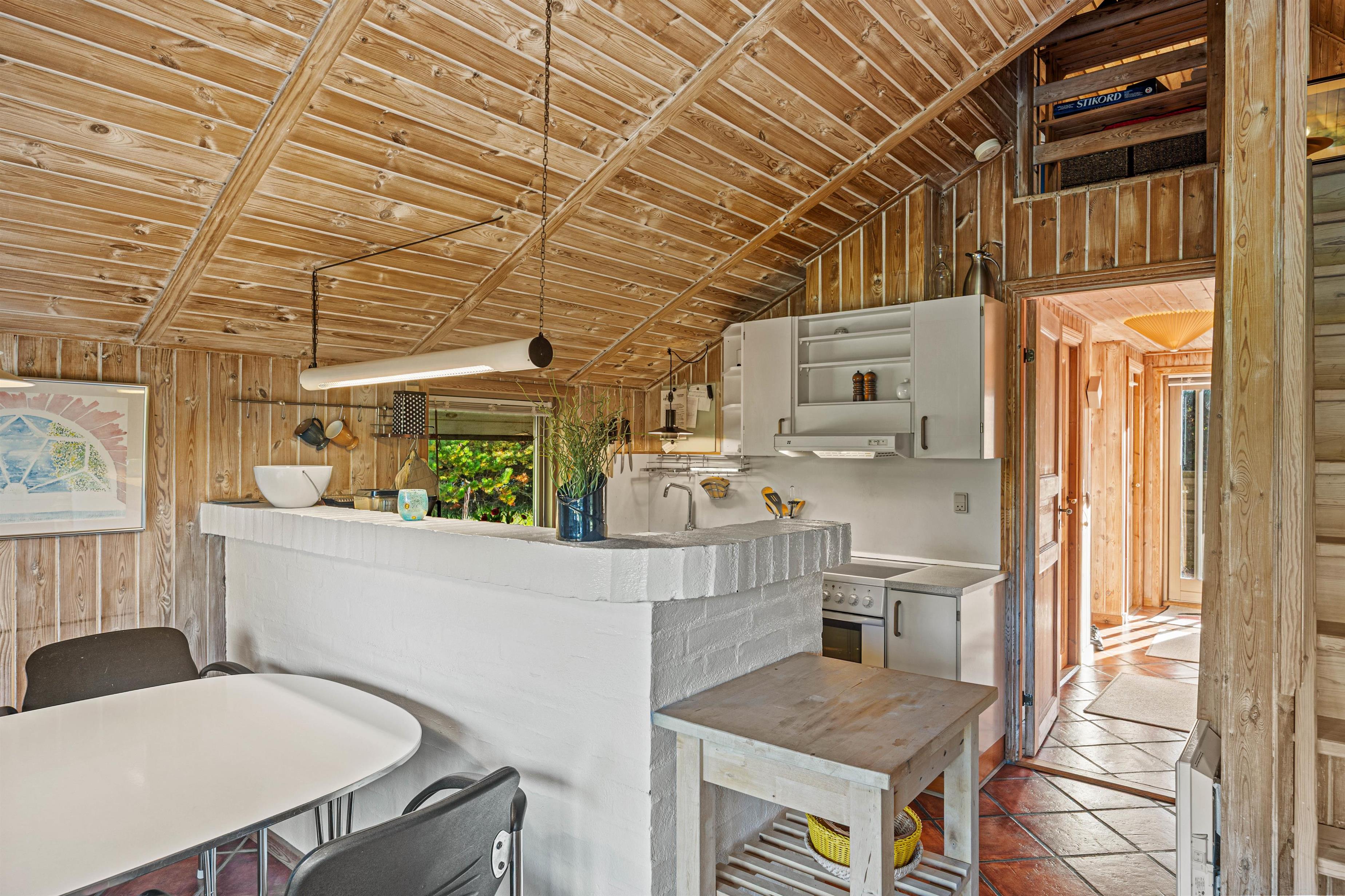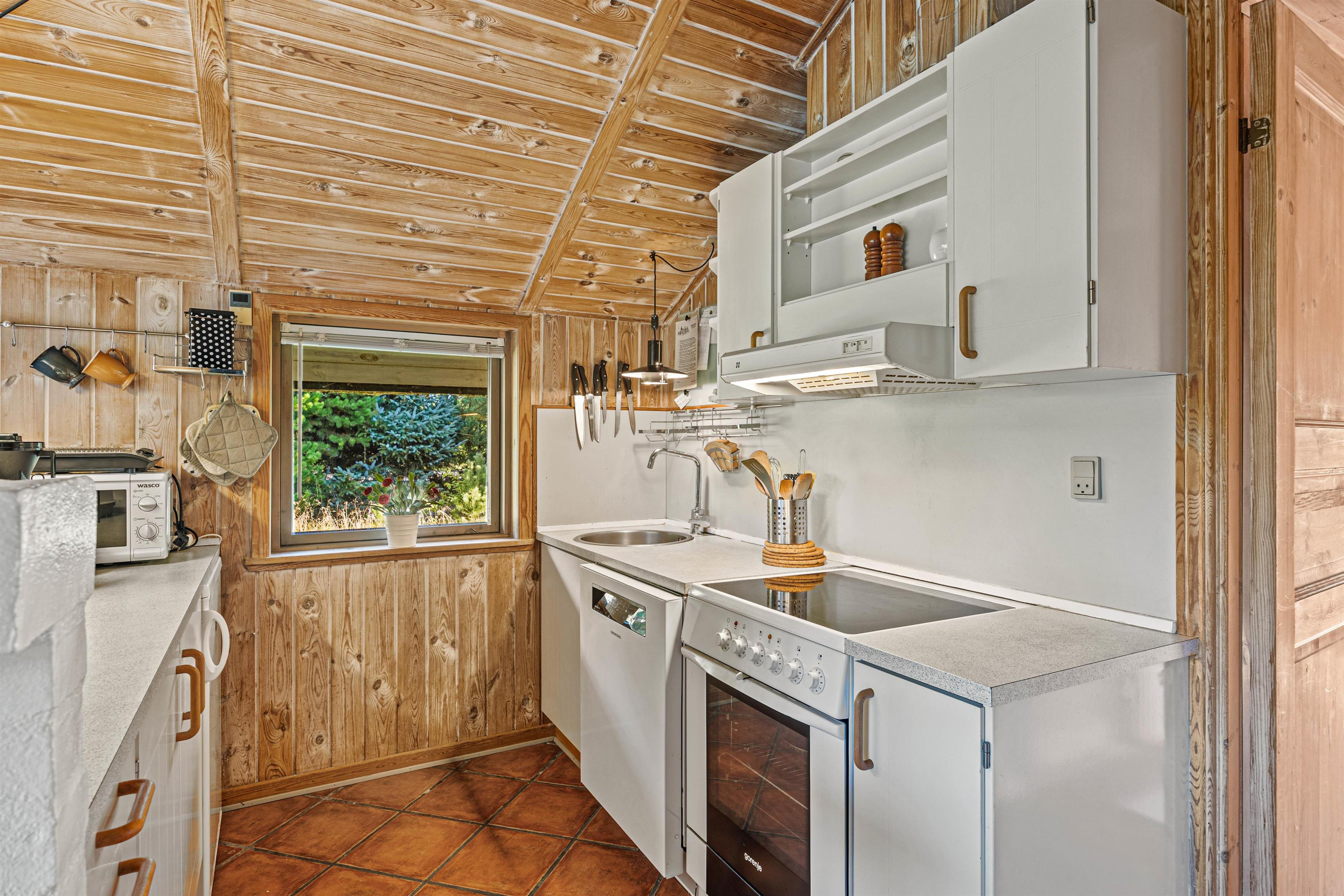 Stuen med det åbne køkken er midtpunktet i dette skønne hus. Her kan I sammen tilberede dagens måltider, spille spil og i det hele taget bare tilbringe mange hyggelige stunder med hinanden. På sofaen kan I slappe af og nyde udsigten til den omkringliggende natur gennem vinduerne, og på kolde dage sørger brændeovnen for både varme og en helt speciel ferieatmosfære.