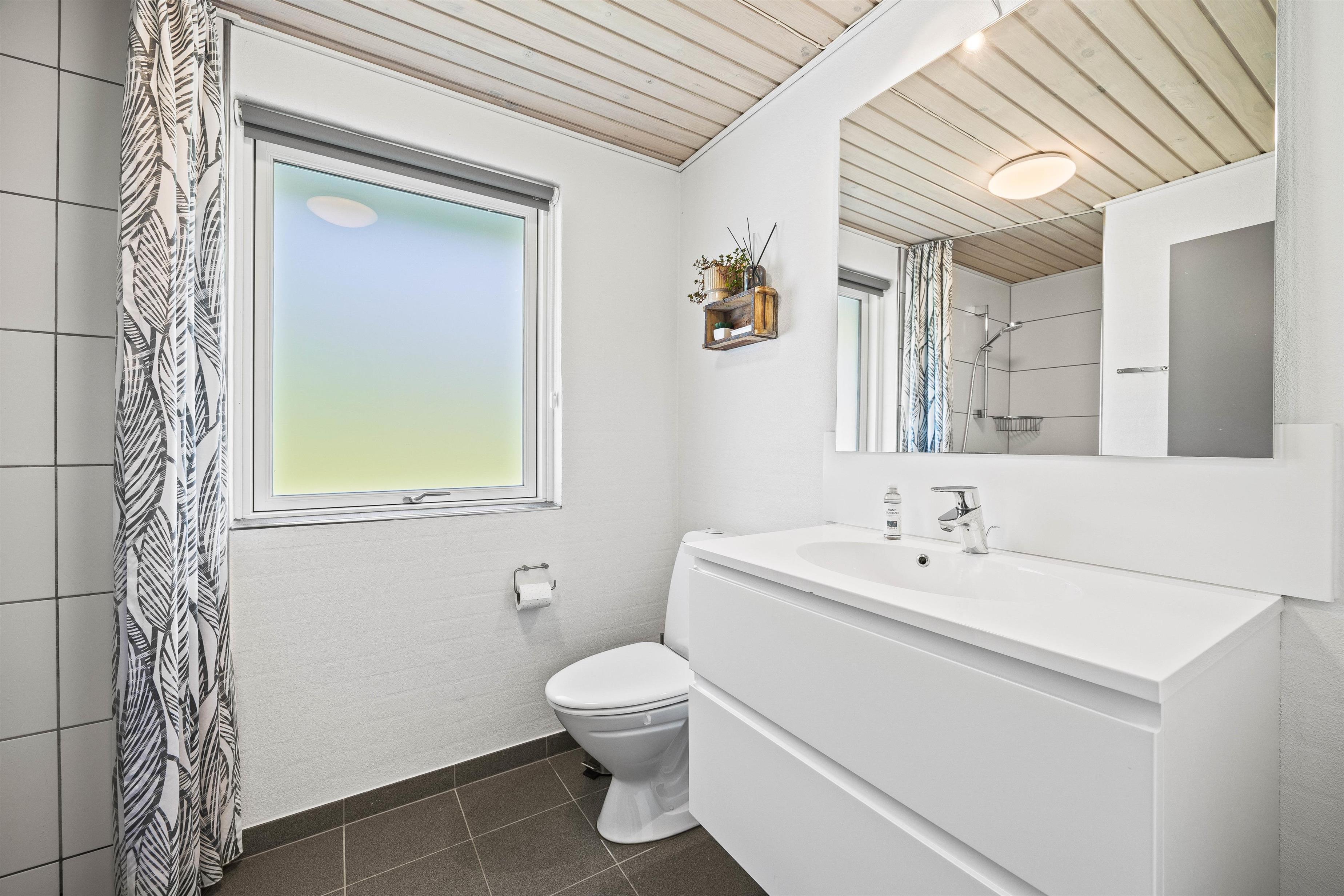 Feriehuset er opført med 2 soverum med god skabsplads, og et flot renoveret badeværelse med gulvvarme. I vil også nyde godt af den store dejlige bryggers med gulvvarme, hvor der også er installeret en vaskesøjle.