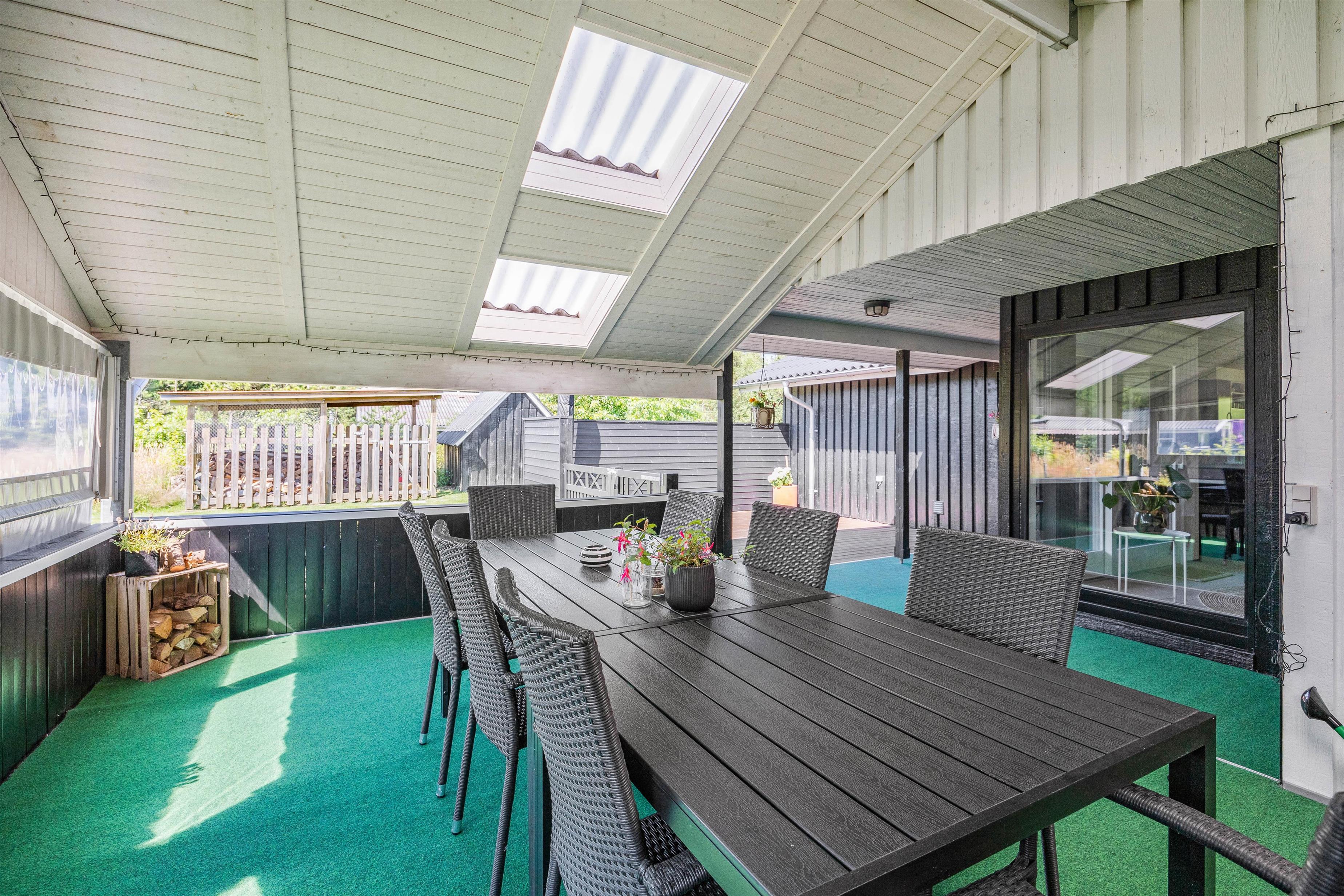 Terrassen er et kapitel for sig selv. Den flotte overdækkede terrasse skaber rammen om mange lyse sommeraftener, hvor børnene enten leger i sandkassen, eller spiller bold på den store grund. Alt imens I får et dejligt glas rødvin, og grillen lige er blevet tændt og dufter i baggrunden.
