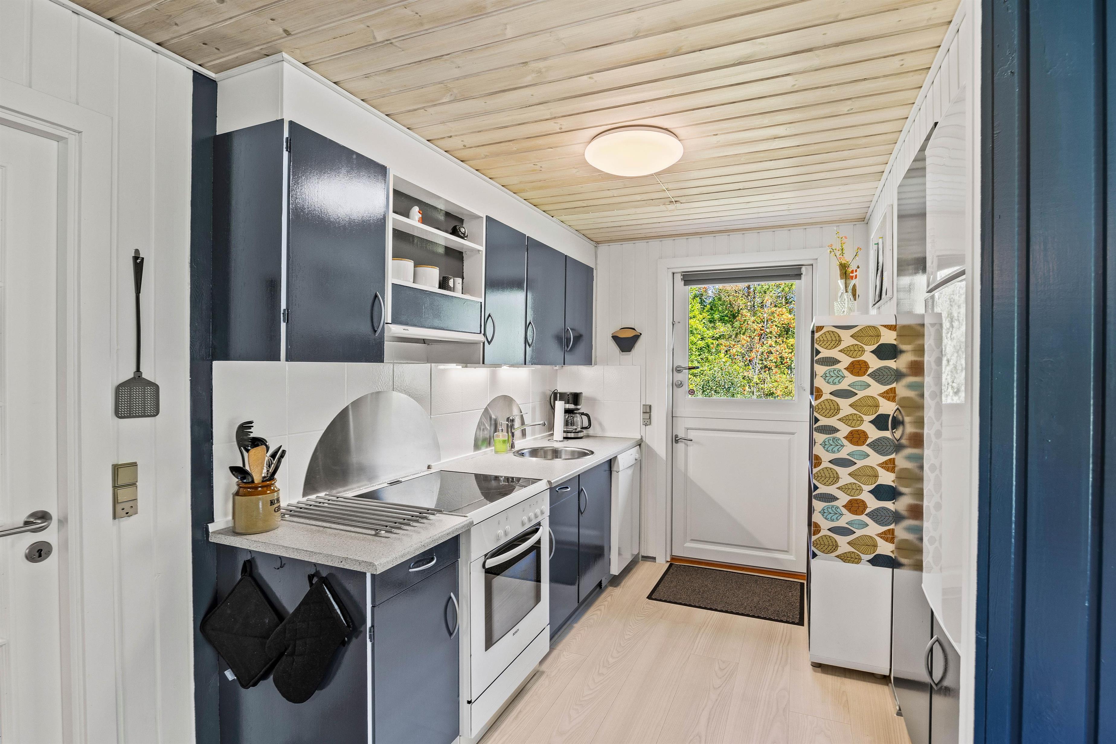 Velkommen indenfor på Hedevang. Du vil her blive mødt af et funktionelt køkken i åben forbindelse til stuen. I køkkenet er der installeret en opvaskemaskine, så I som familie kan lade maskinen arbejde, og selv komme ned i gear og ikke tænke over opvasken. I vil i huset med det samme kunne mærke sommerhusstemningen, med de lyse vægge og den skandinaviske stil. Lænestolene står klar foran brændeovnen og tv’et, til I kommer hjem fra en dejlig gåtur i det fantastiske område, som I finder i Houstrup.