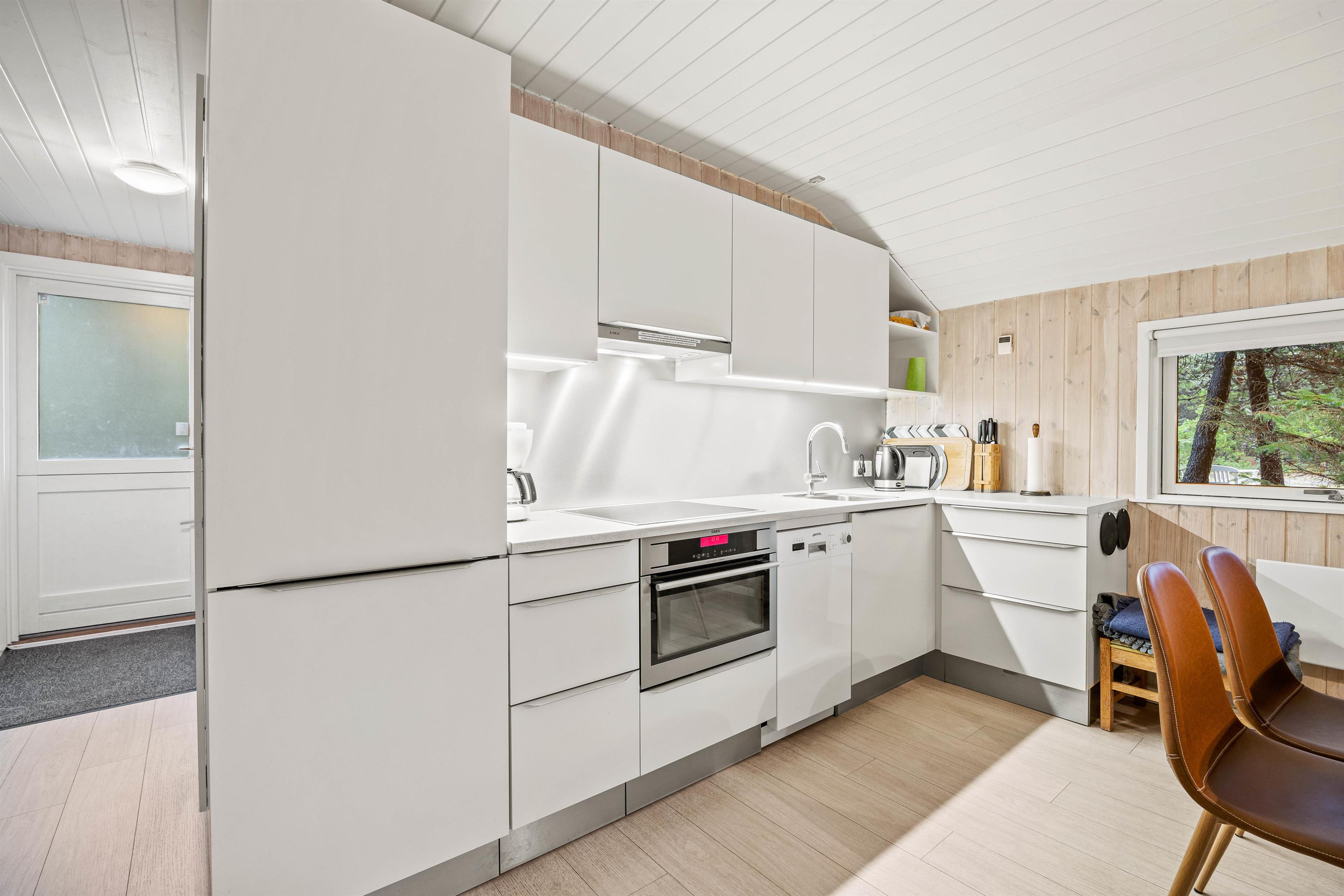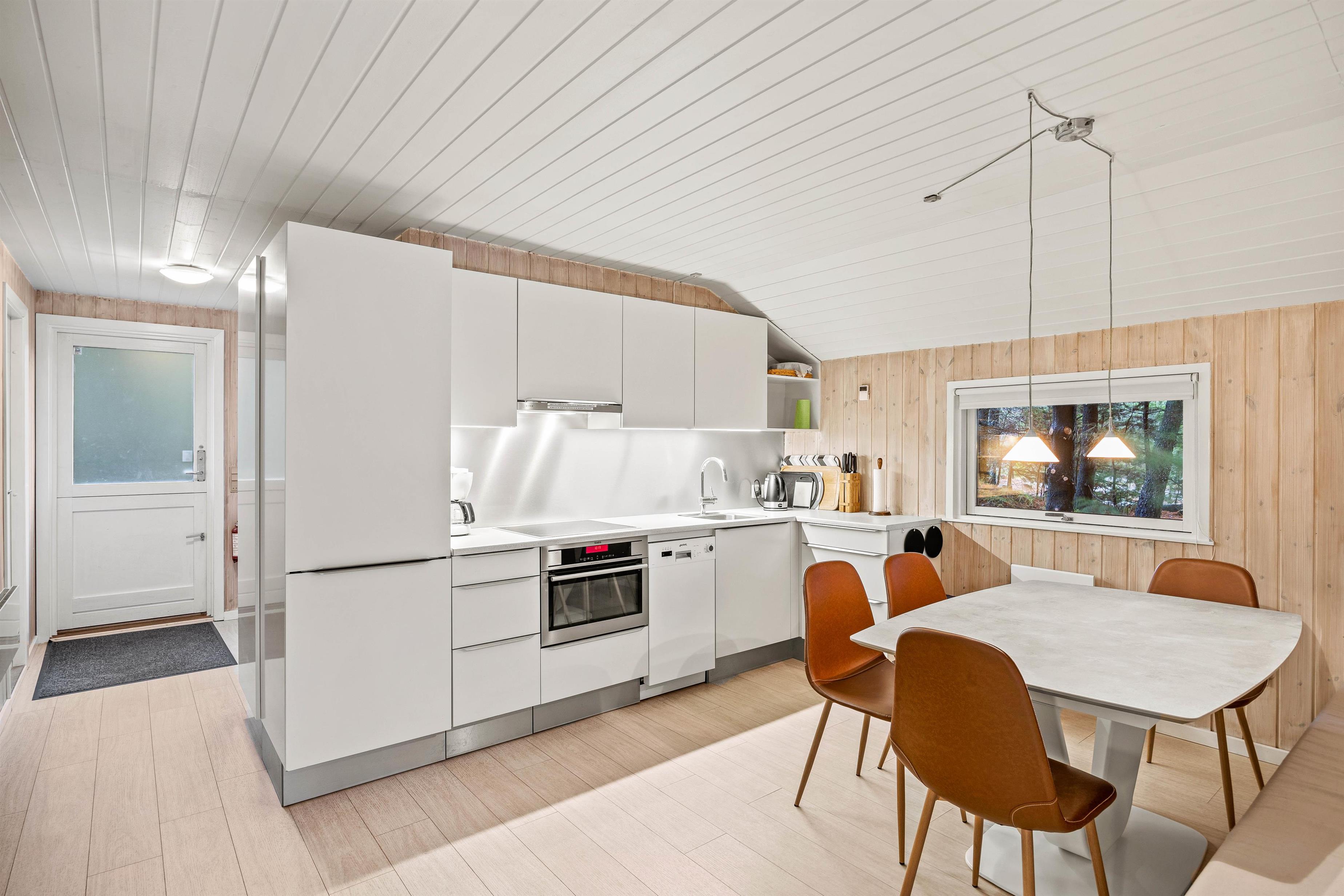 Indenfor finder I et dejligt indrettet hus med lysnede vægge, et pænt lyst køkken og et nyere badeværelse med gulvvarme og vaskemaskine. Huset er indrettet med 2 soveværelser med dobbeltsenge og et køjerum med 4 senge. Ved det store spisebord i køkken-alrummet er der rigelig plads til at samles til god mad og lange spilleaftener, men man kan også vælge at forkæle sig selv med en tur i husets sauna.