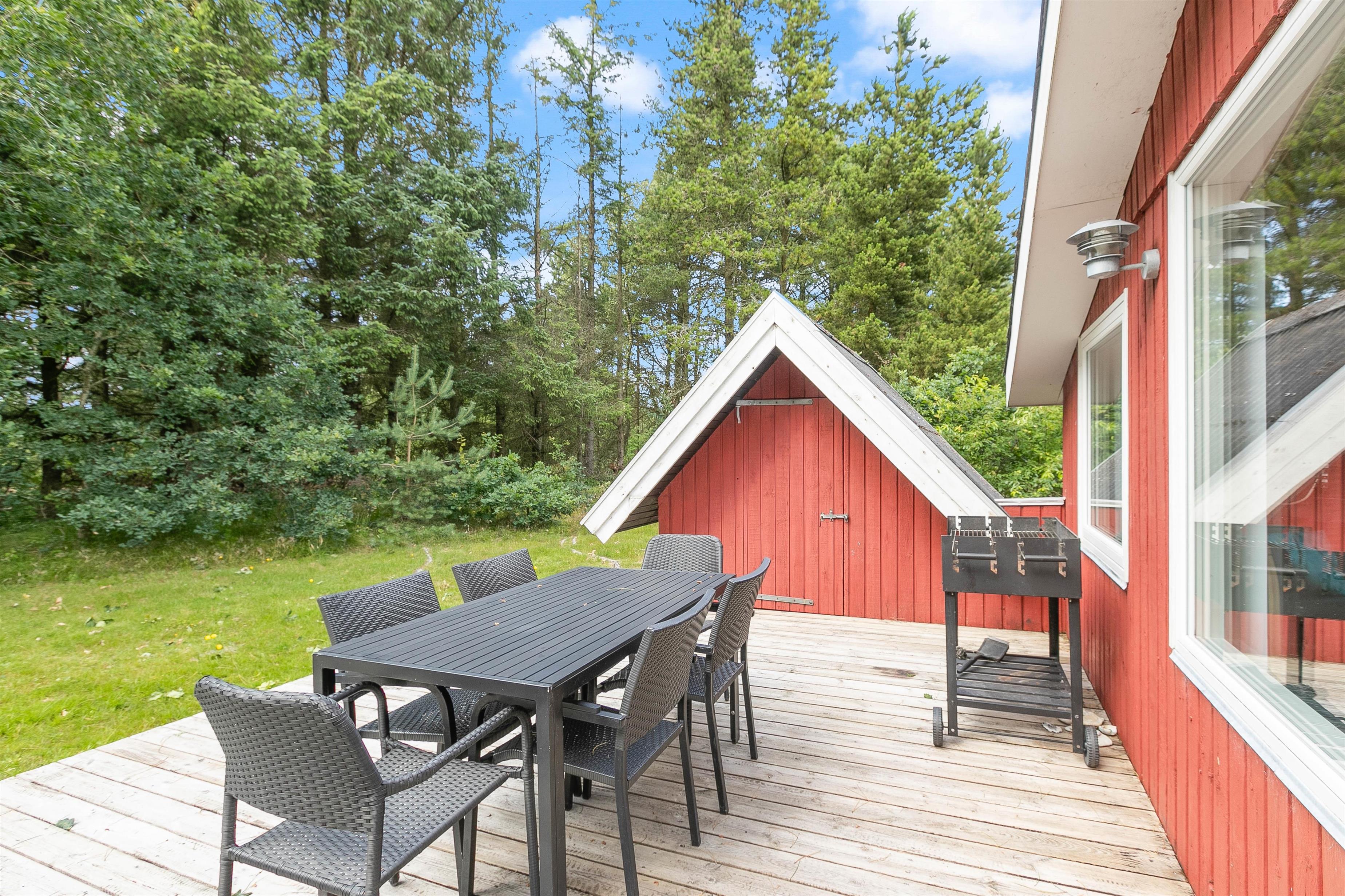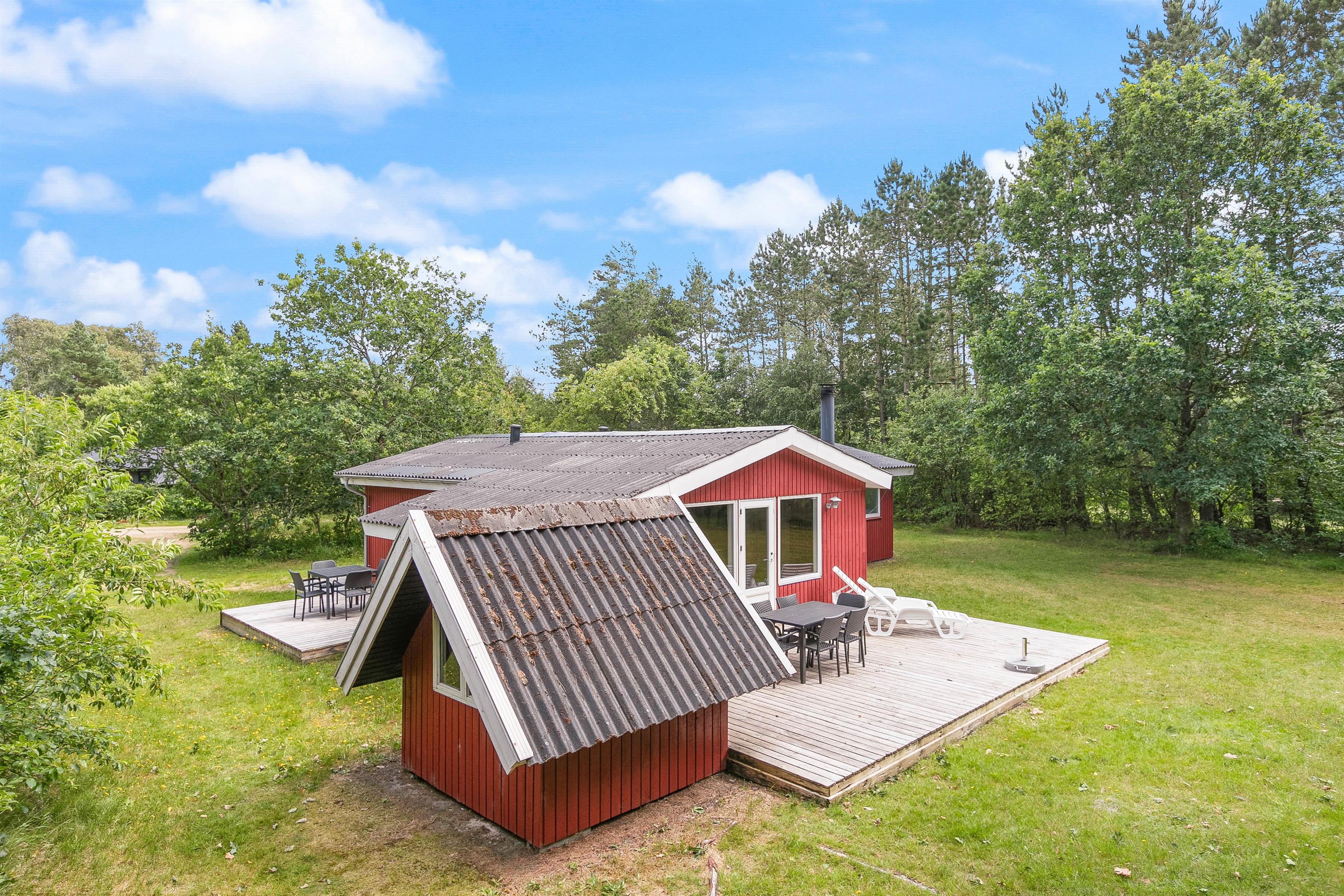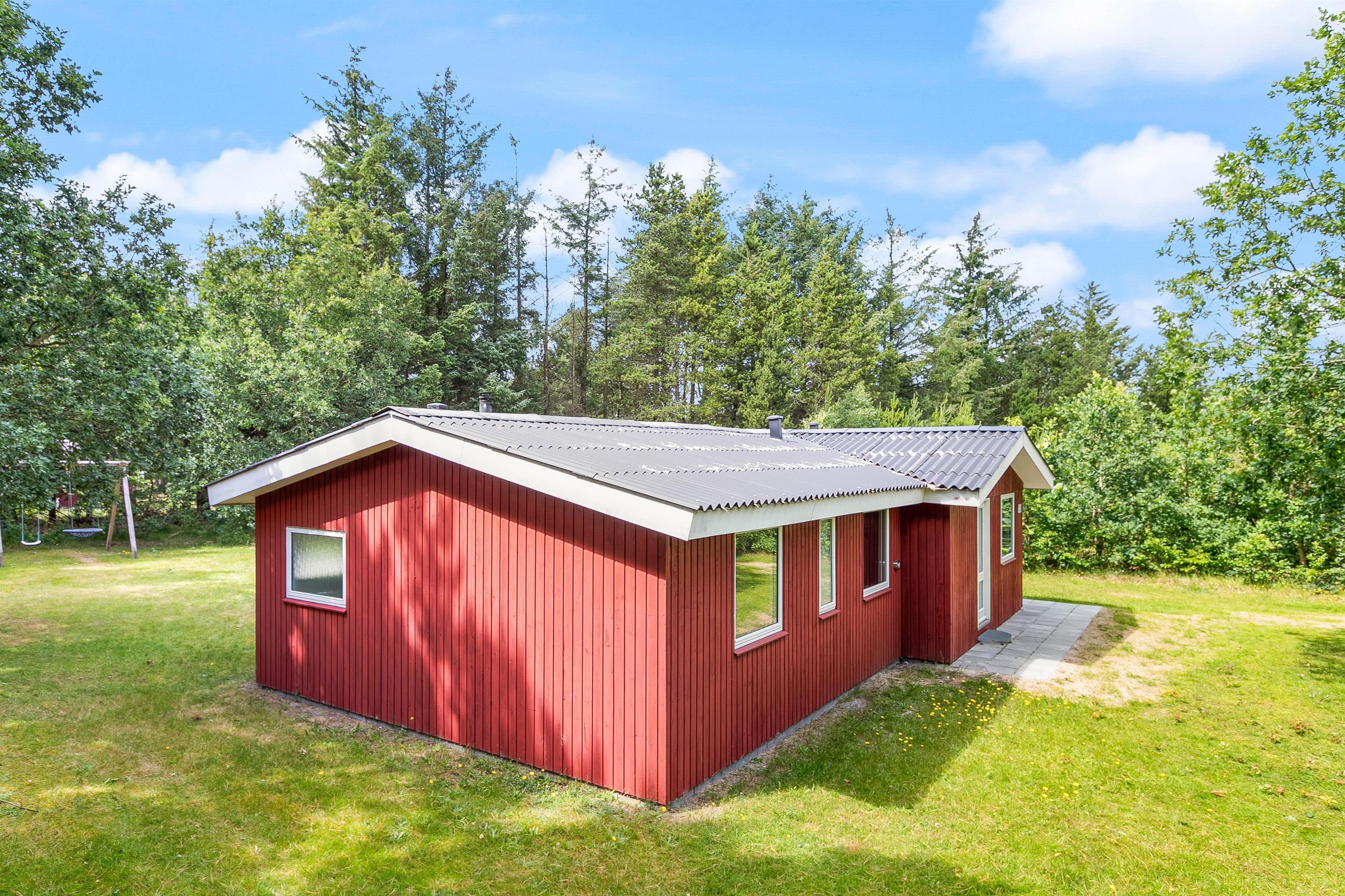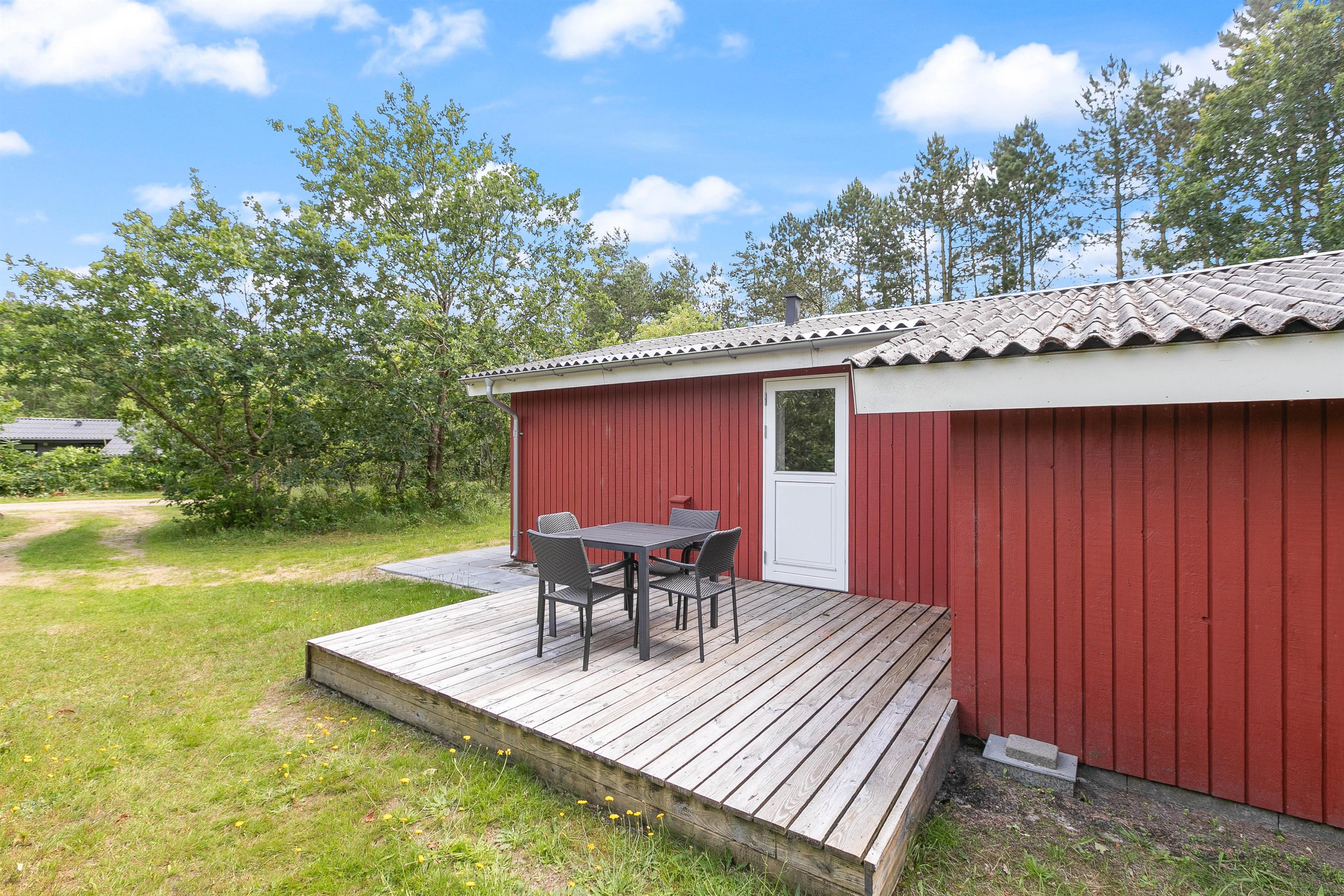 Blandt skovens dyr og de høje træer står dette fine sommerhus og venter på jer. De røde brædder og den smukke natur i baggrunden maler et idyllisk billede af en vaskeægte sommerhusferie i dejlige og rolige omgivelser. Her kan I helt sikkert holde en skøn feri
