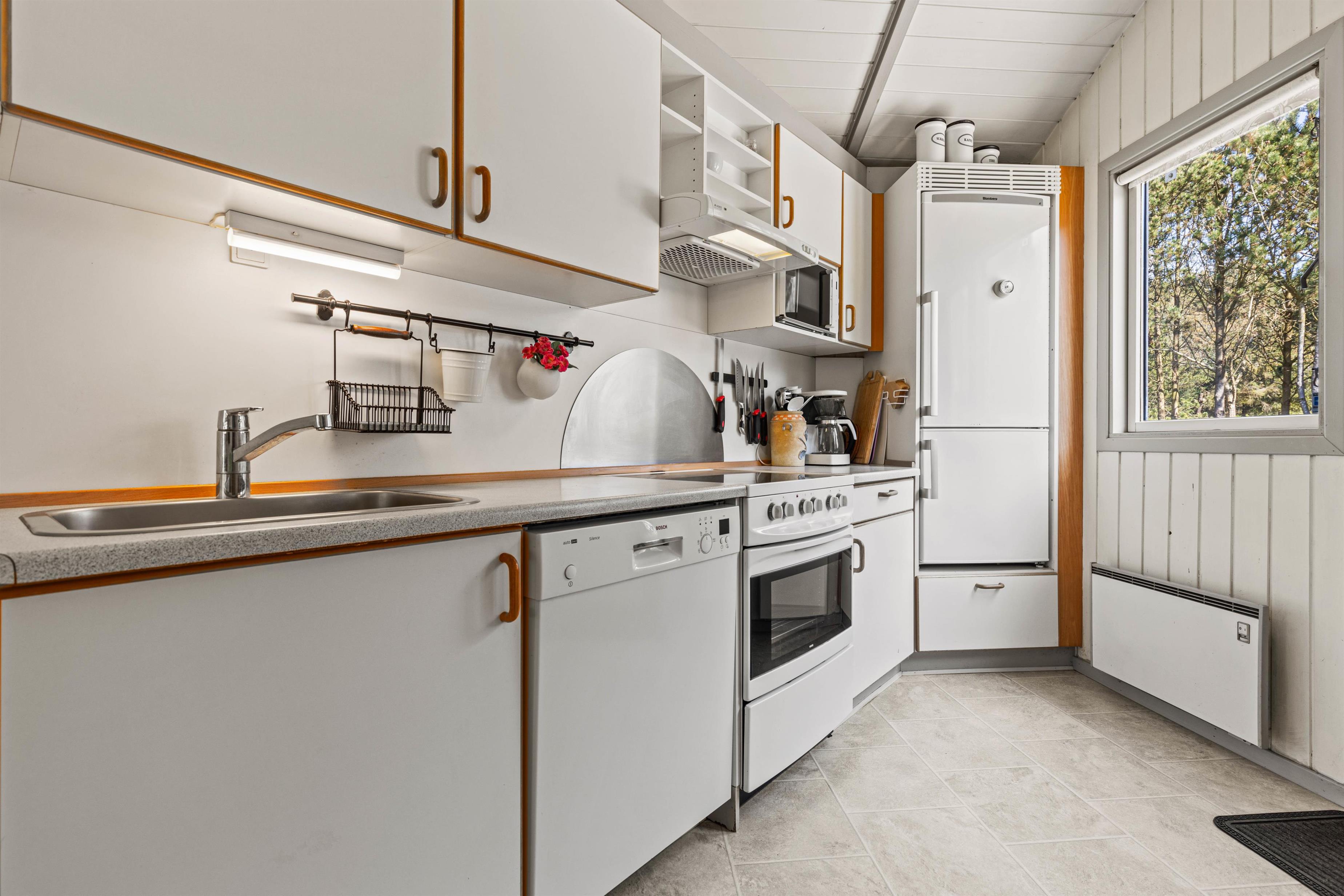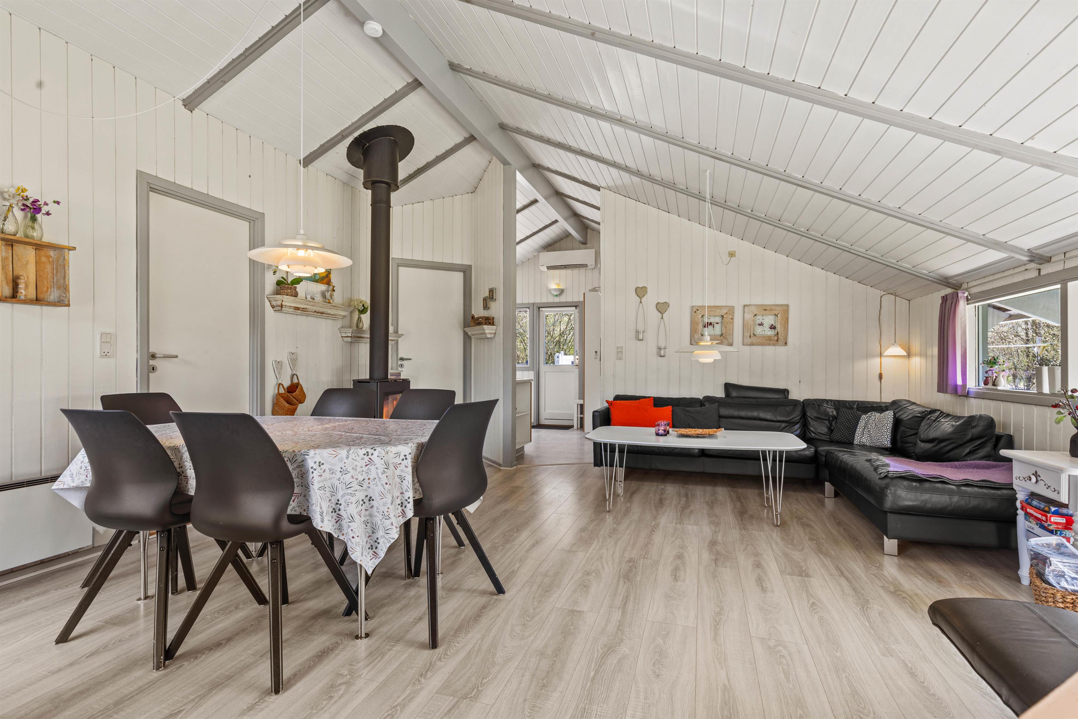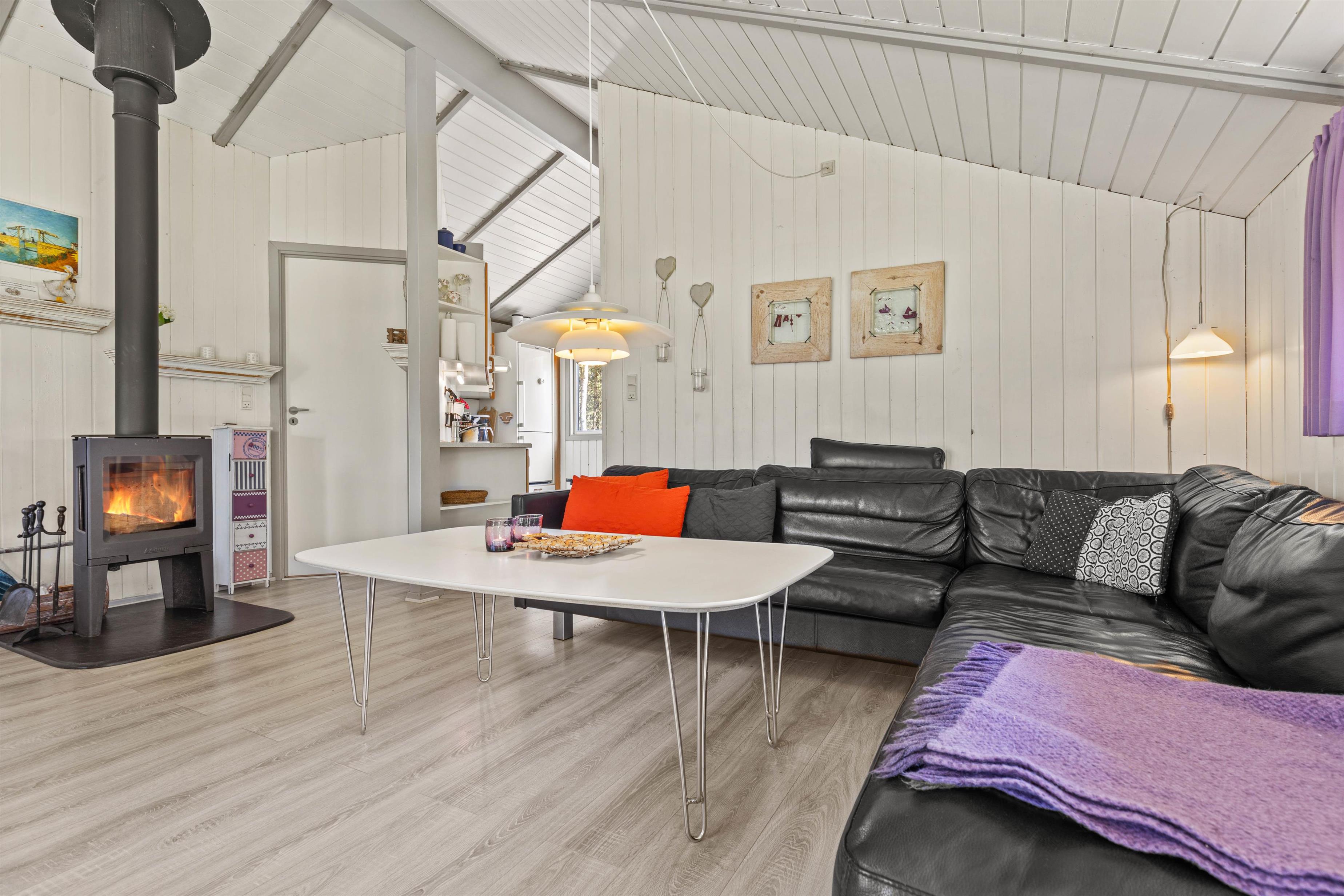 Det er et dejligt stemningsfyldt hus skabt til fællesskab og feriehygge: Køkkenet og spiseafdelingen står i åben forbindelse med opholdsstuen, hvor det, når dagen går på hæld, er ekstra skønt at tænde op i brændeovnen for ekstra varme og gyldent lys, når der skal slappes af i den bekvemme sofa.