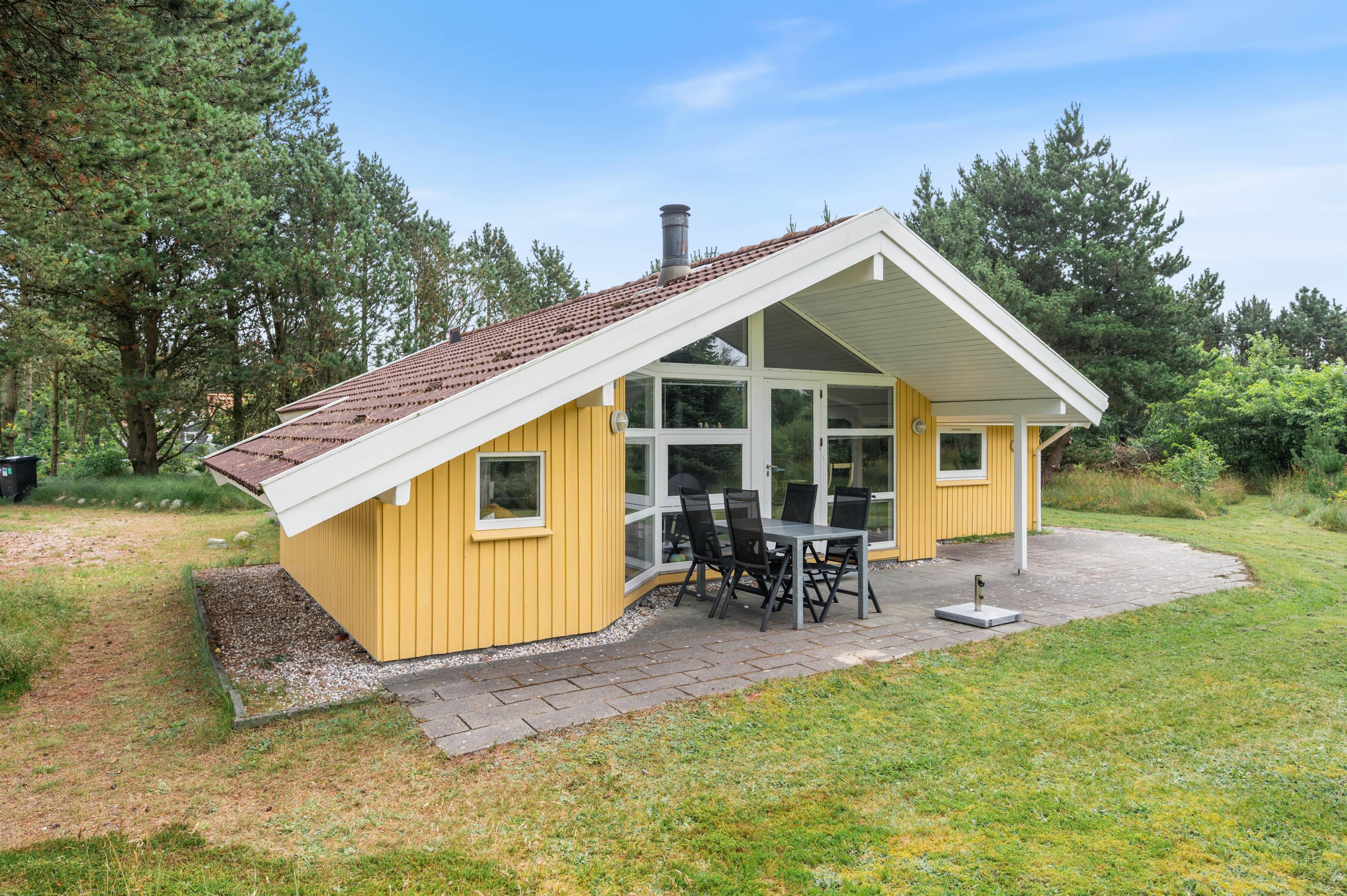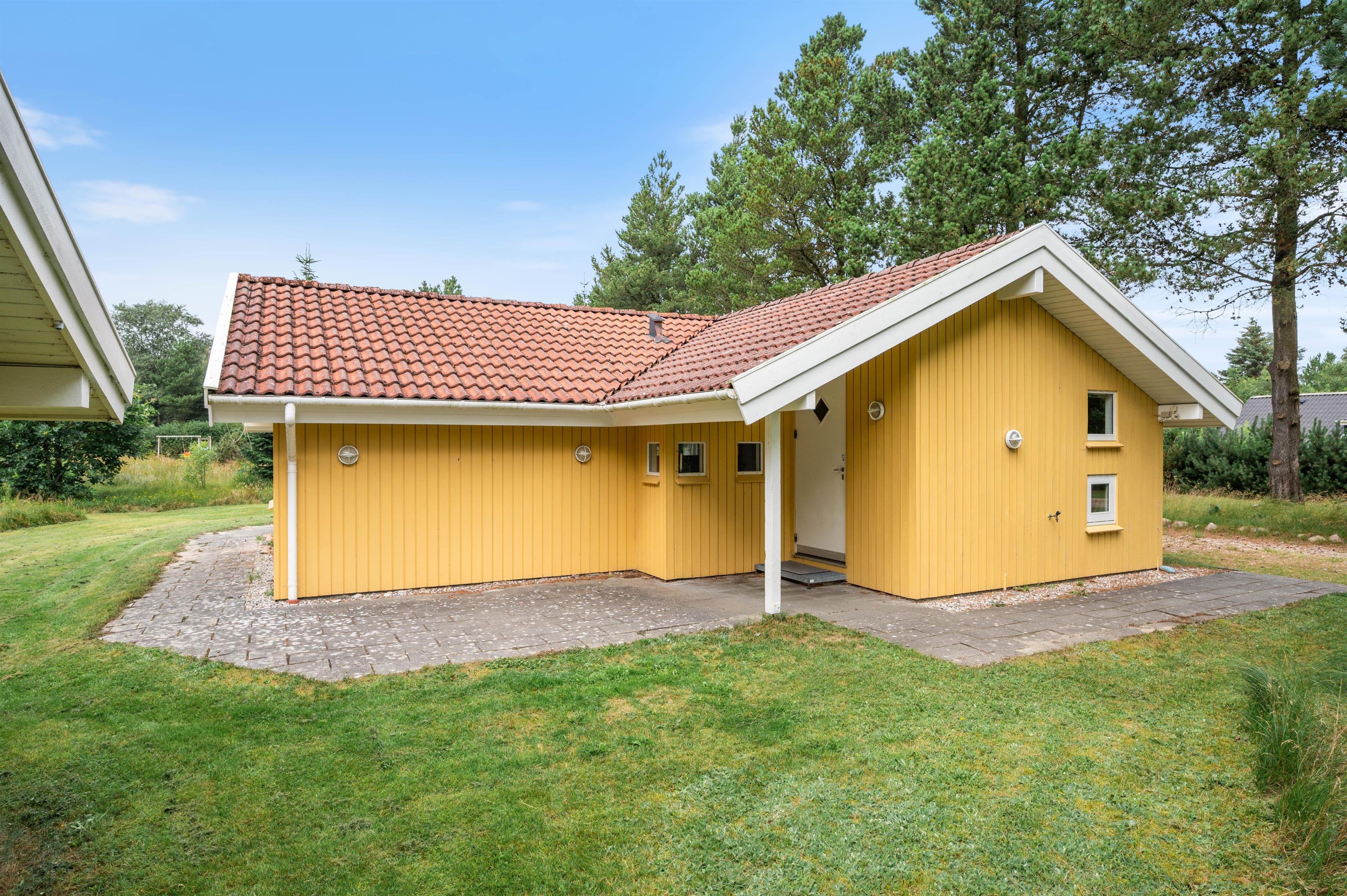 På en stor, grøn plænegrund midt i Houstrups fredfyldte ferieområde står dette klassiske træhus og venter på jer. De gulmalede brædder og de smukke naturomgivelser sætter rammerne for en dejlig og afslappende sommerhusferie i det fri.