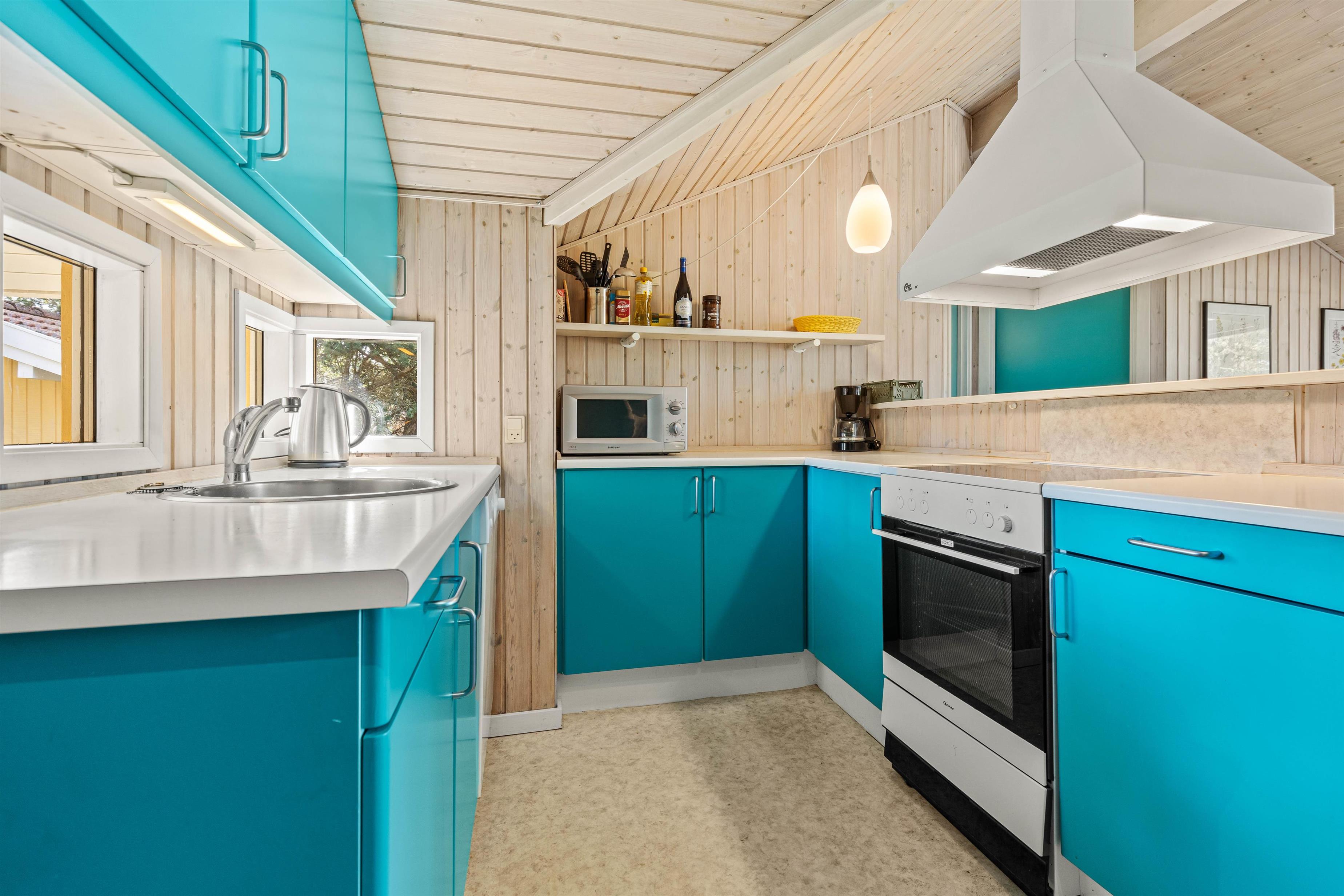 Der er både tænkt på hyggen, på det praktiske, og det veludstyrede sommerhus råder blandt andet over en opvaskemaskine, mikroovn og vaskemaskine.