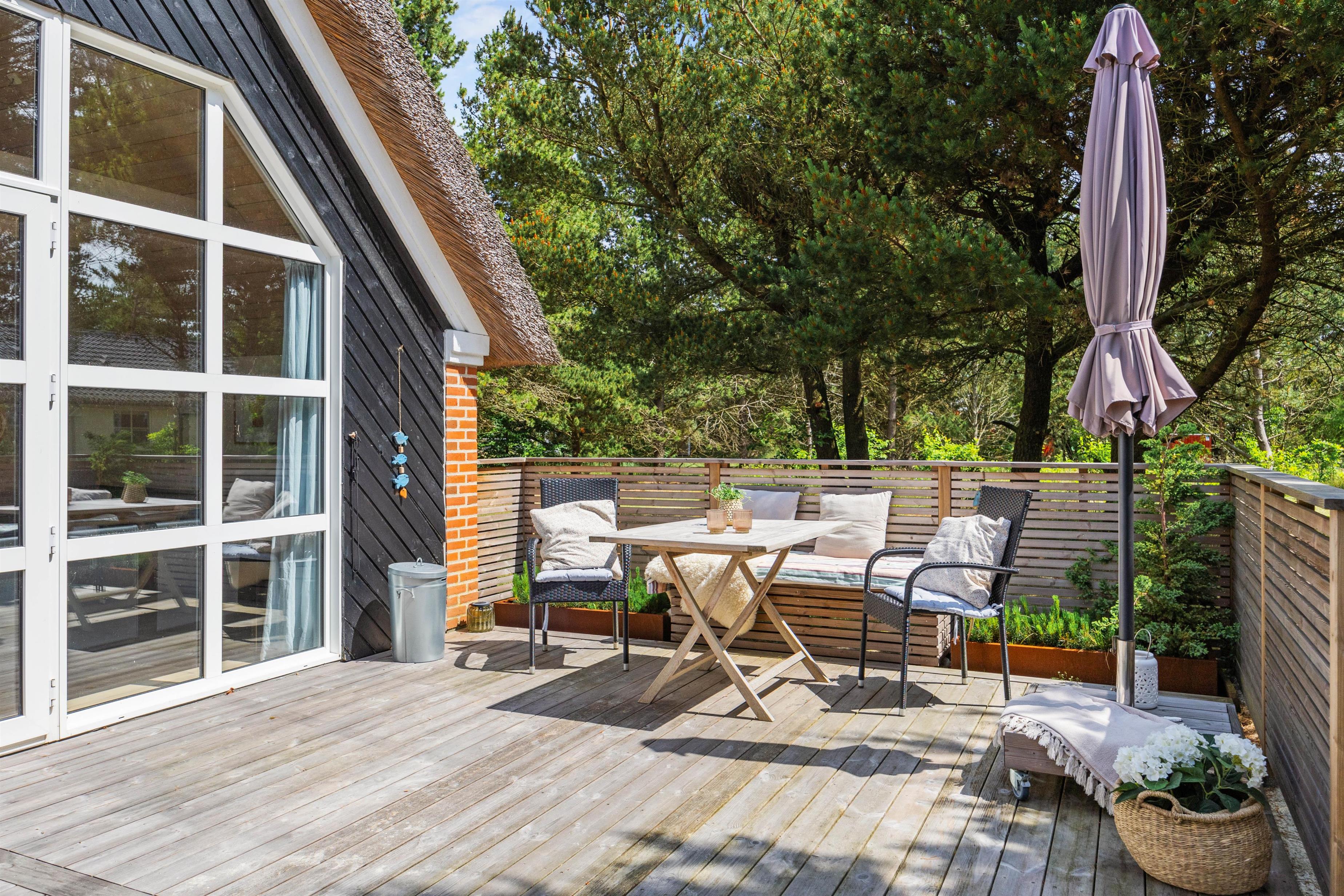 Med en grund på 1503m2 er der rig mulighed for udendørs aktiviteter og hygge. Ude finder I både en åben og afskærmet terrasse, som er udstyret med grill og havemøbler, perfekt til en aften med burger og familiehygge. Derudover er der solvogne og parasol til solskinsdagene, så I kan nyde solen i komfort.