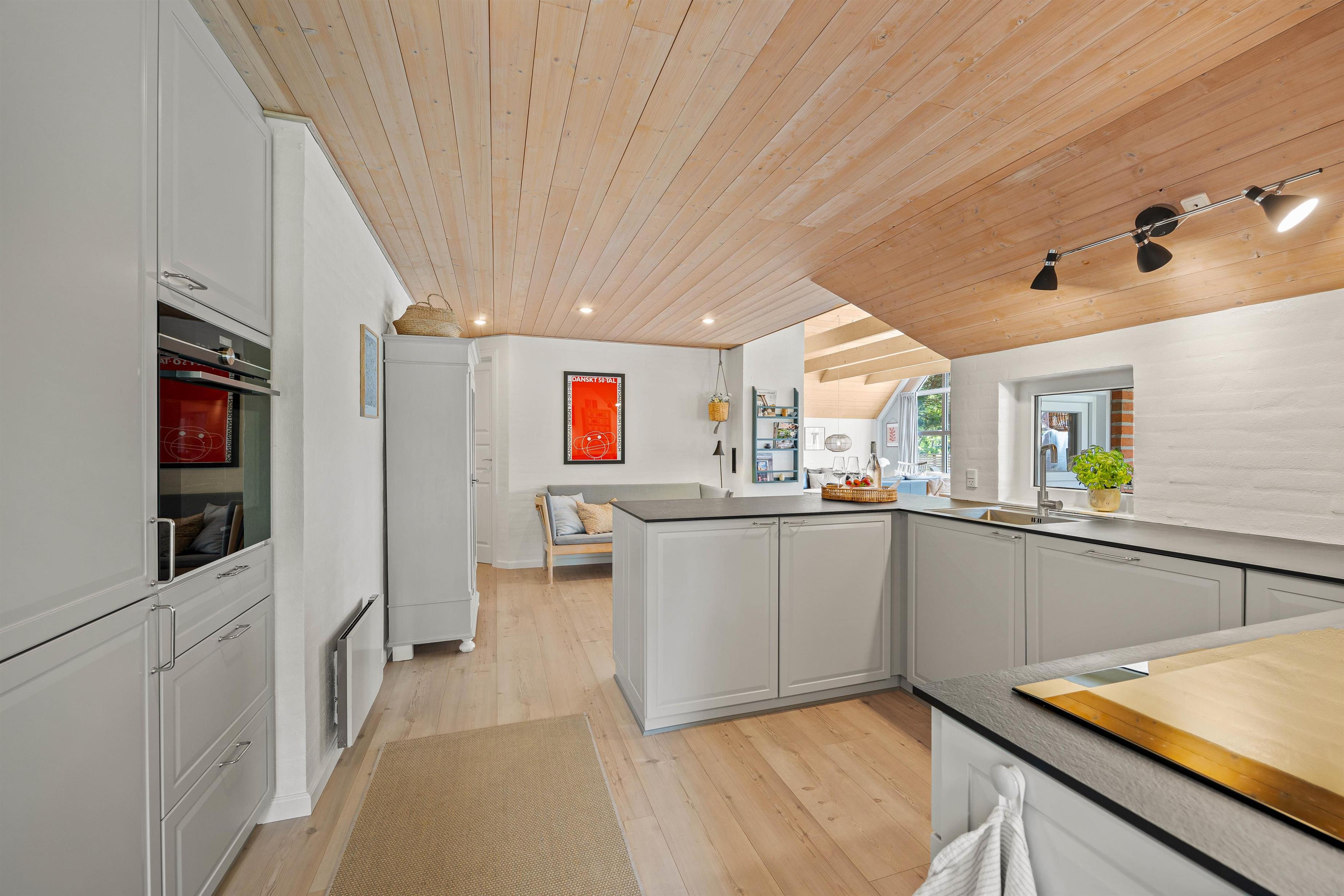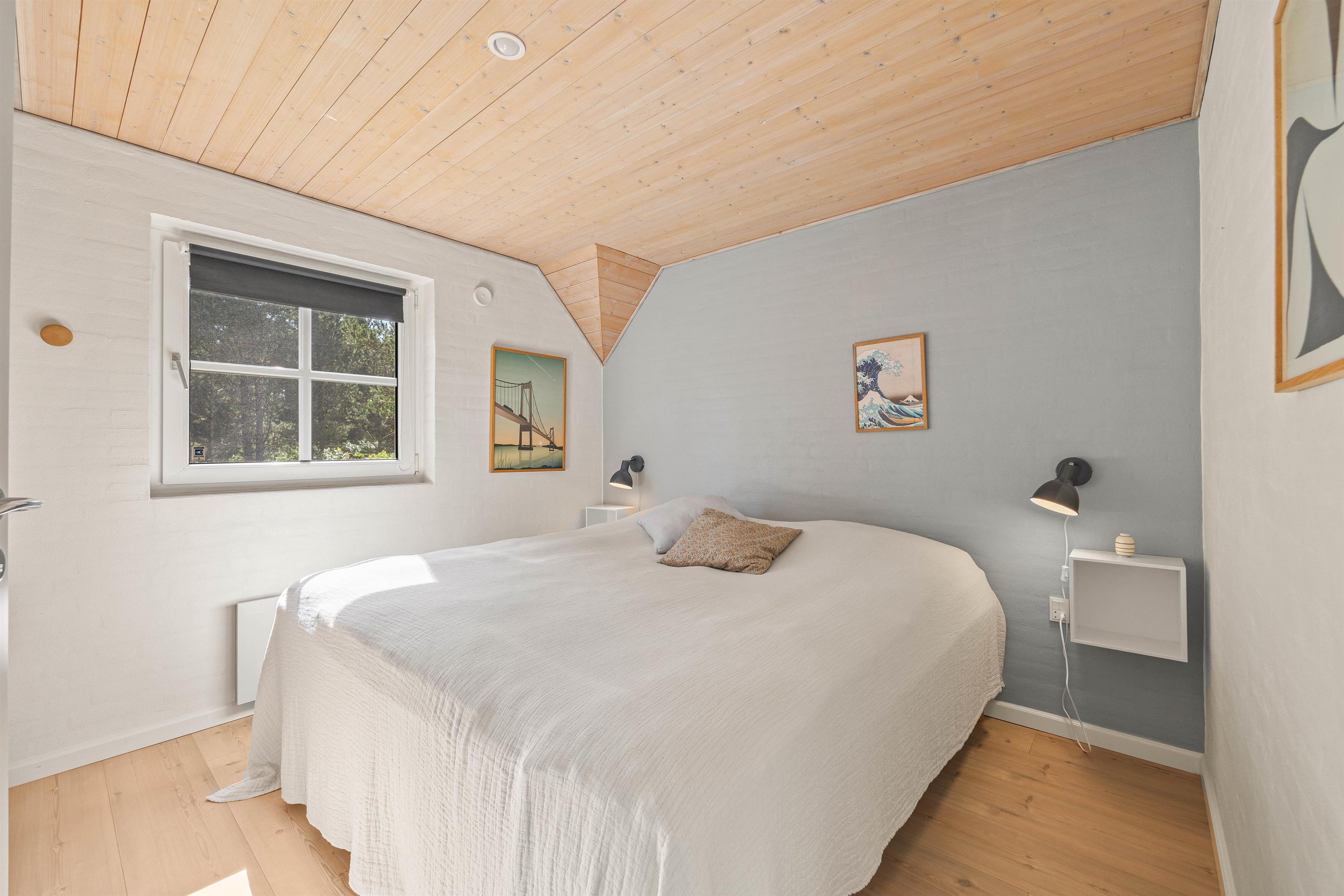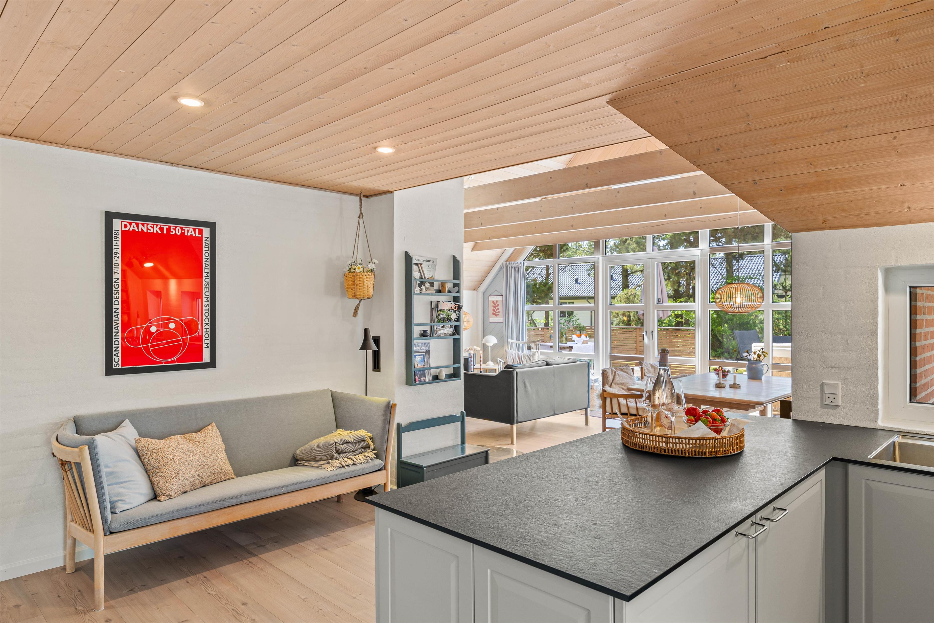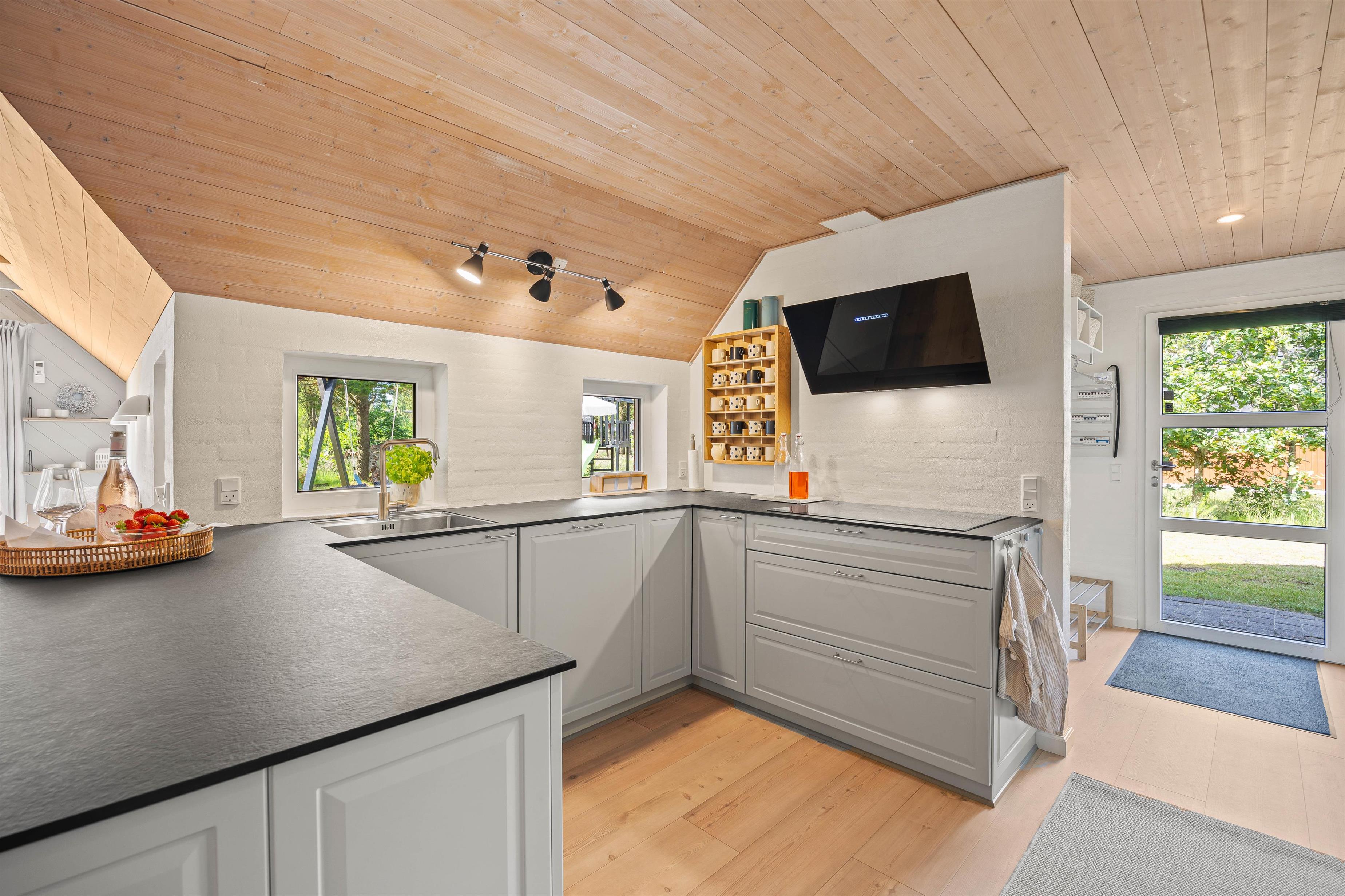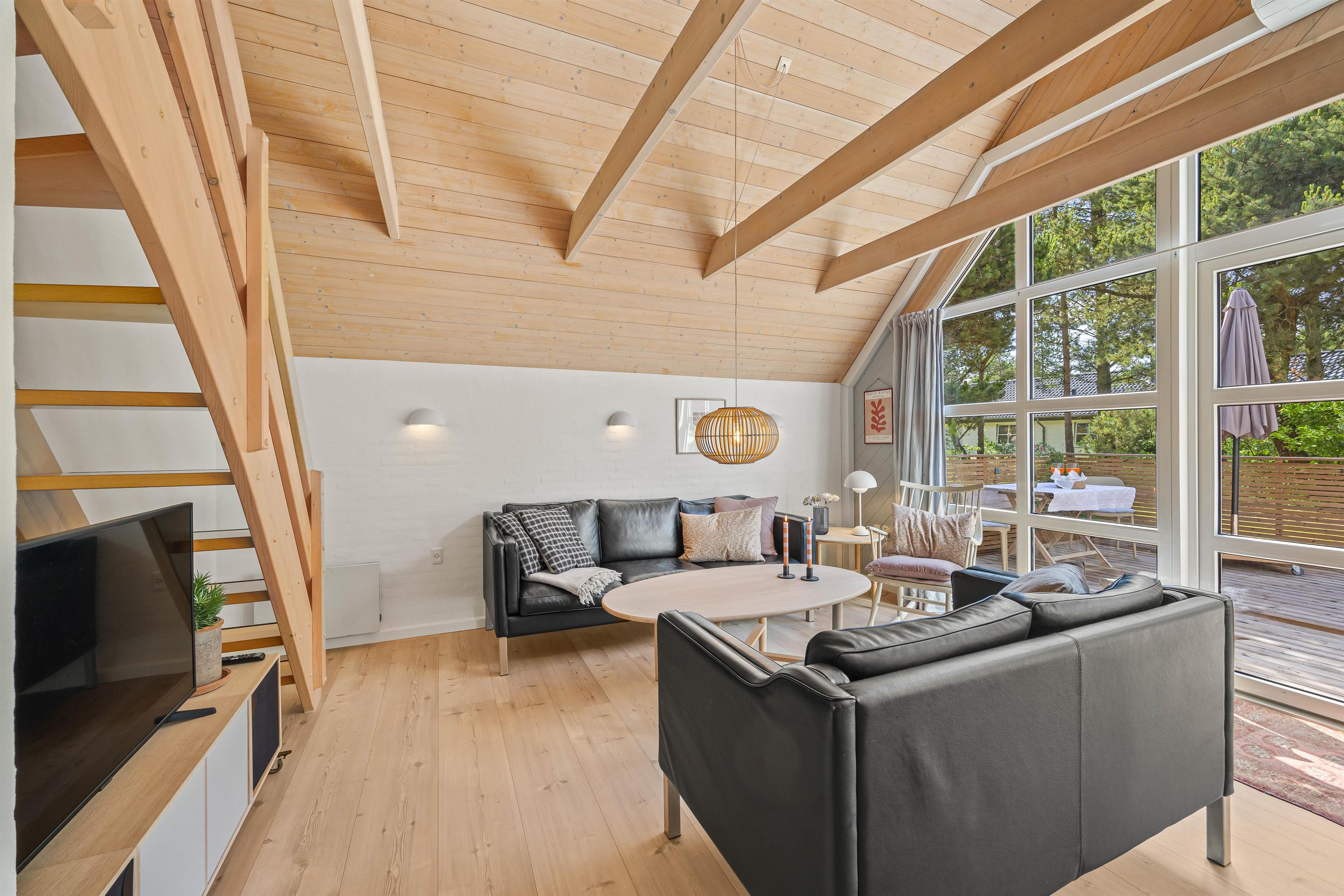 Sommerhuset er lyst og indbydende med de blottede bjælker i loftet, hvilket tilføjer en ekstra dimension af hygge og charme. I køkkenet finder I en praktisk opvaskemaskine, så I hurtigt og nemt kan komme ud på dagens eventyr langs vestkysten.