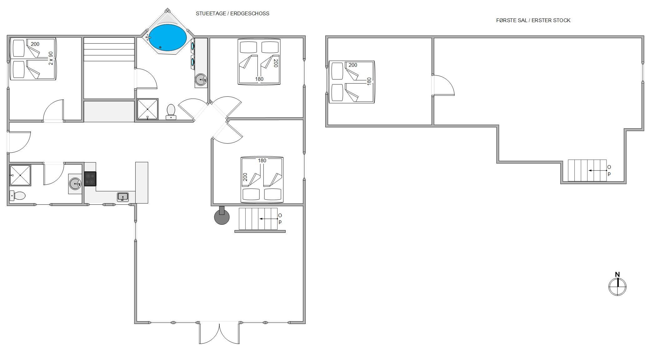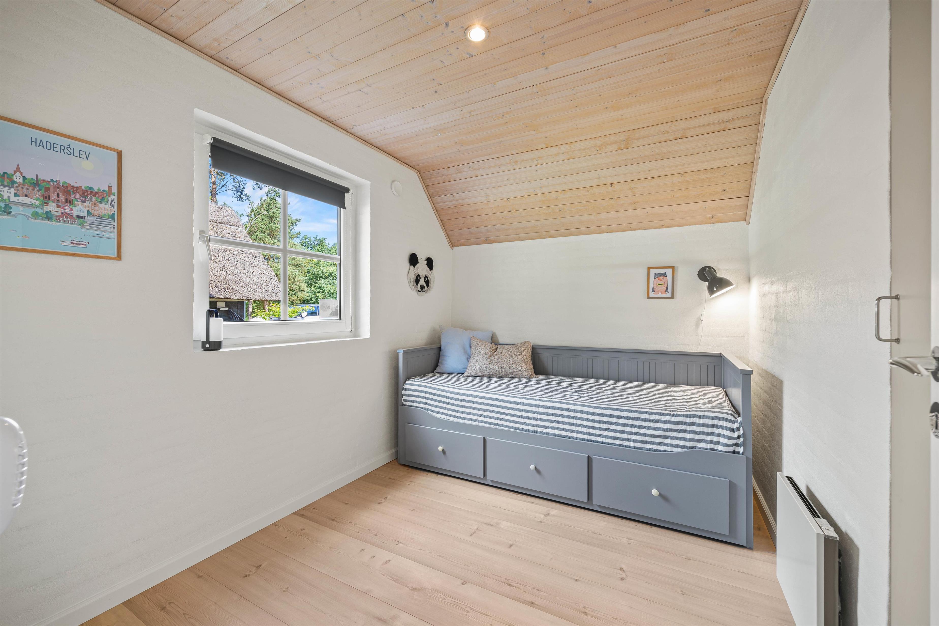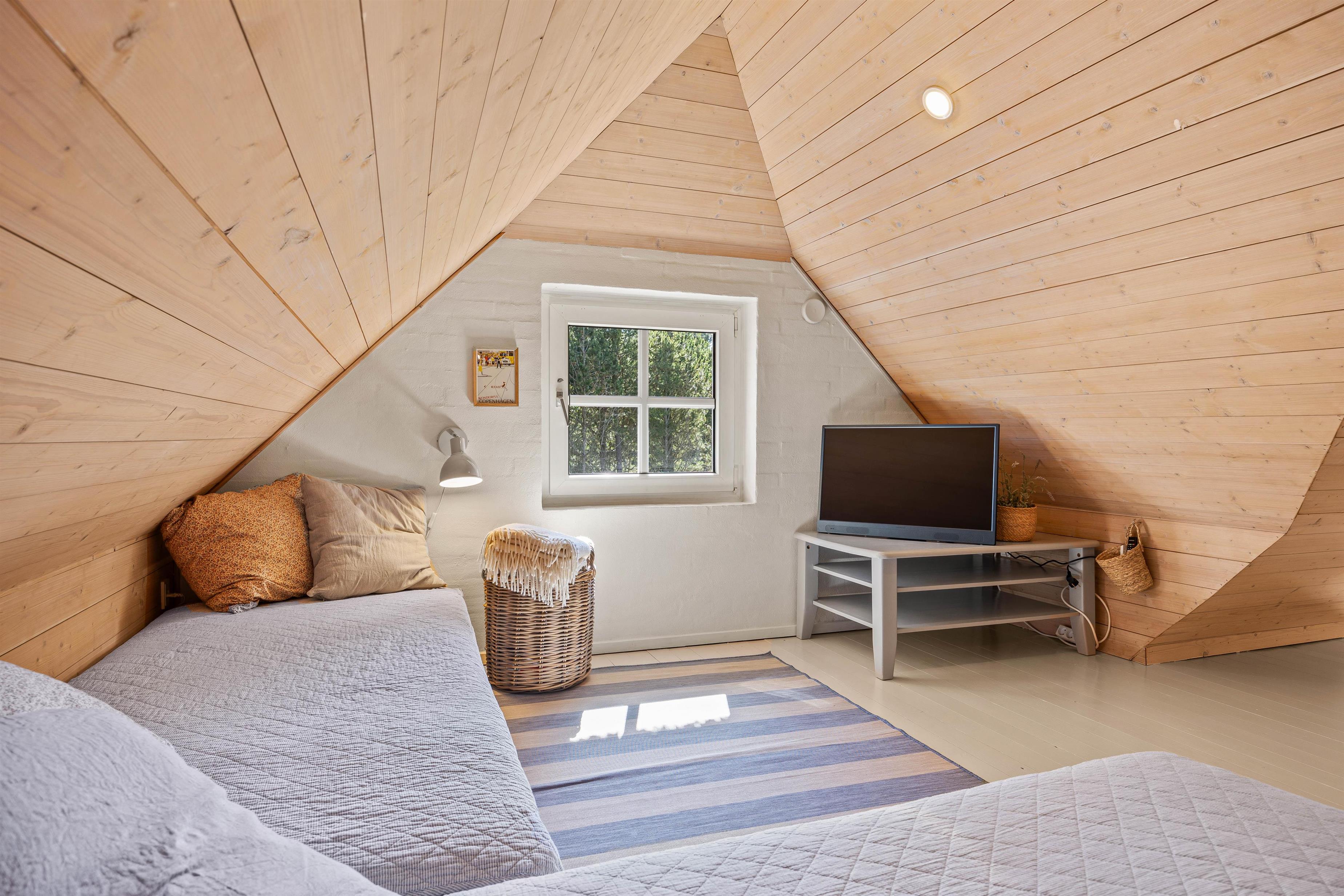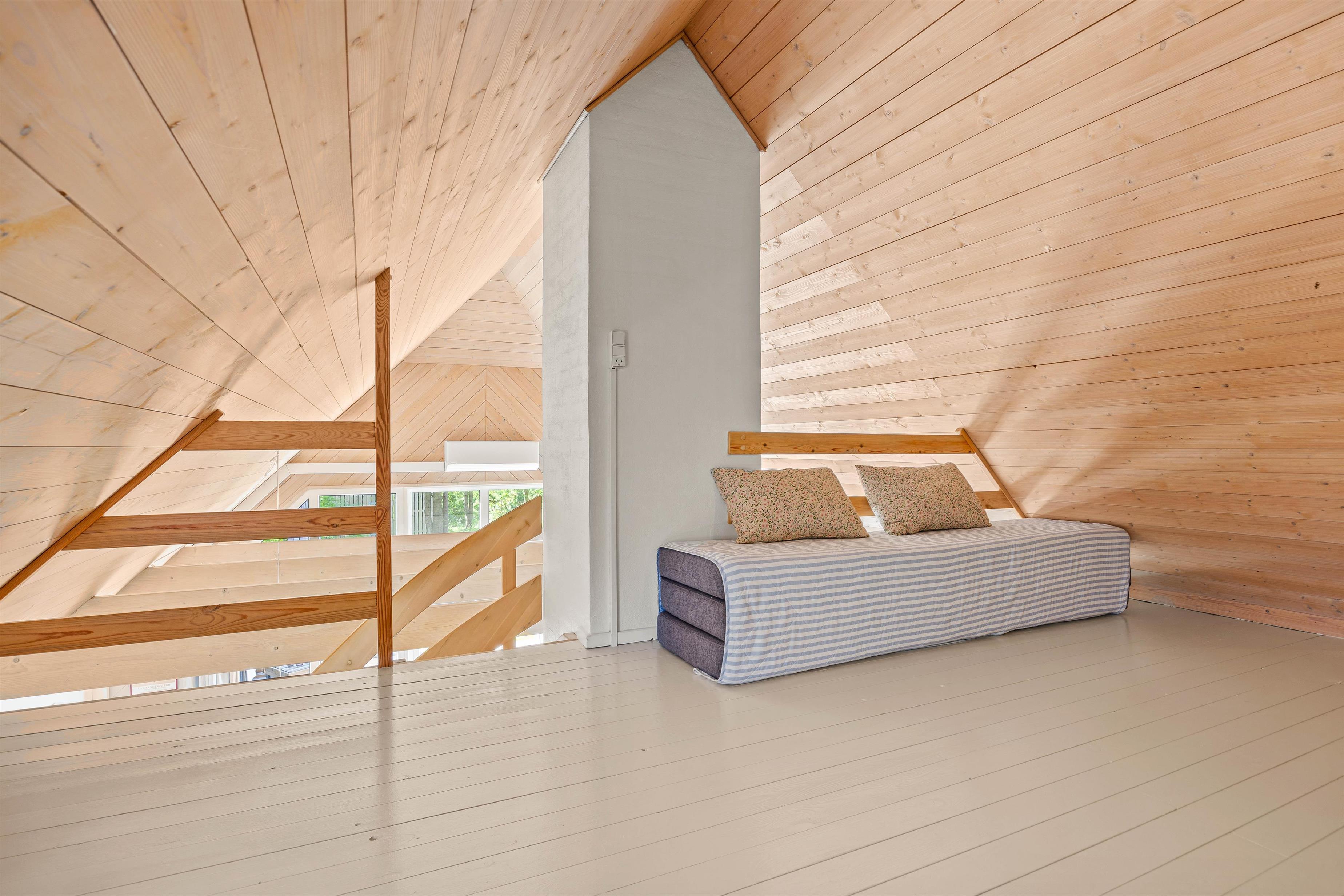 Sommerhuset har 4 soveværelser, hvoraf 3 af disse er med 180x200 cm senge, og det sidste værelse er indrettet med en 140x200 cm sovesofa. Ét af disse soveværelser er placeret på førstesalen. Her finder I også et ekstra opholdsrum, som kan blive en hyggelig krog for familiens yngste medlemmer.