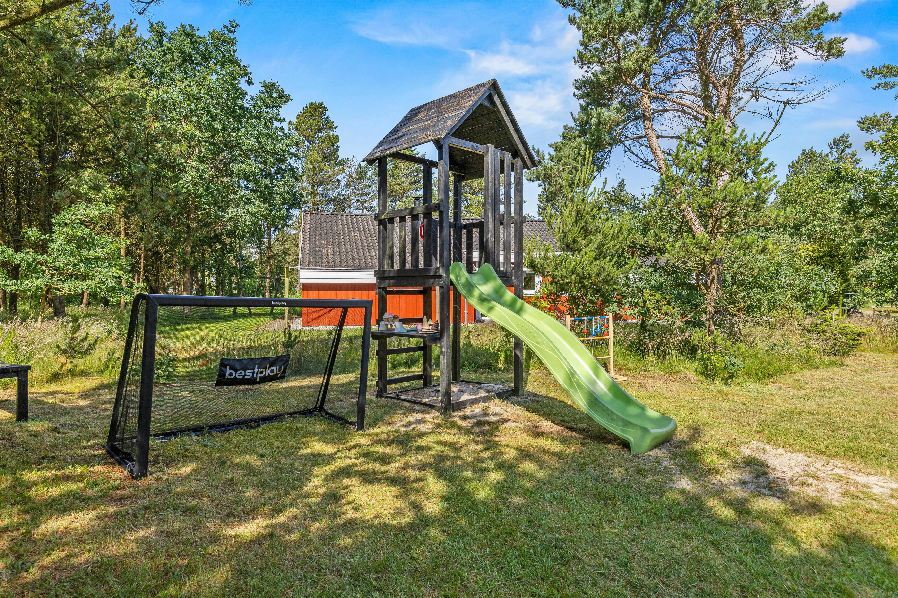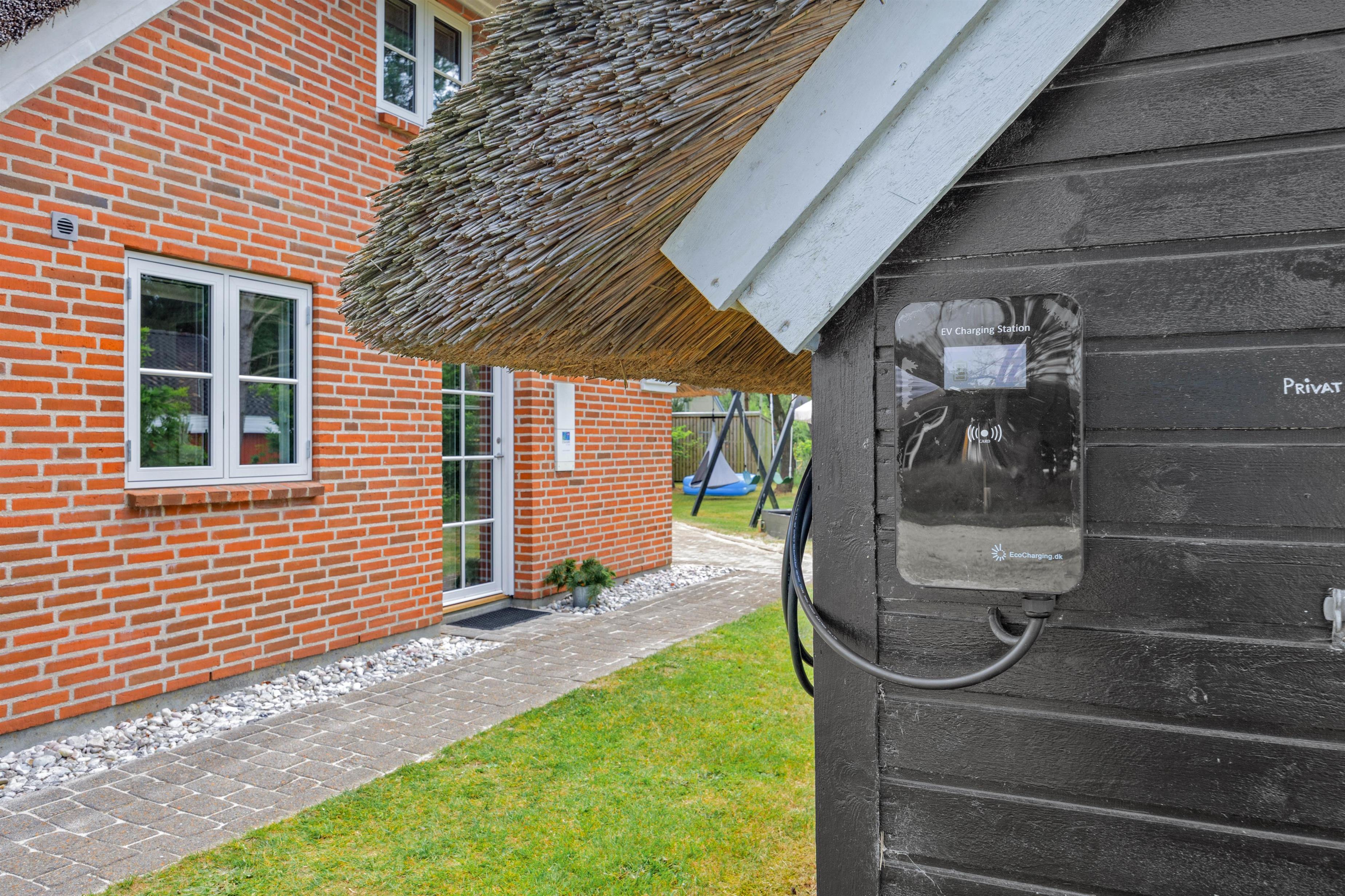 Herfra kan I træde ud på den store plænegrund, hvor børnene vil elske havemulighederne med sandkasse samt legetårn med rutsjebane og gynge. Grunden med grøn plæne giver masser af plads til leg og afslapning. Ved sommerhuset er der desuden et ladestik til el-bil, så I roligt kan slappe af, mens bilen lader op til næste eventyr.