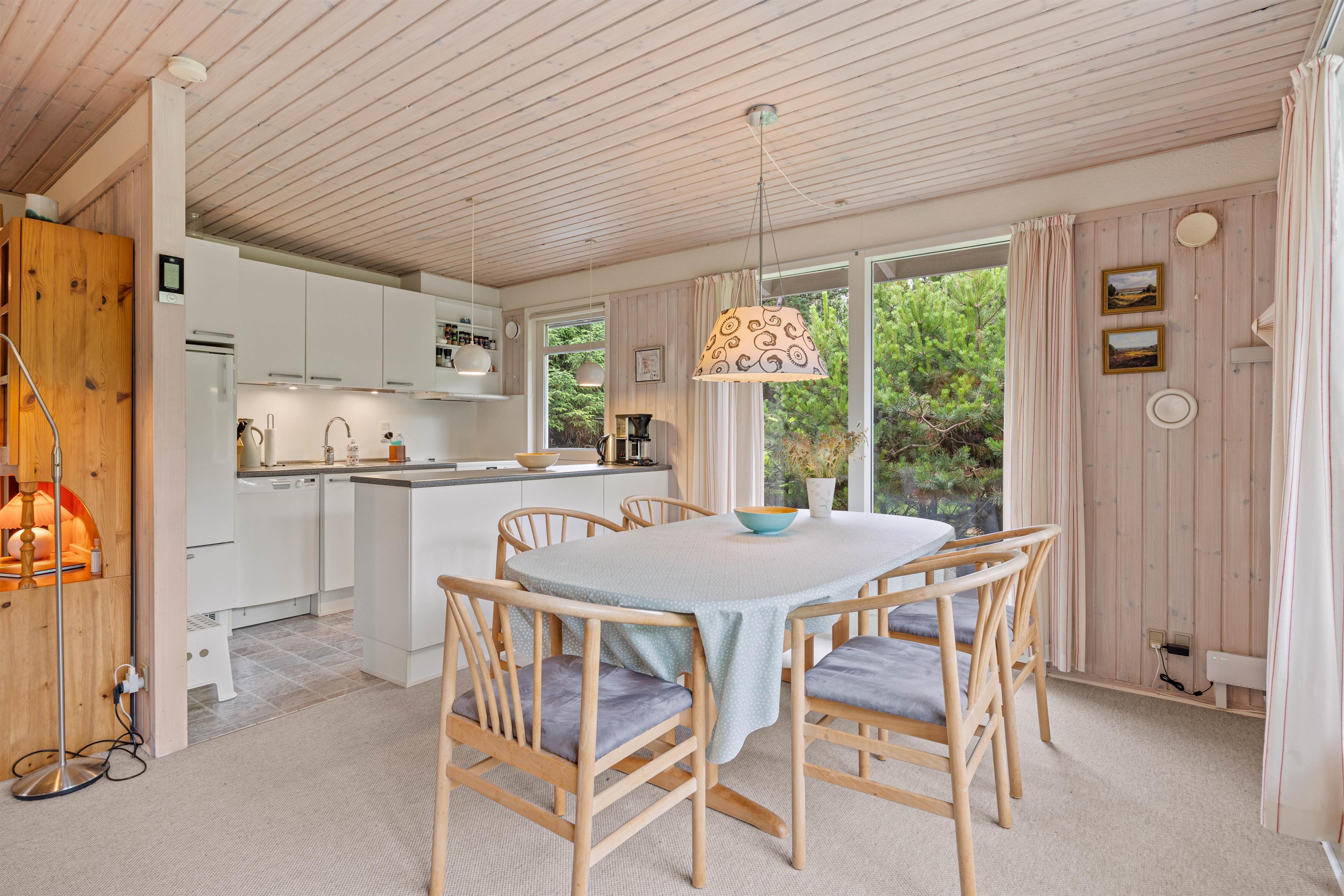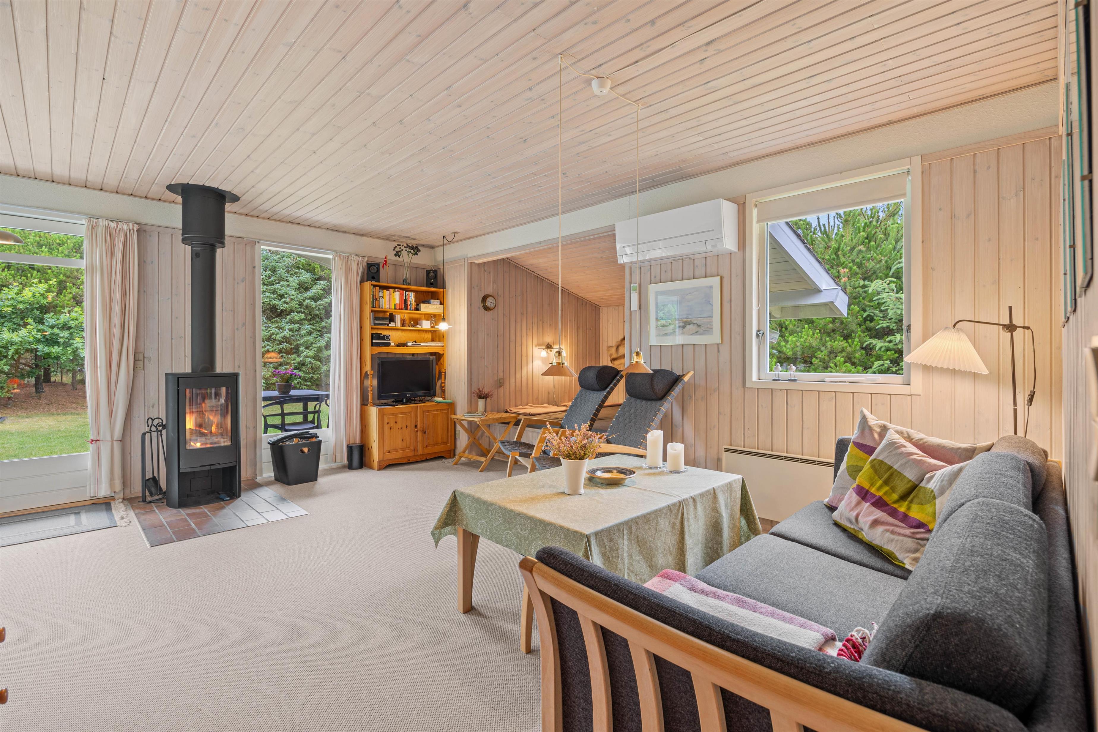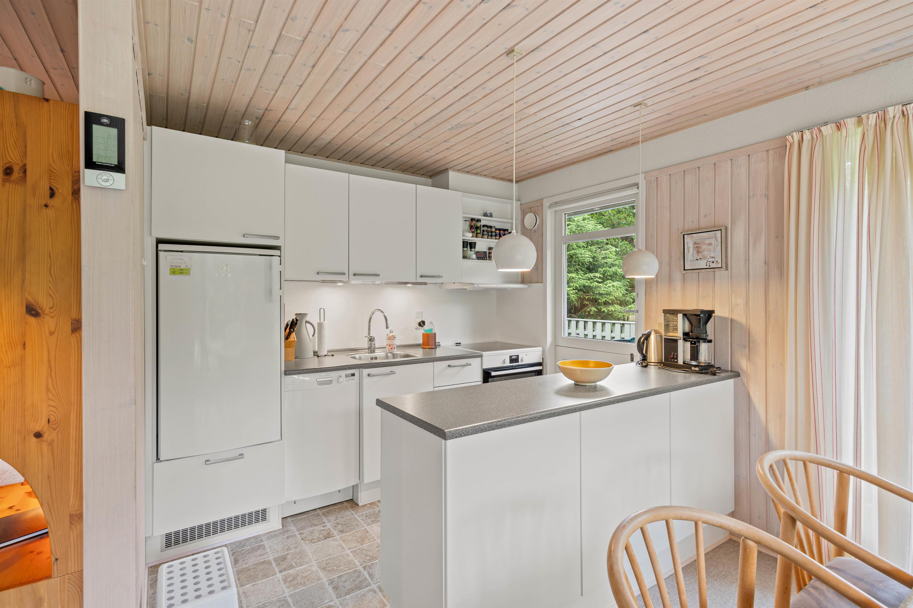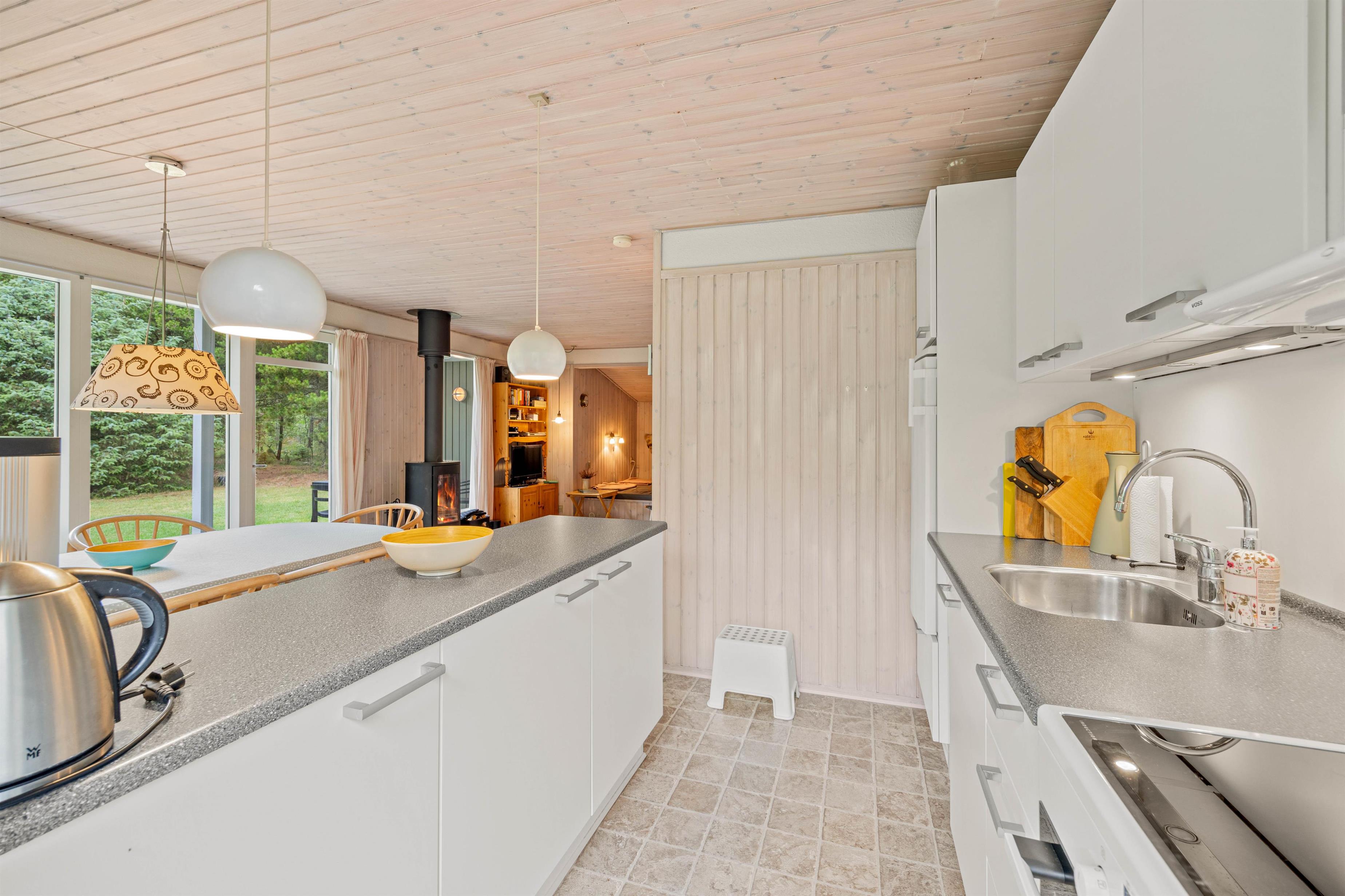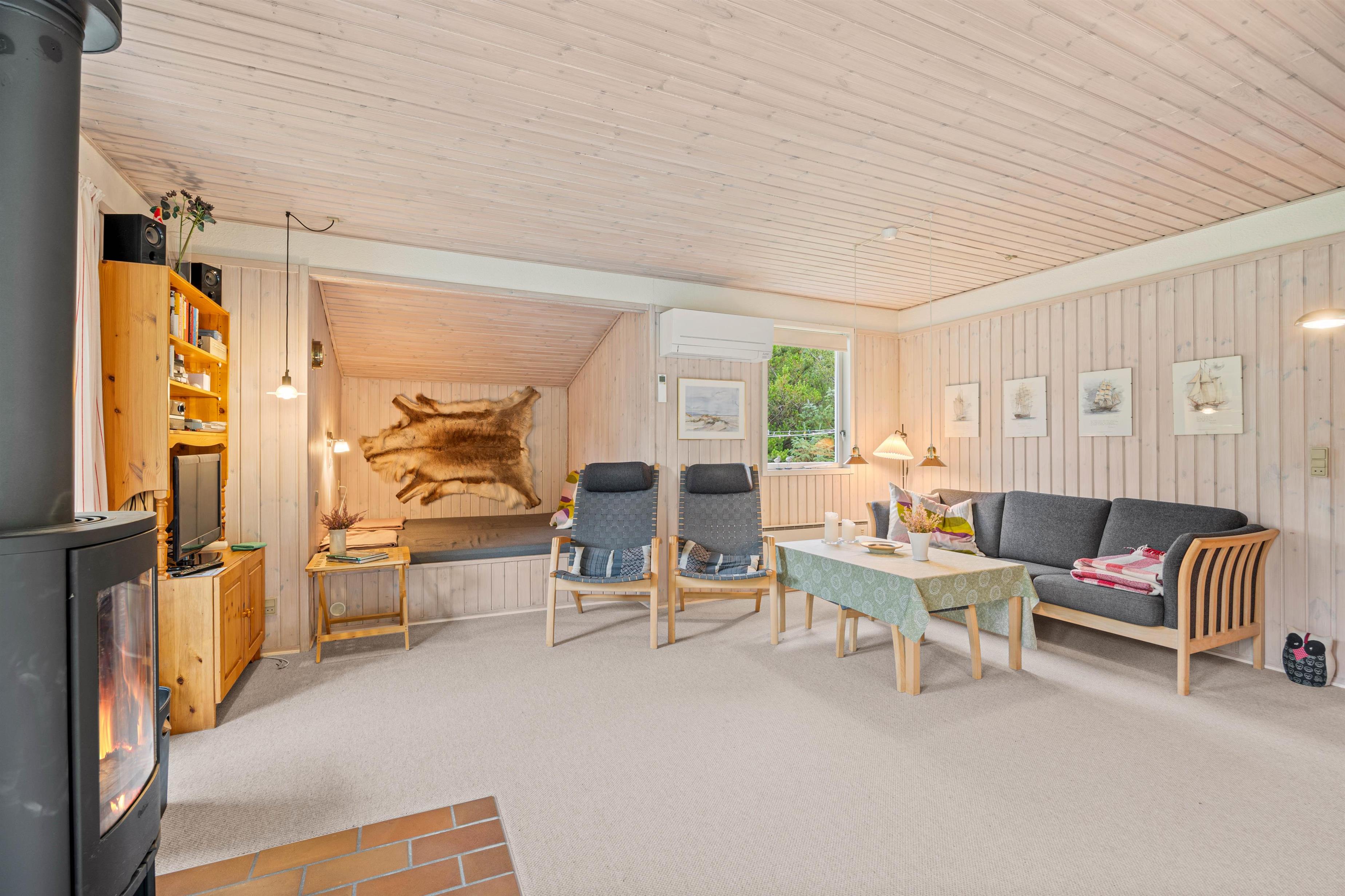 Den hjemlige indretning gør, at I hurtigt vil falde til på den nye ferieadresse, og også indenfor er der sørget for hyggen. Den åbne køkken- og spisestueafdeling er både udstyret med brændeovn og en lille alkove, som også fungerer som seng, hvor der kan slappes af, og børnene kan lege.