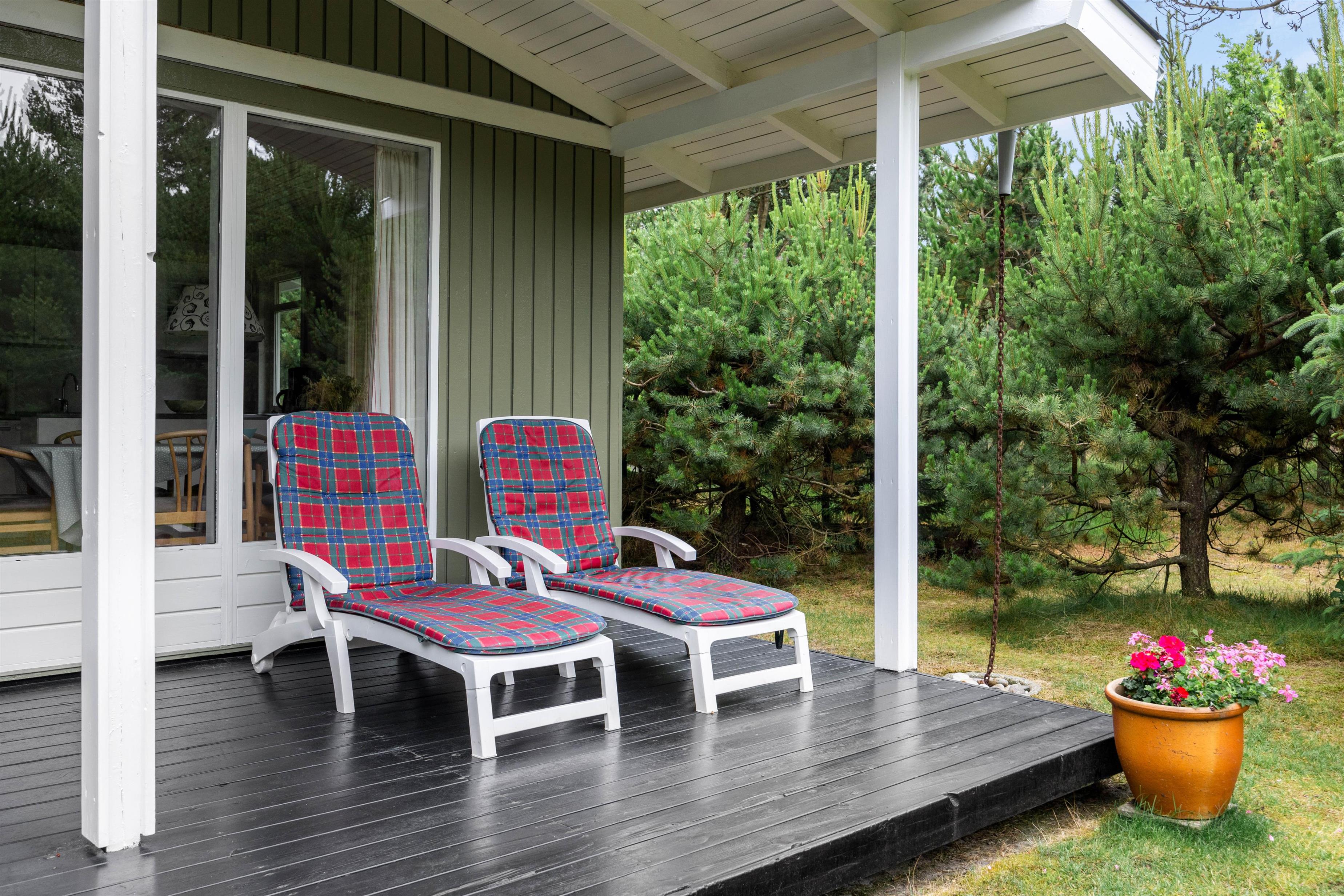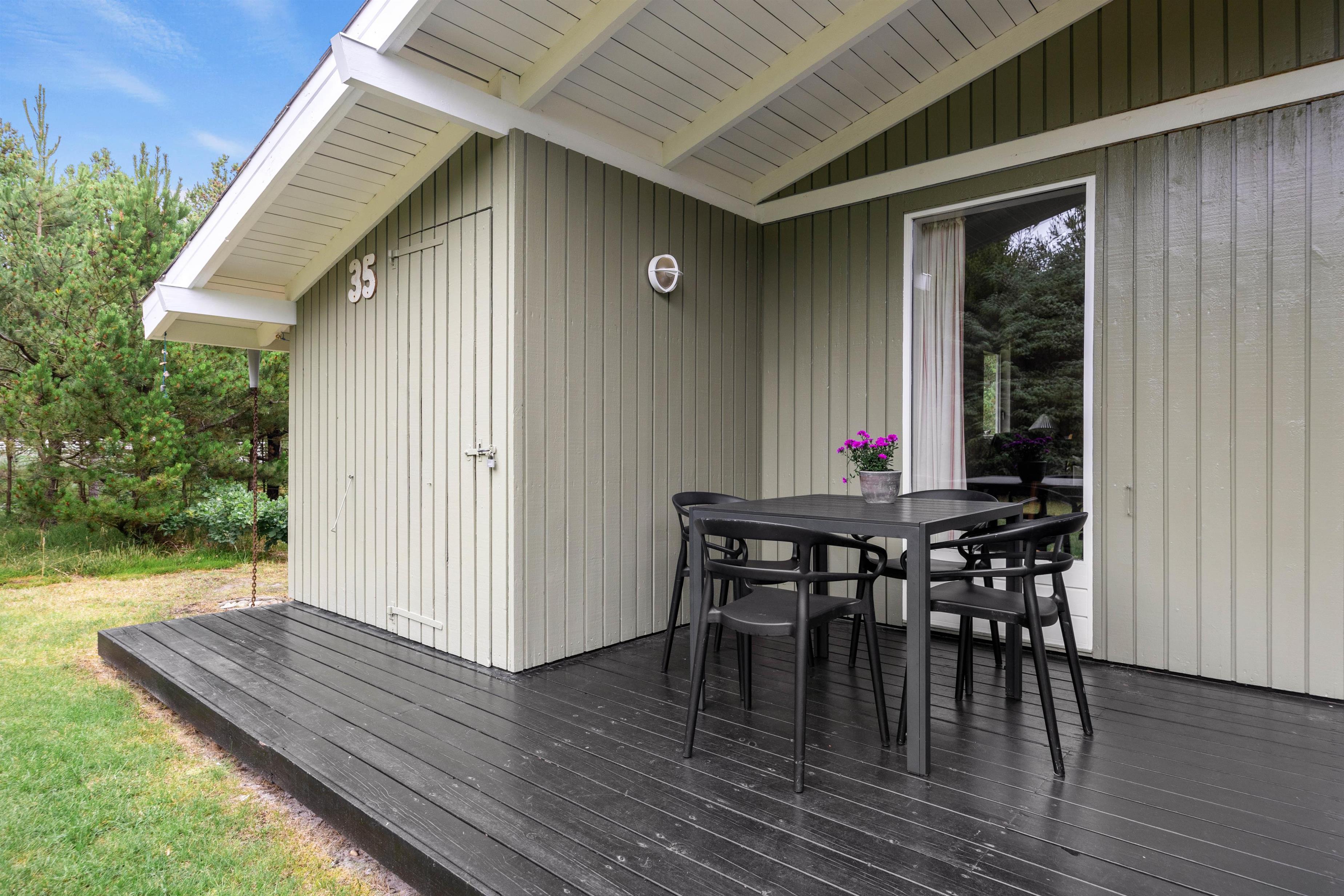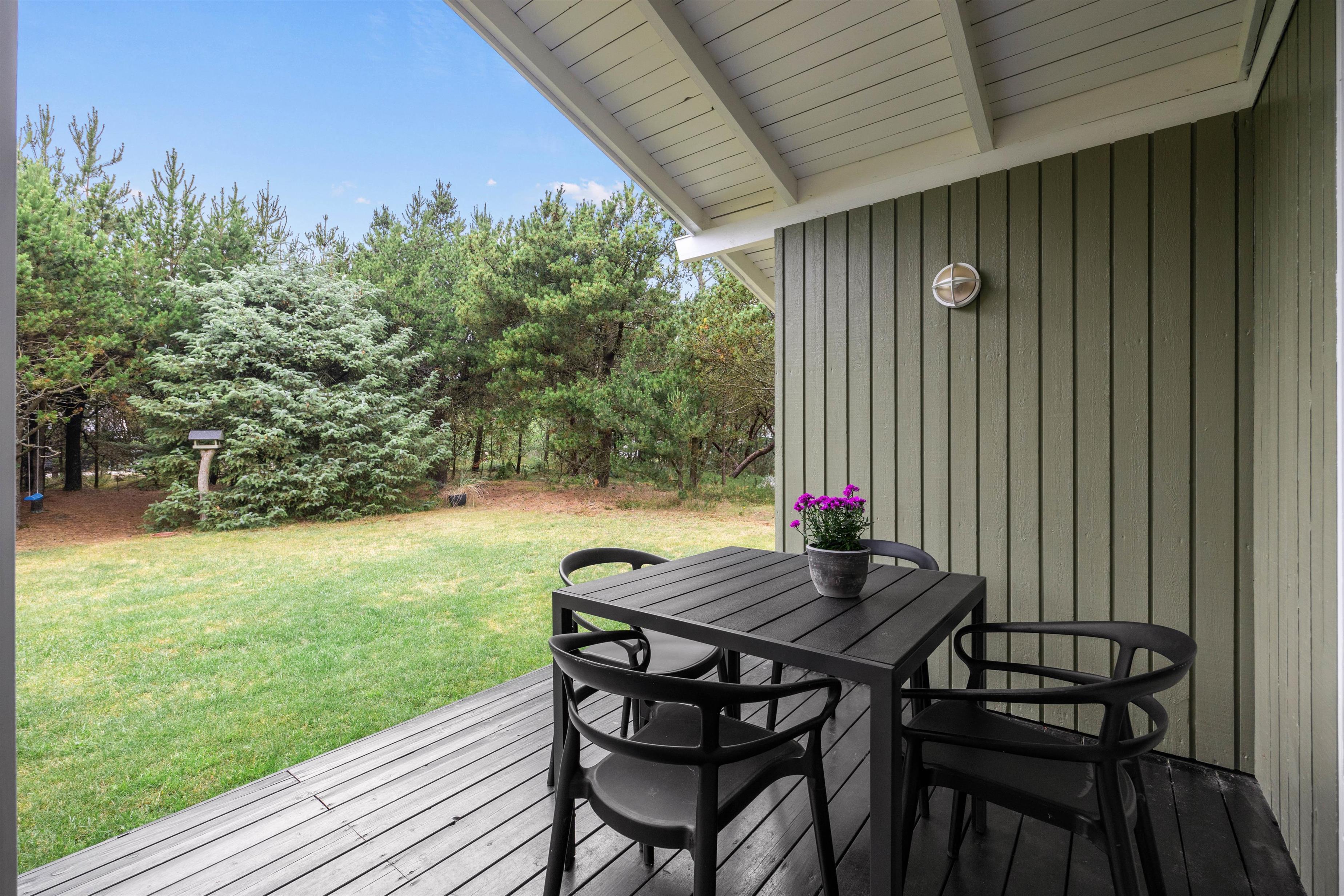 Så snart I kører op i indkørslen på Peder Larsensvej 35, vil I mærke, hvordan feriestemningen sænker sig over jer. De mange træer, der indkranser naturgrunden, giver jer masser af fred og ro, og her kan I helt ugeneret sole jer i havemøblerne eller spise en god frokost i solen.
