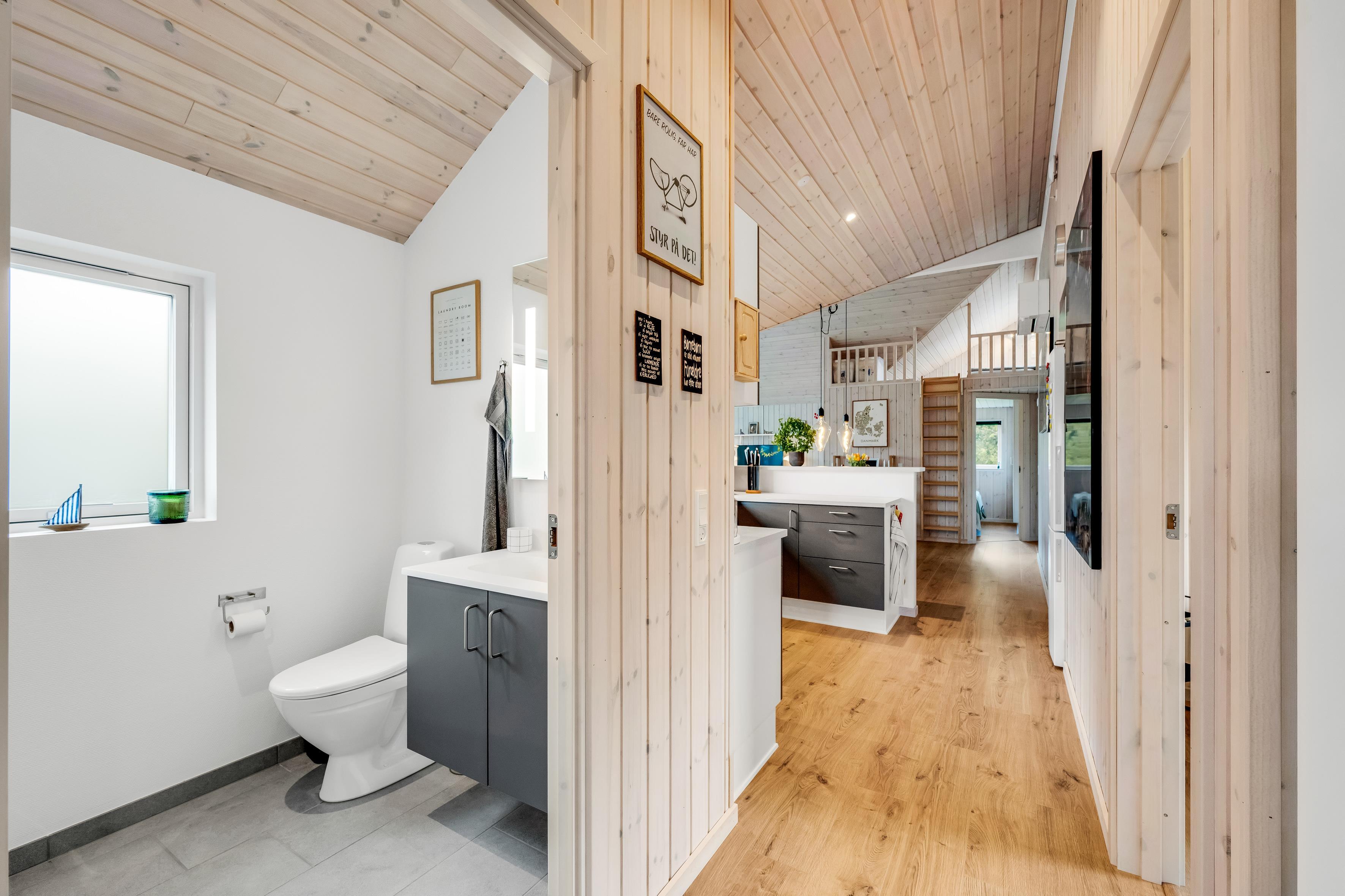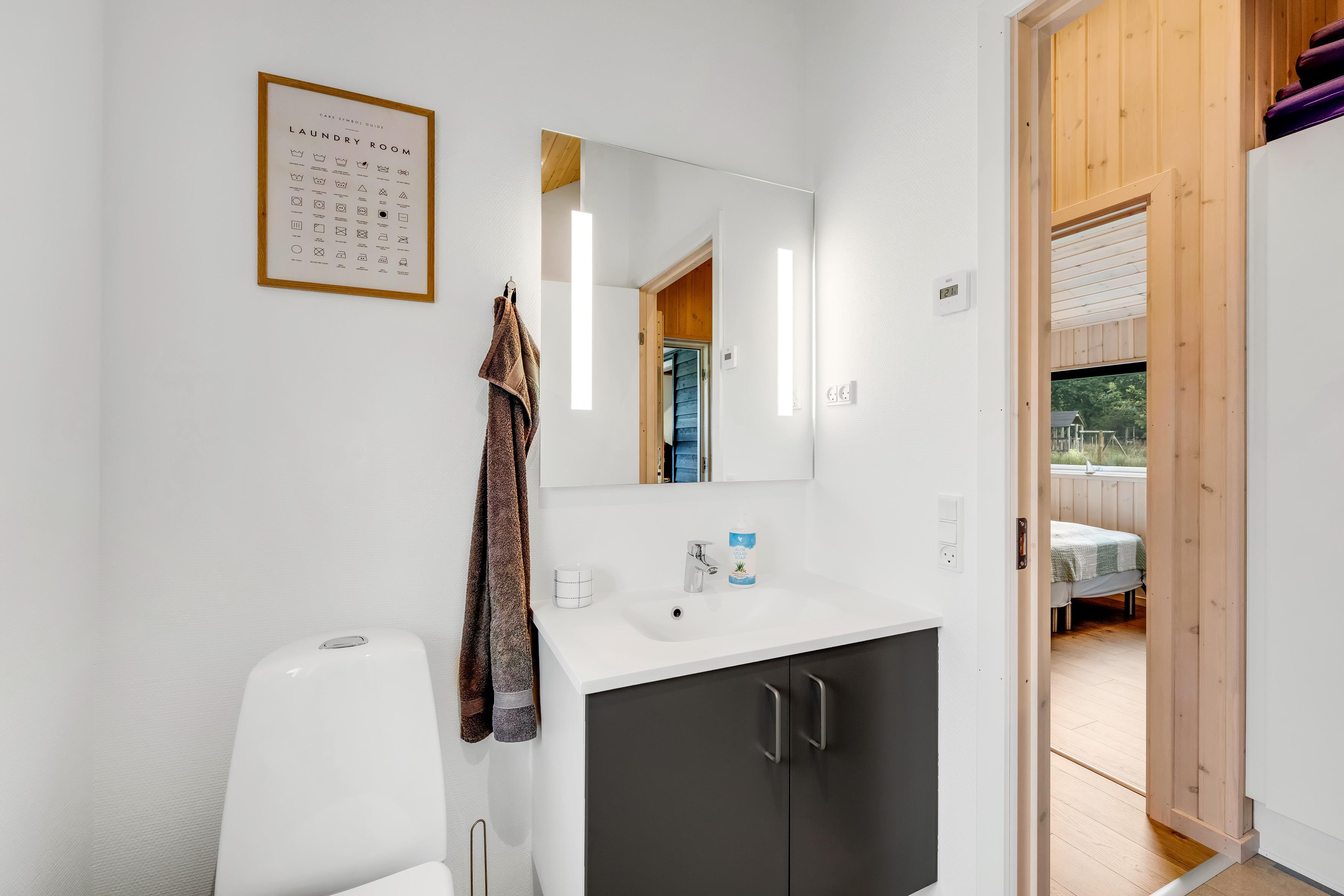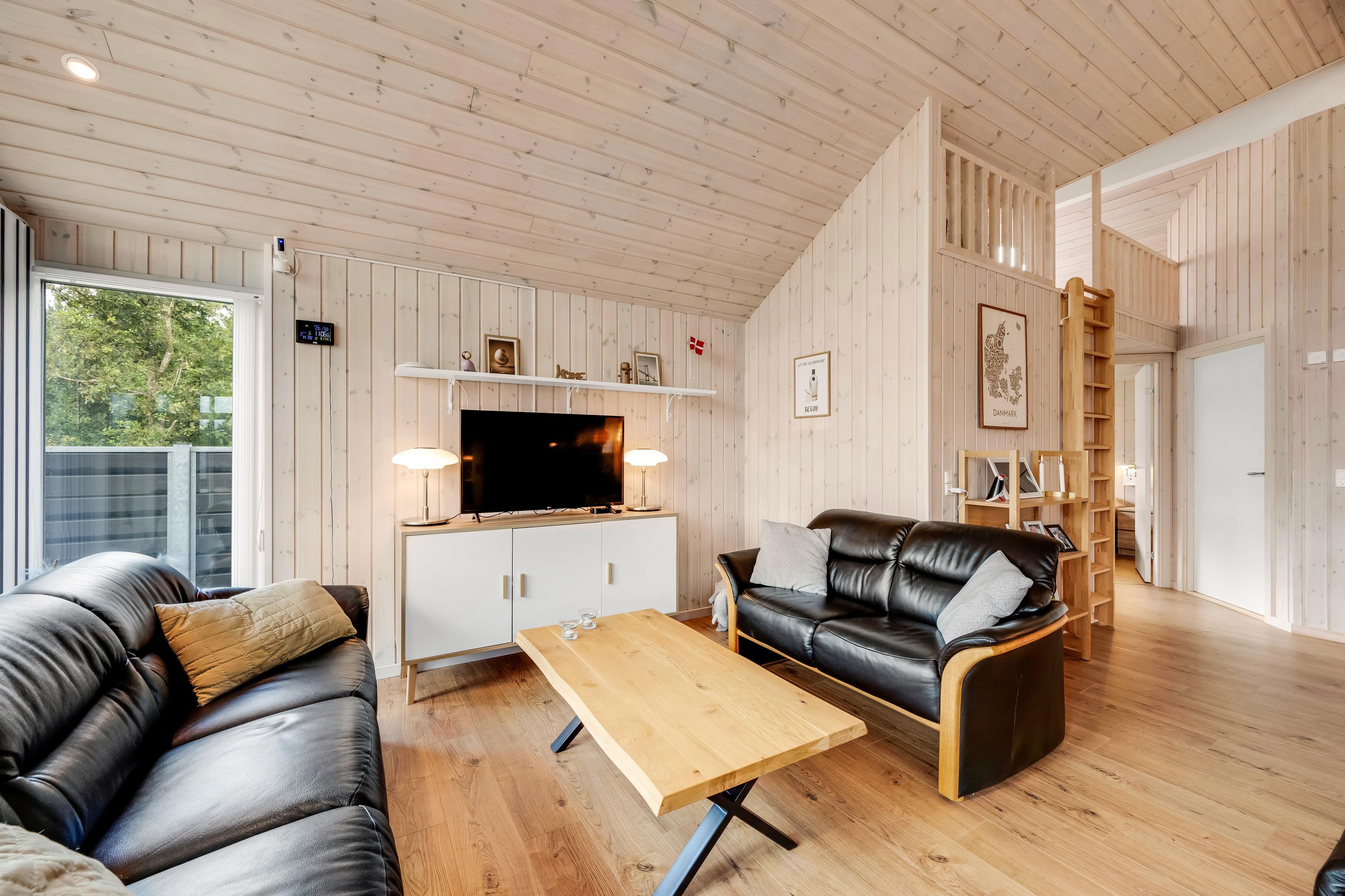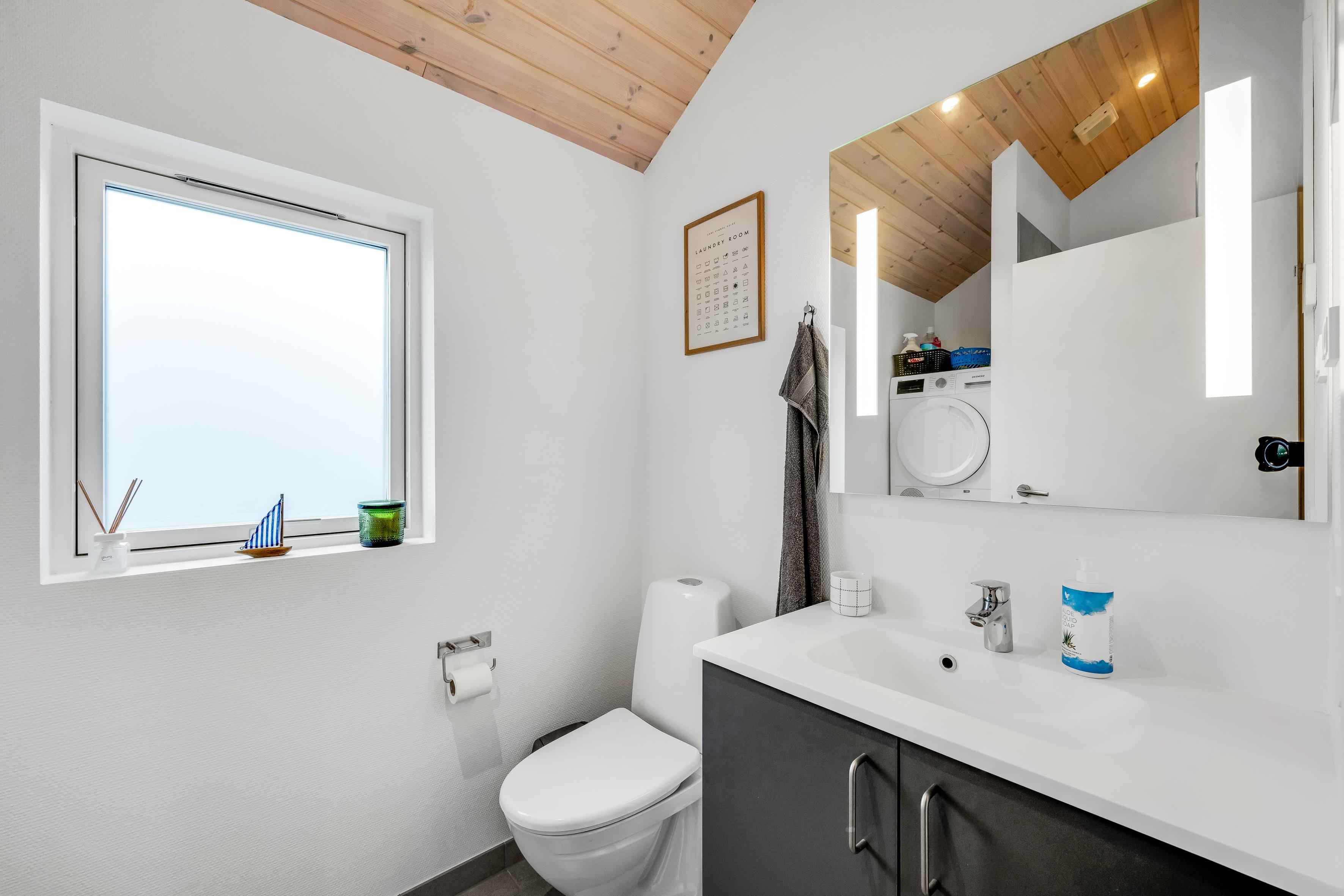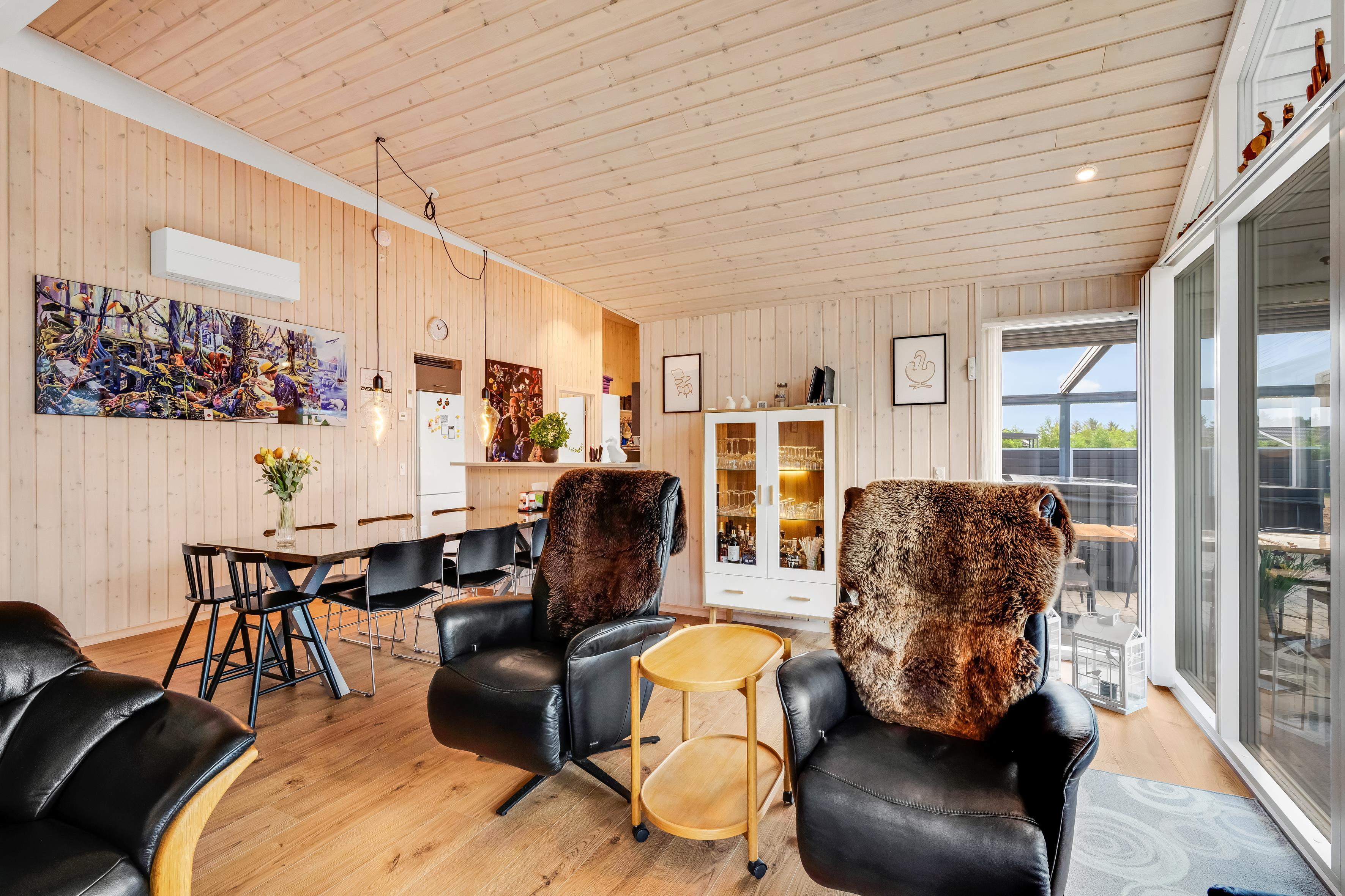 Indenfor i dette lyse og indbydende sommerhus finder I et rummeligt opholdsrum med tv og komfortable siddepladser, der skaber en hyggelig atmosfære. Den energibesparende varmepumpe i kombination med solcelleanlægget sørger for både varmt vand og behagelig varme i hele huset. Et ekstra plus er gulvvarmen, som giver jer dejlig varme i alle rum.