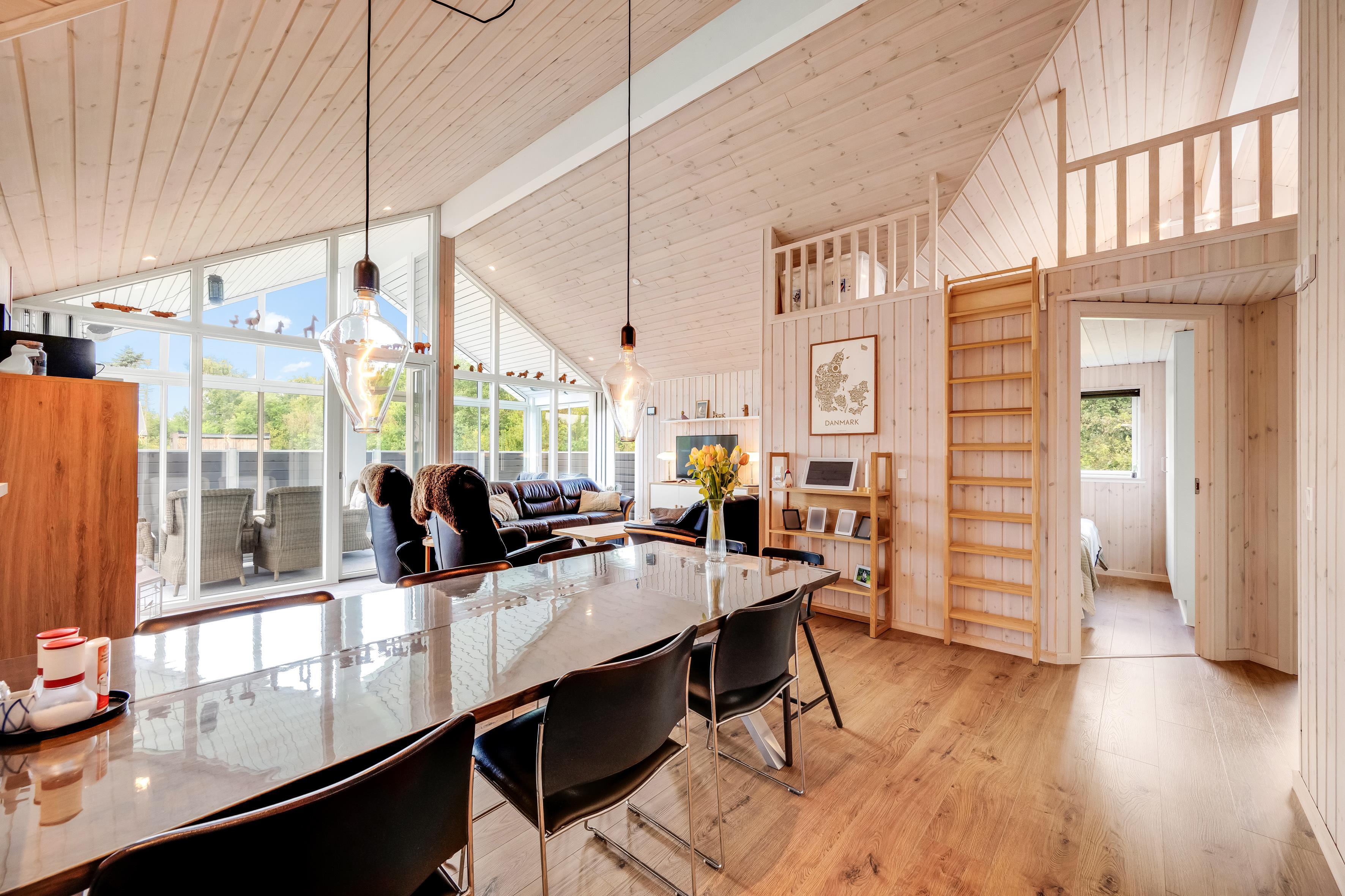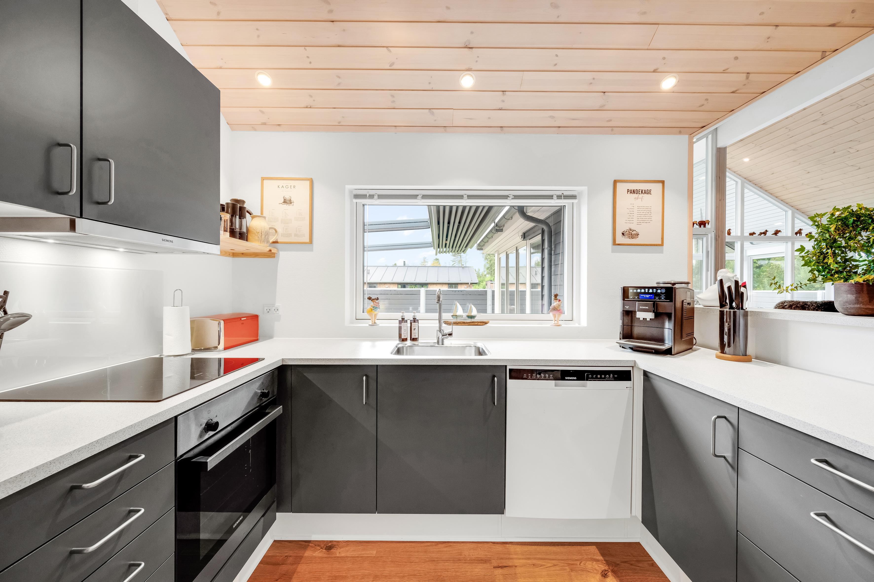 Det åbne køkken er veludstyret med induktionskogeplade, opvaskemaskine, mikrobølgeovn samt køleskab med 70 liters frysekapacitet. Her kan I nyde hyggelige madlavningsaftener og tilberede lækre måltider.