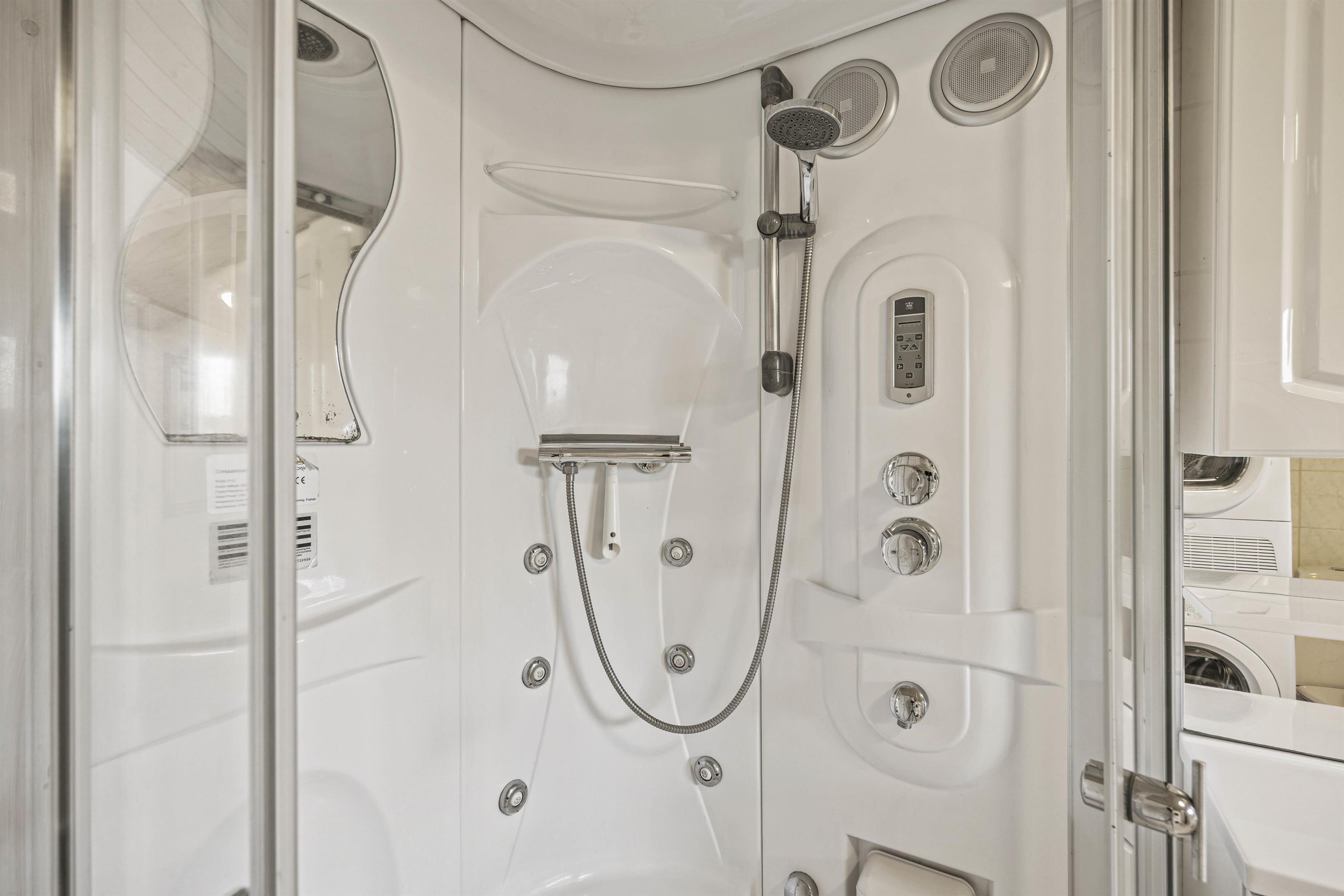 På badeværelset er der både vaskemaskine, tørretumbler, boblebad, sauna og en bruser.