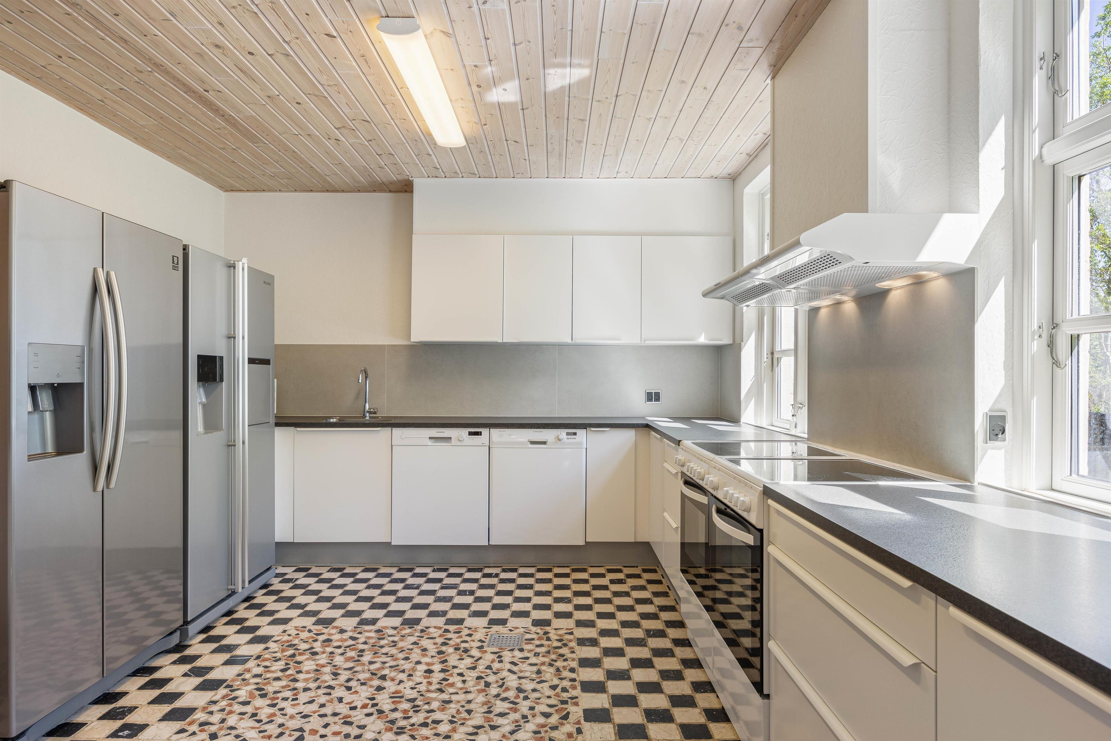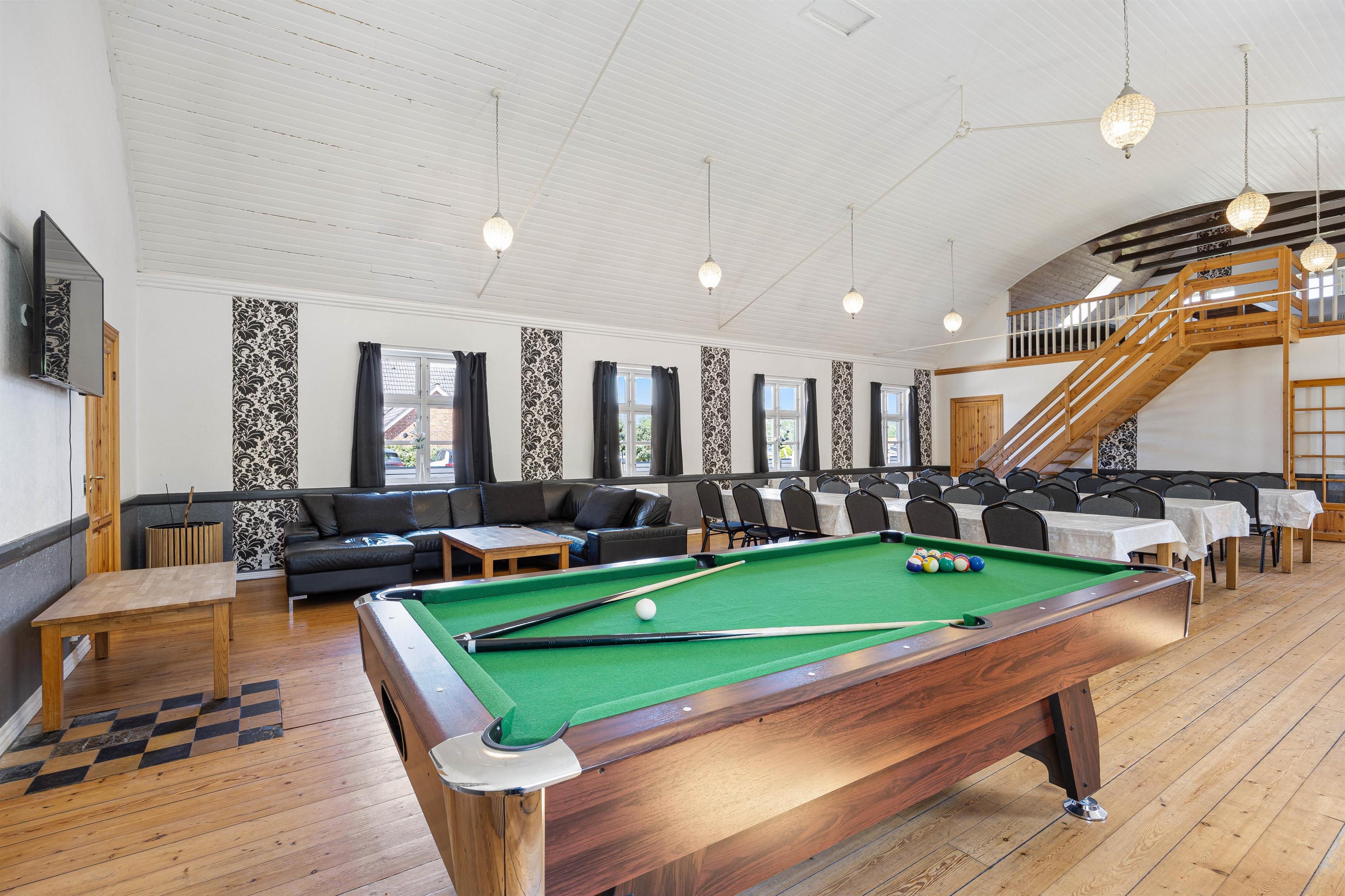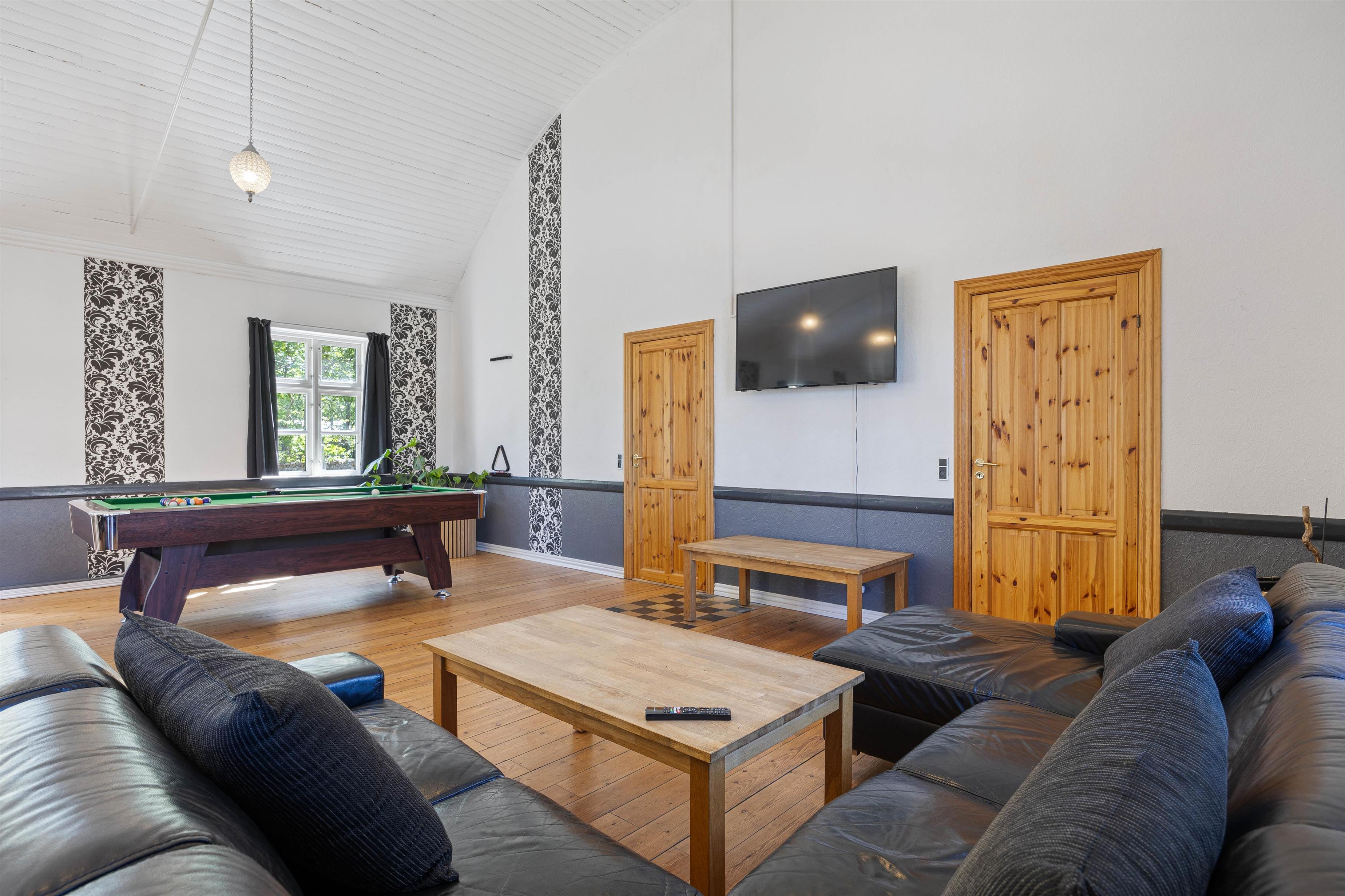 Sommerhuset byder på en lys indretning, hvor der er plads til hele familien. Det store køkken, som er perfekt til fælles madlavning, har kapacitet til at tilberede måltider for hele selskabet. Den rummelige spisestue har siddepladser til alle gæster, samt en hyggelig sofakrog, hvor flere kan samles – måske over et spil kort. Derudover er der et poolbord, airhockey og bordfodbold i rummet, så I kan få gang i en sjov turnering.