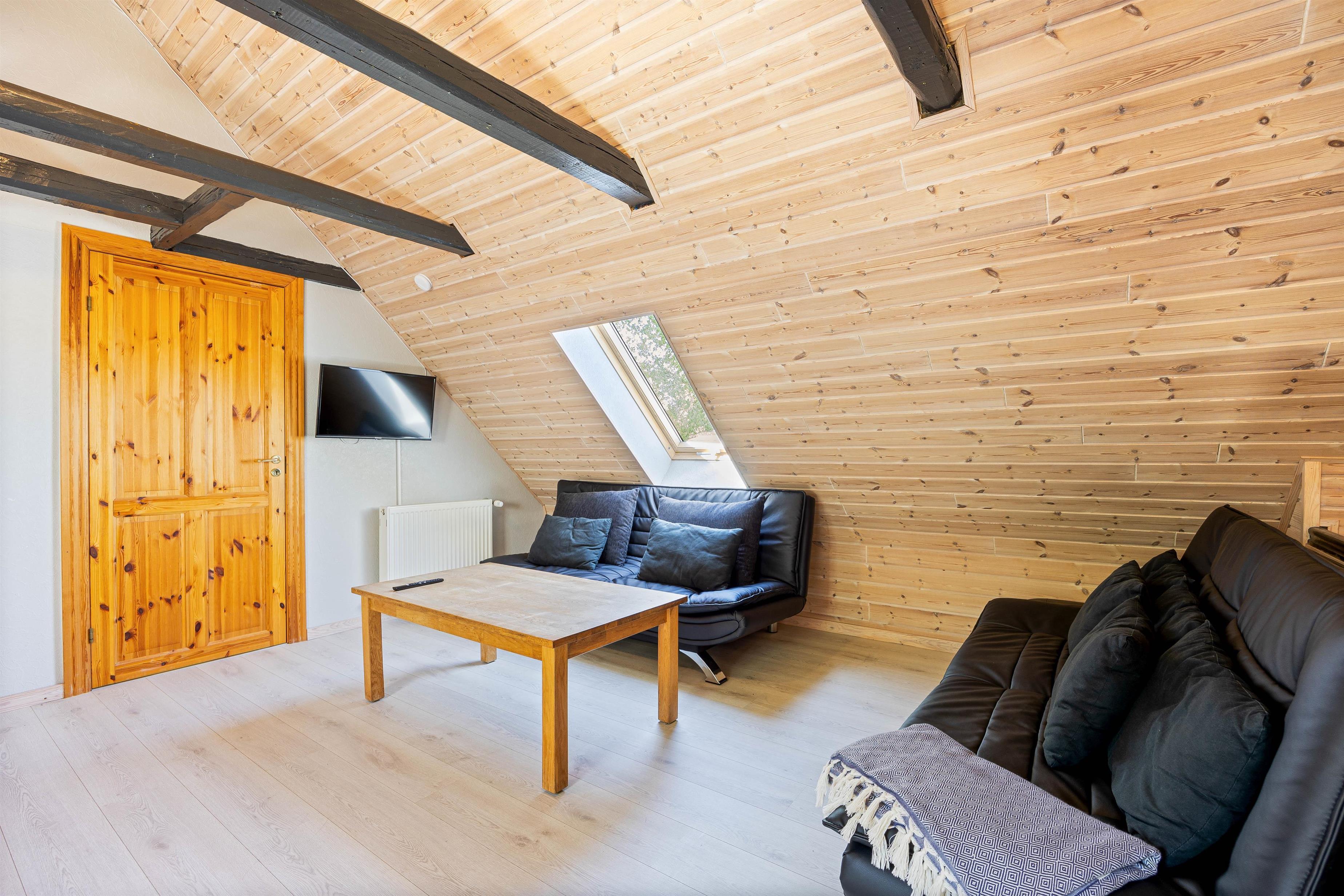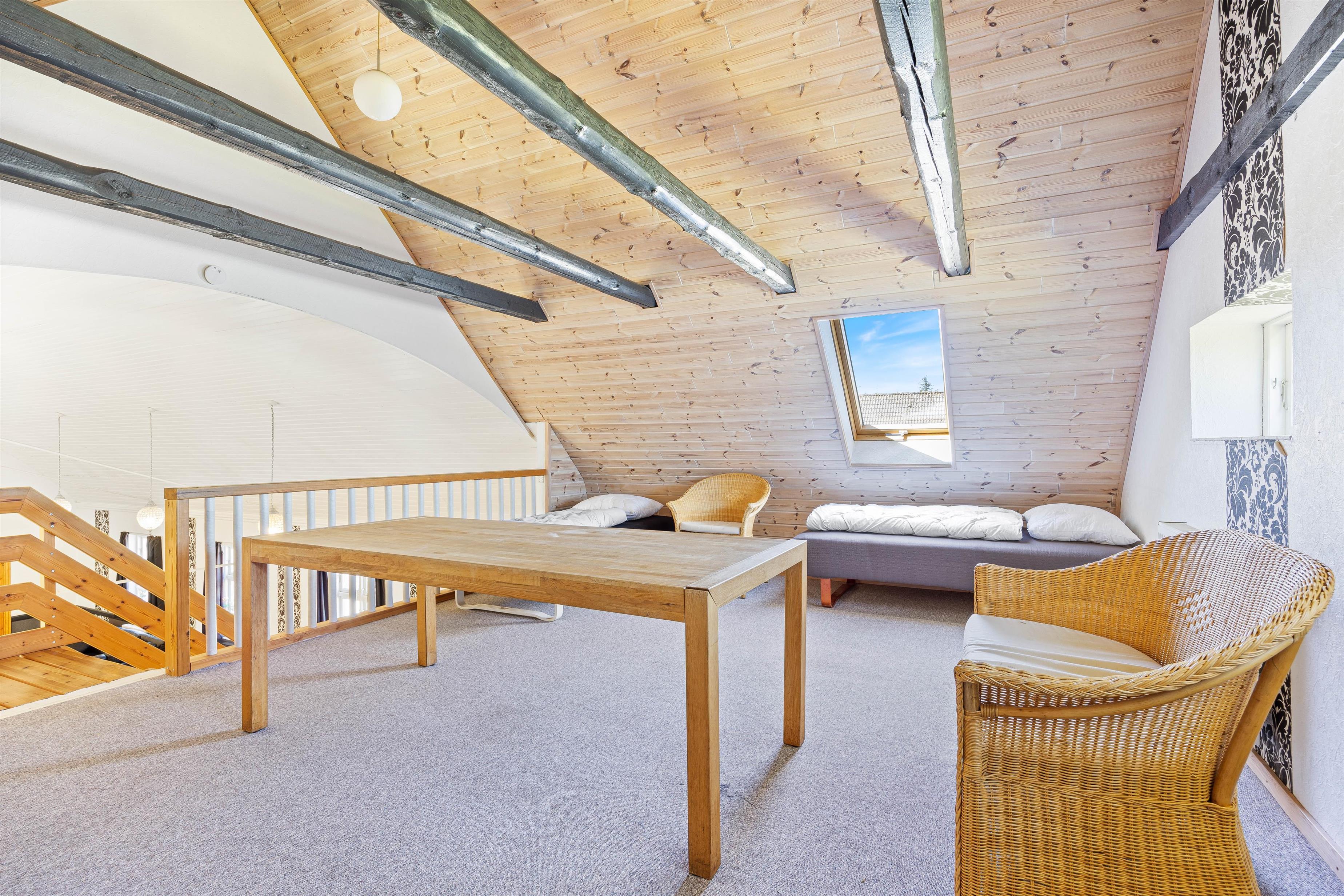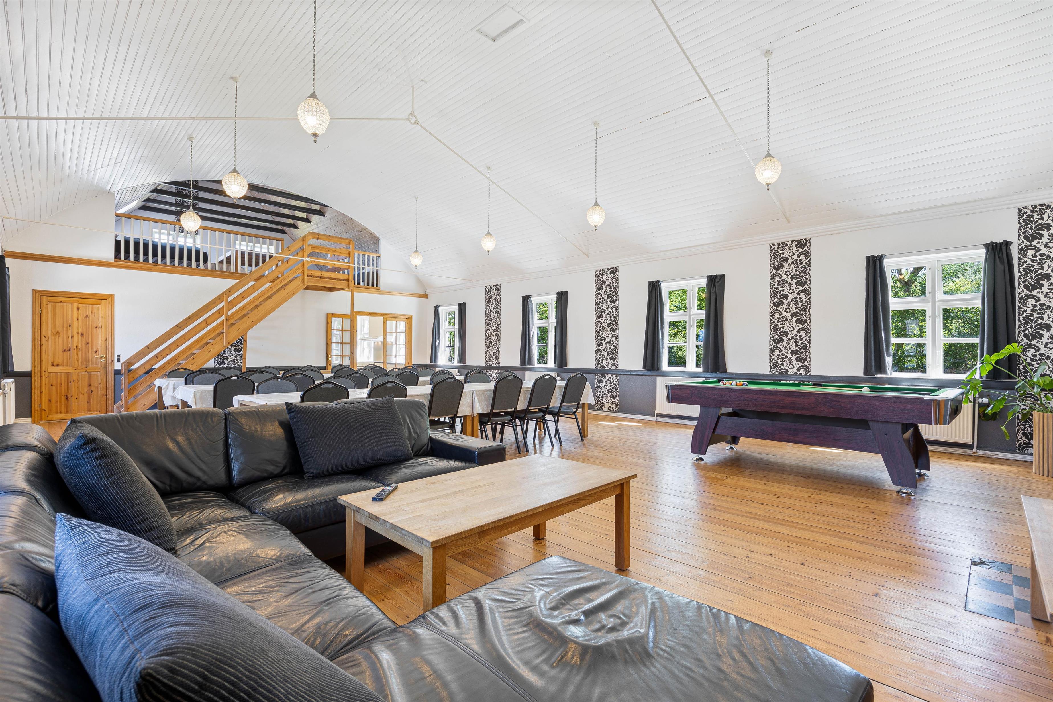 Herfra kan I træde op på førstesalen, hvor en ekstra stue venter jer. Denne stue er udstyret med både et air-hockey og et bordfodbold-bord, så I kan tage en kamp eller to og se, hvem der bliver gruppens mester. På de to etager finder I 7 værelser med varieret sengefordeling, samt flere sovepladser på feriehusets hems.