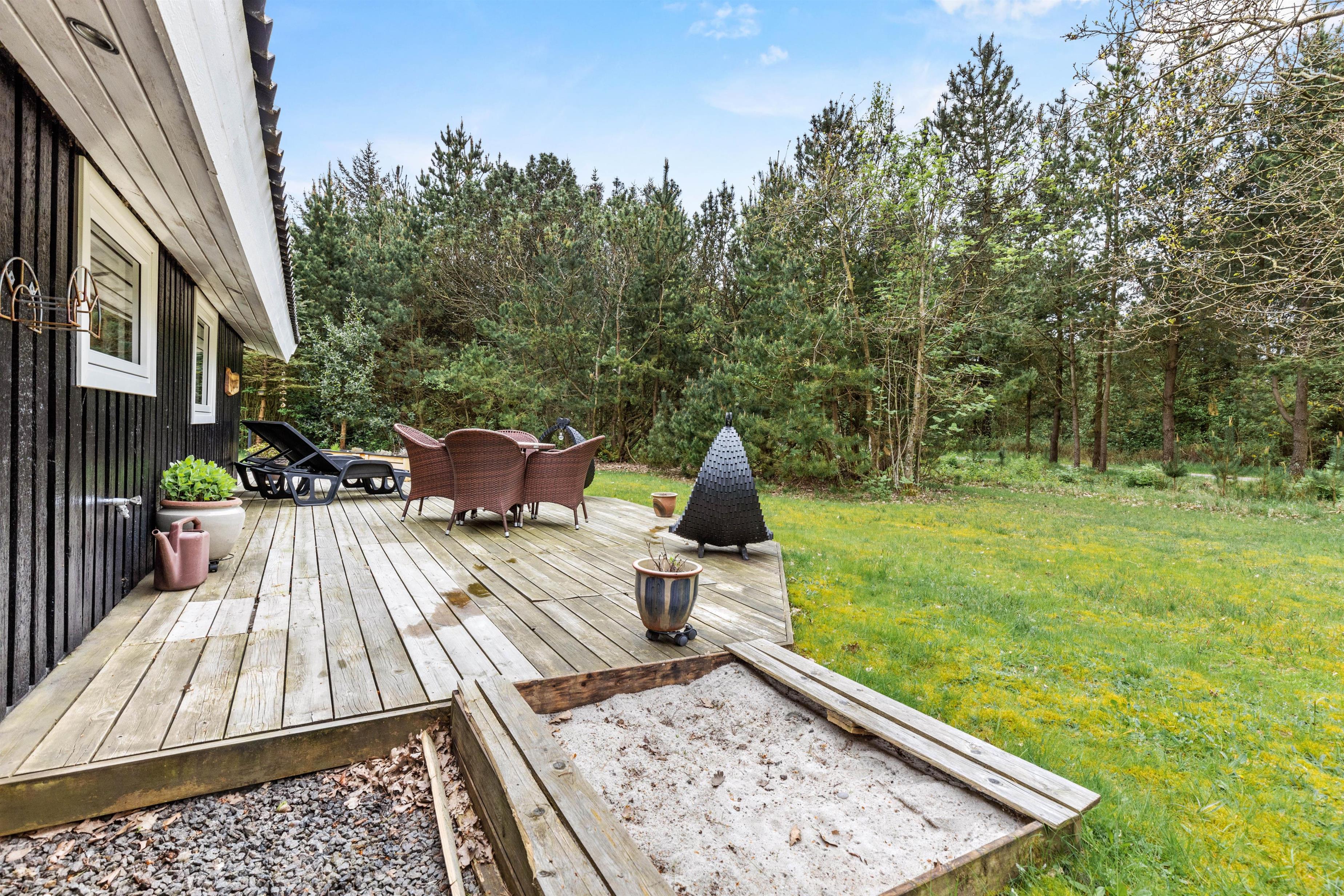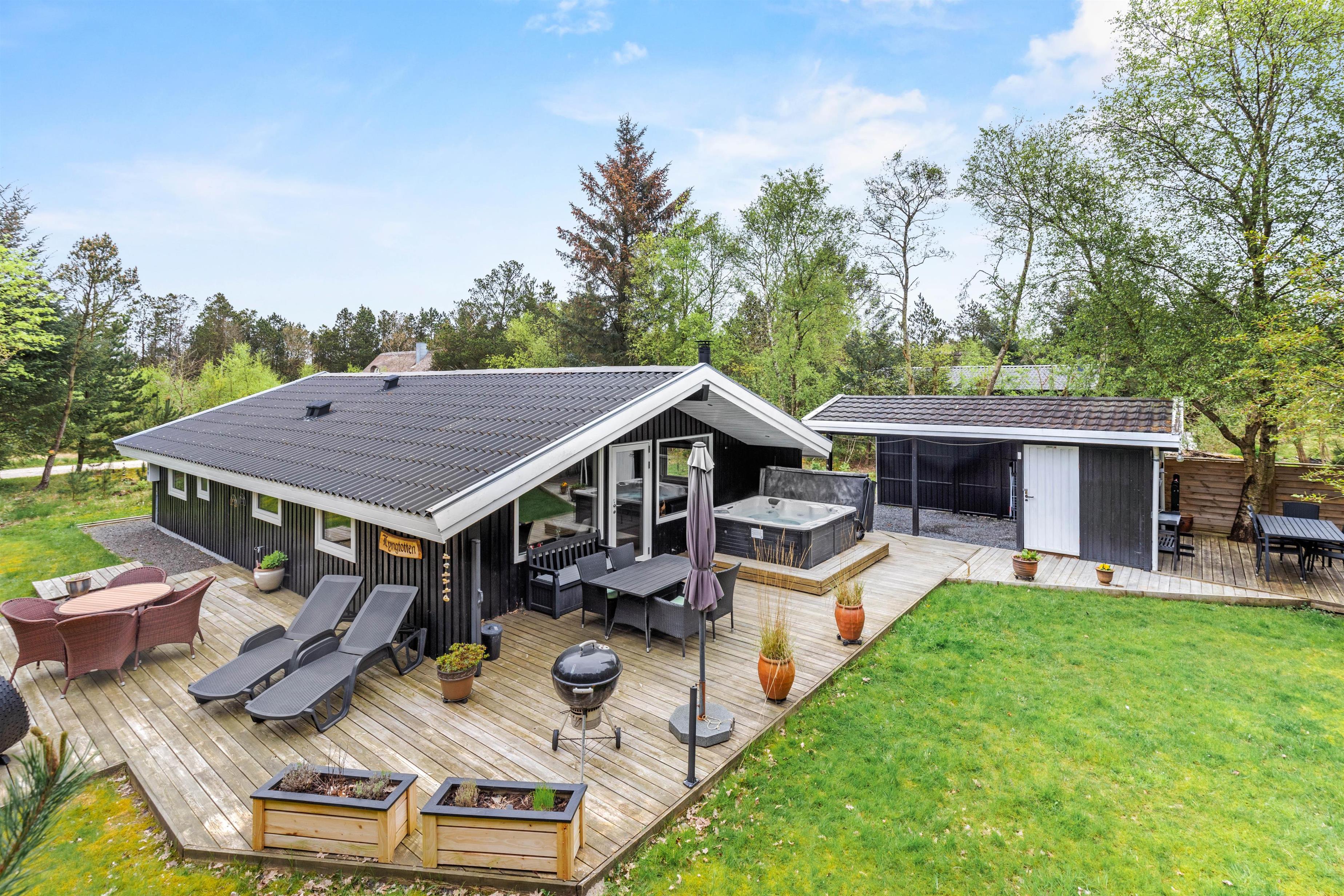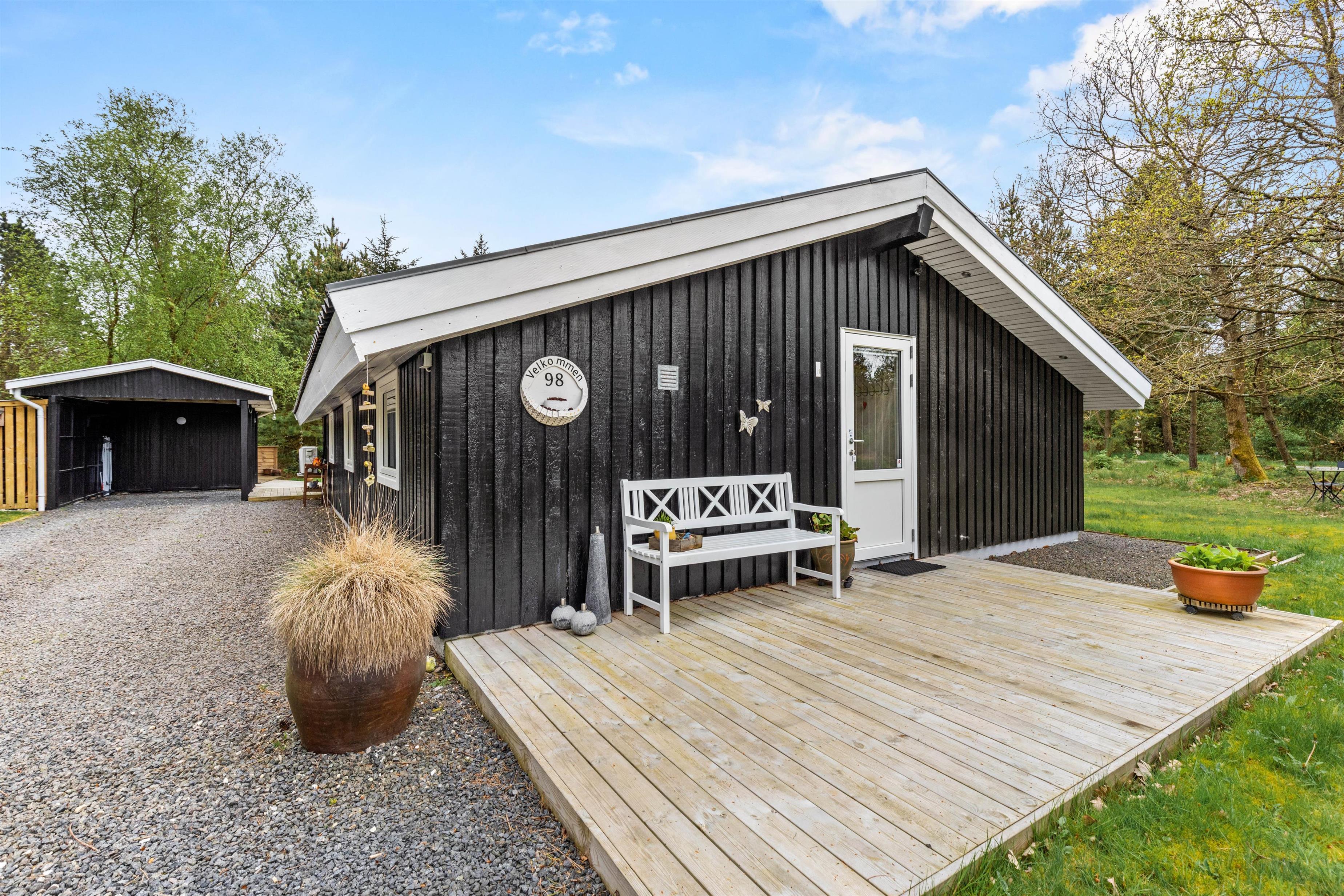 Jeppesvej 98 har en dejlig terrasse og udeområde med masser af lækroge og et overdækket areal. Områdets og randbeplantningens træer giver ro og hygge, så man rigtigt kan slappe af. Børnene vil sikkert elske, at der både er sandkasse og gynger på grunden og de voksne kan udnytte chancen for et romantisk boblebad under stjernerne eller i solskinsvejr med fuglefløjt i den udendørs spa
