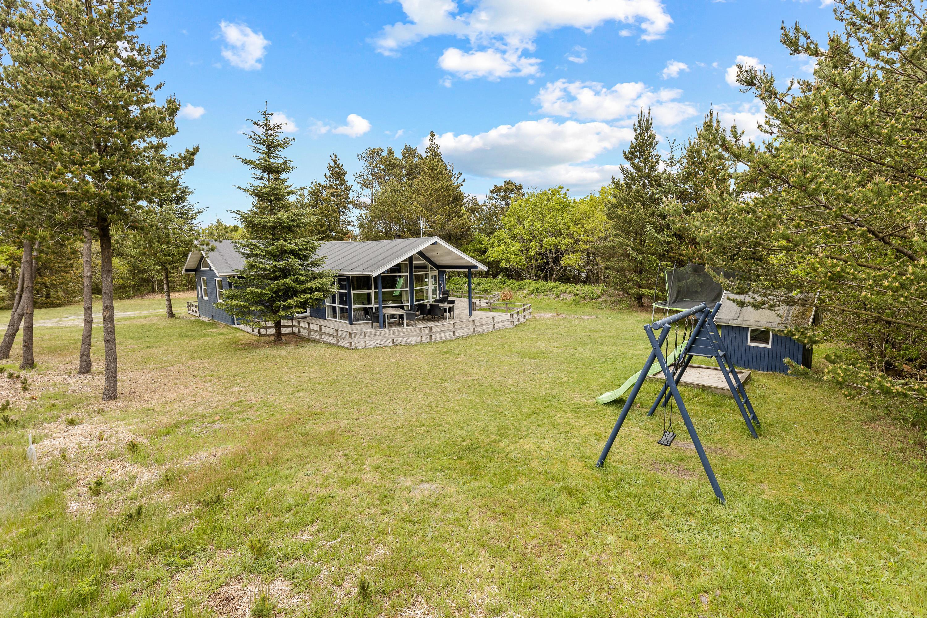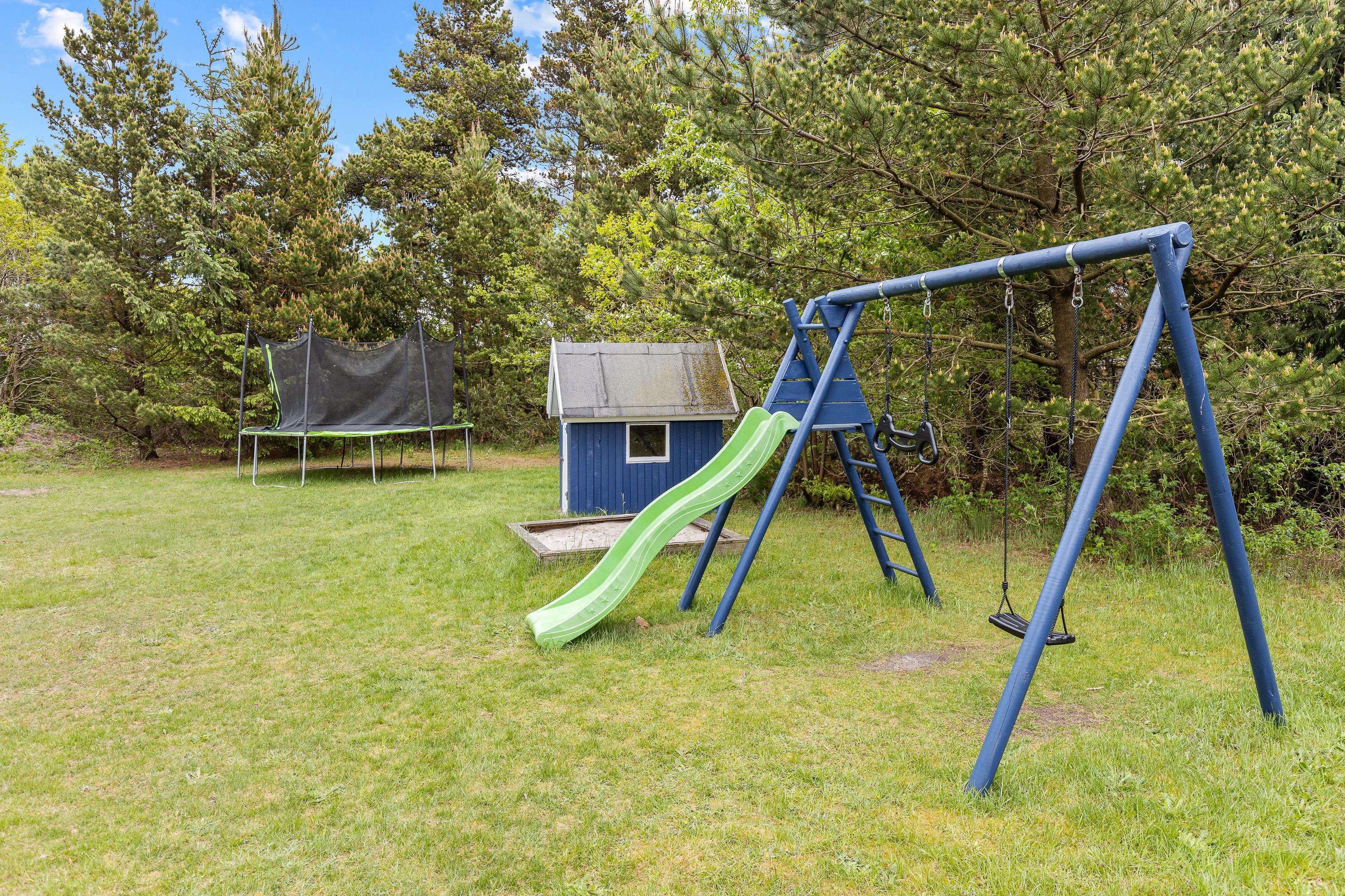 Haven er en herlig legeplads til børnene med både gynger, sandkasse, legehus og trampolin fra april til oktober. Her kan de hurtigt få tiden til at gå, mens I laver aftensmad i køkkenet eller udenfor på grillen på de lune sommeraftener.